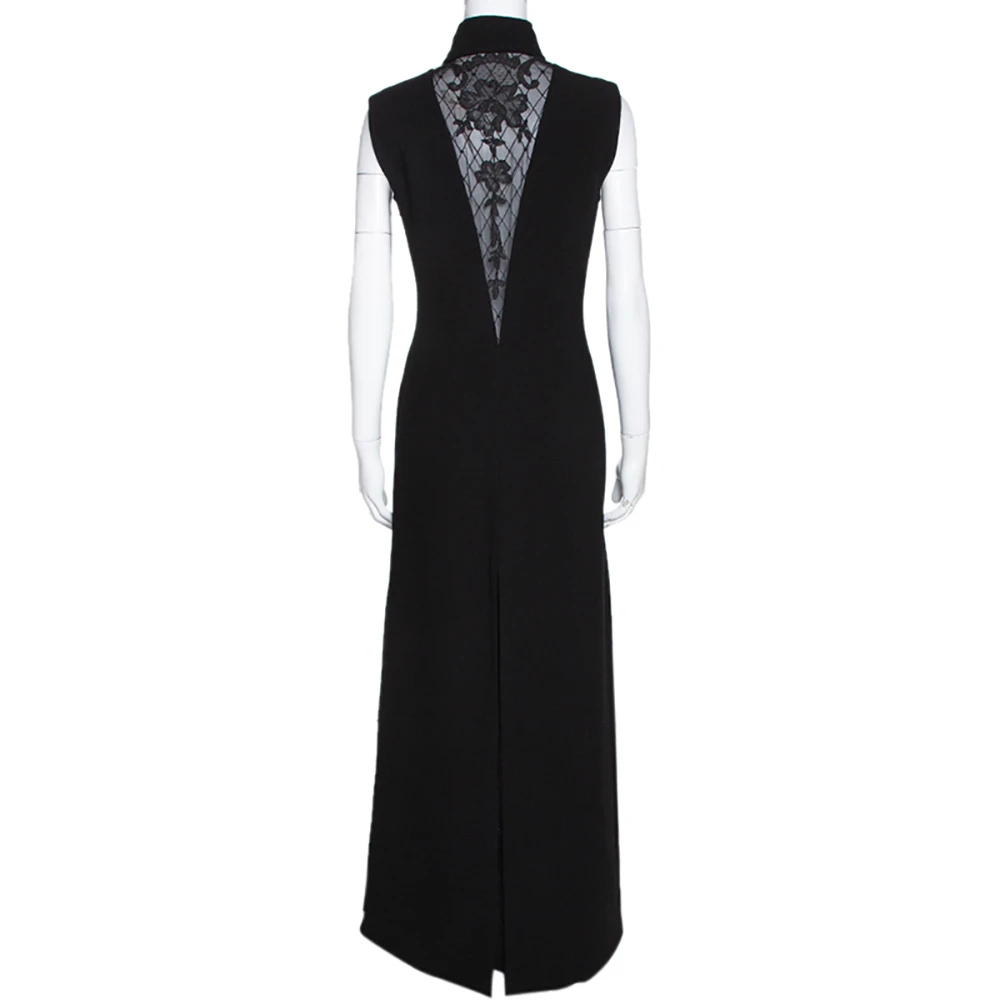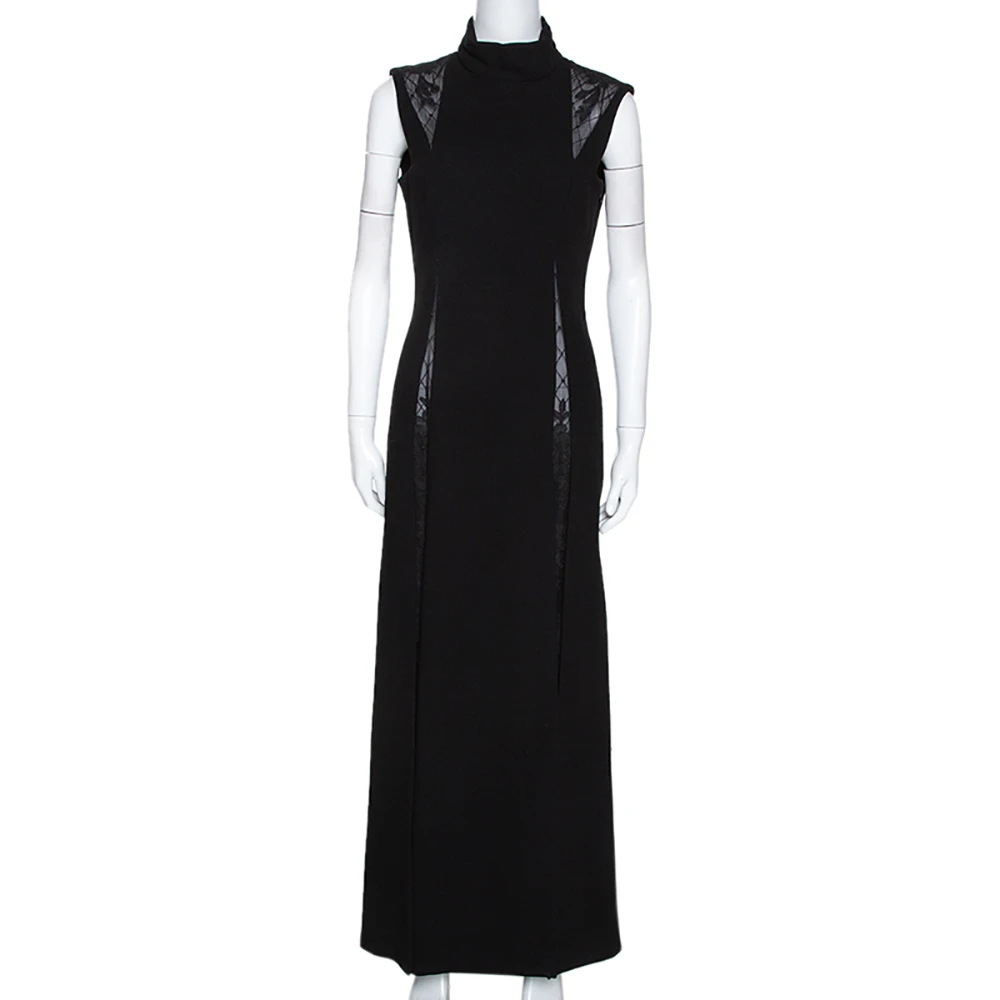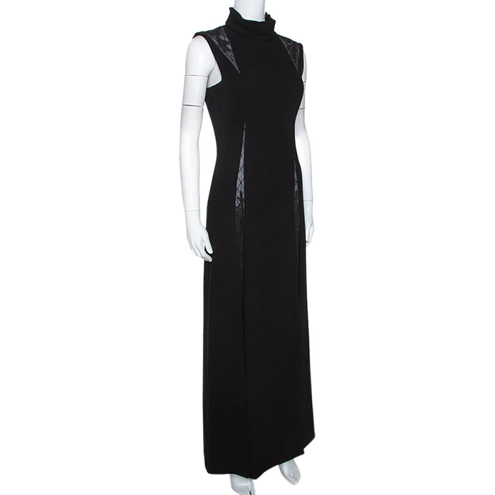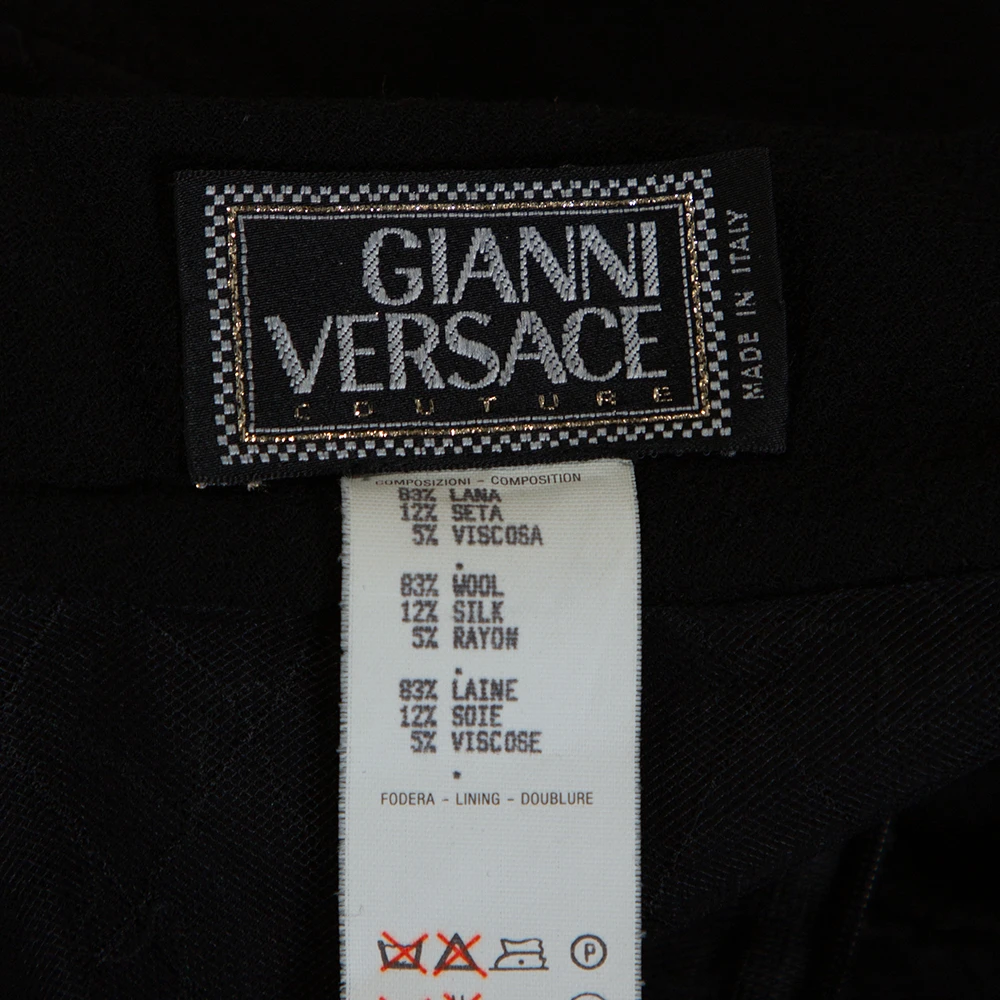 This stylish Gianni Versace Couture dress is great for formal occasions and will make sure compliments keep coming your way. Crafted from wool, silk and rayon, this black ensemble has a sleeveless silhouette. It is styled with panels and intricate lace trims that add interest. It has a high neck, zip closure and a good fit. Pair with high heels.