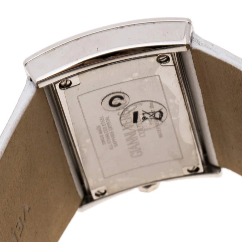 Stand out with this Versace wristwatch. Made from stainless steel, the rectangular case holds a punctuated bezel with screws and the brand label engravings. Its silver dial is complemented with two petite hands. Featuring a 30m water resistance level, this quartz watch has wide, stitched leather straps with engraved clasp closure.