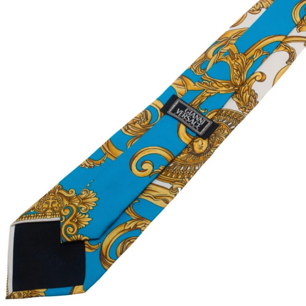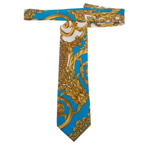 Step out in style in this Gianni Versace turquoise and gold tie. It features Versace’s signature pattern in gold which goes beautifully on the turquoise background.