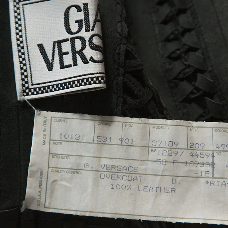 This magnificent creation by Gianni Versace Vintage is something you will never get over with. The stylish piece is tailored from leather and is designed fabulously with fringes, cutouts and whipstitch detailing all over the long silhouette. This excellent overcoat, featuring long sleeves, looks classy in black.