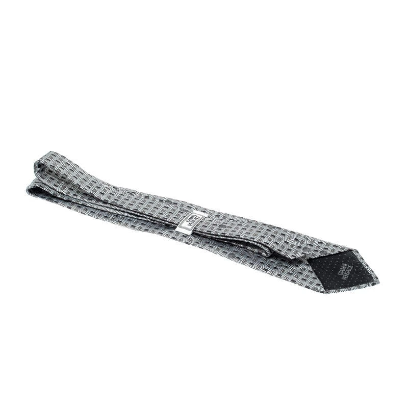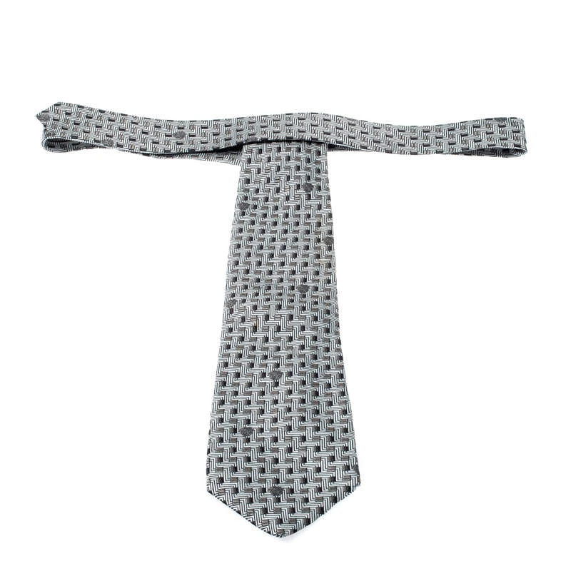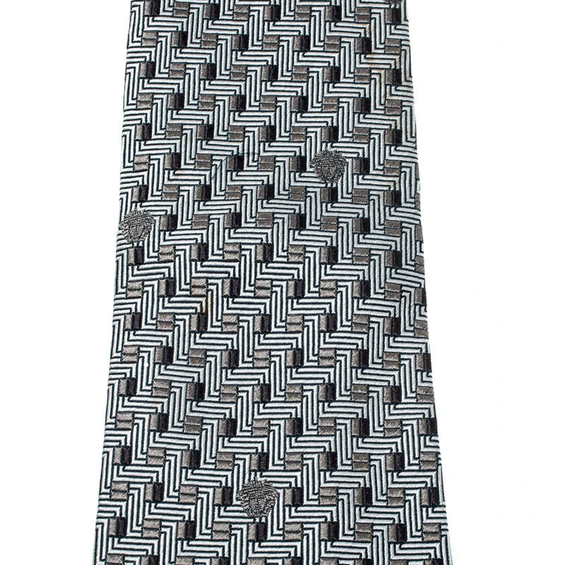 The jacquard knitting and contrasting patterns add an edgy touch to this fine silk tie from Gianni Versace. Introduce a touch of elegance to your formal ensemble with this lovely piece.
