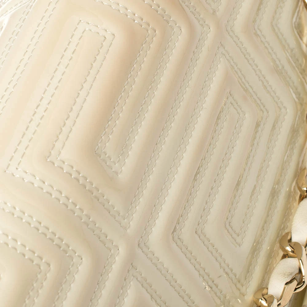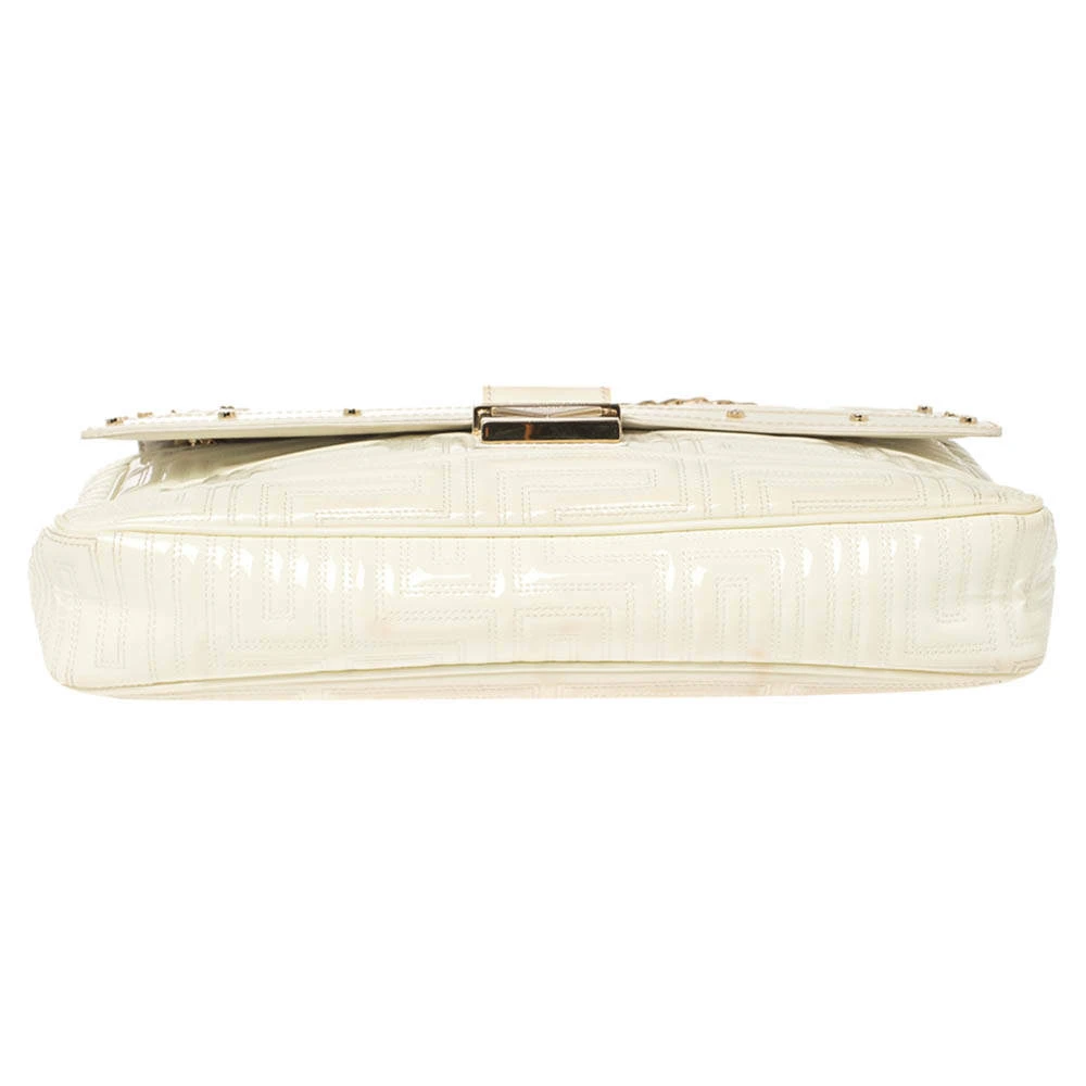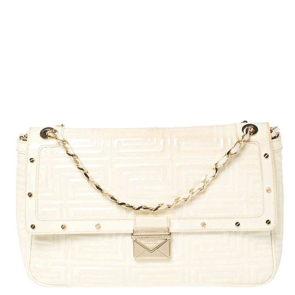 This dainty bag from Gianni Versace is designed to complement your elegant appeal and exudes a classy aura. Skillfully crafted from patent leather in a logo-quilted design, it features a splendid white hue. The bag suspends from a leather woven chain strap, and the front flap is adorned with a gold-tone lock. The accurately spaced fabric interior ensures there’s ample room for your necessities.