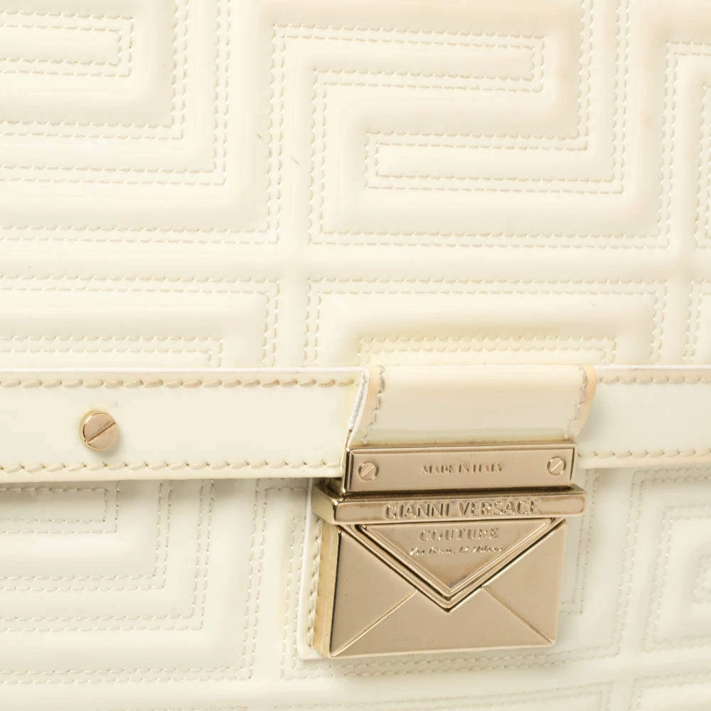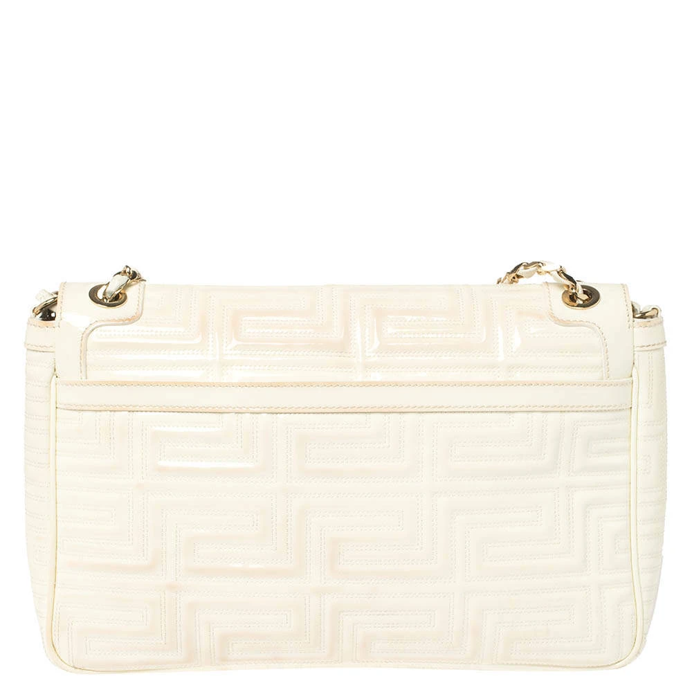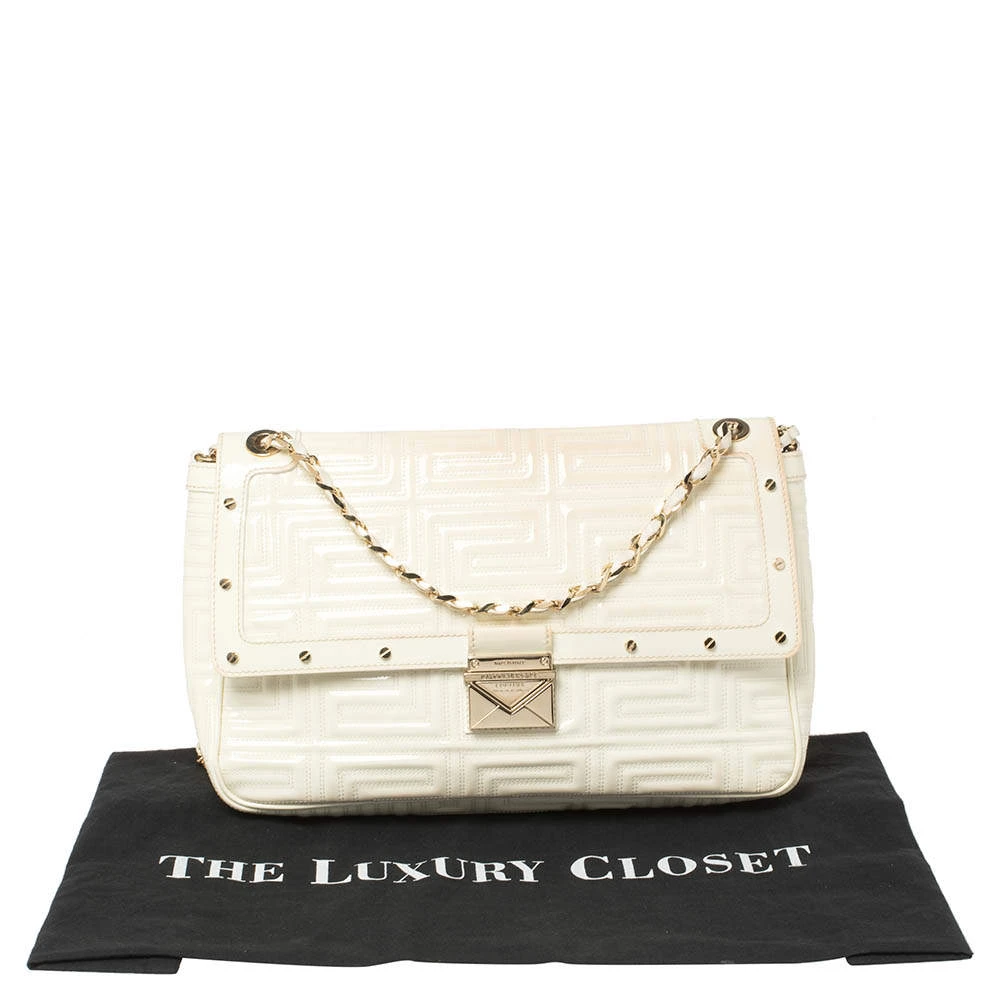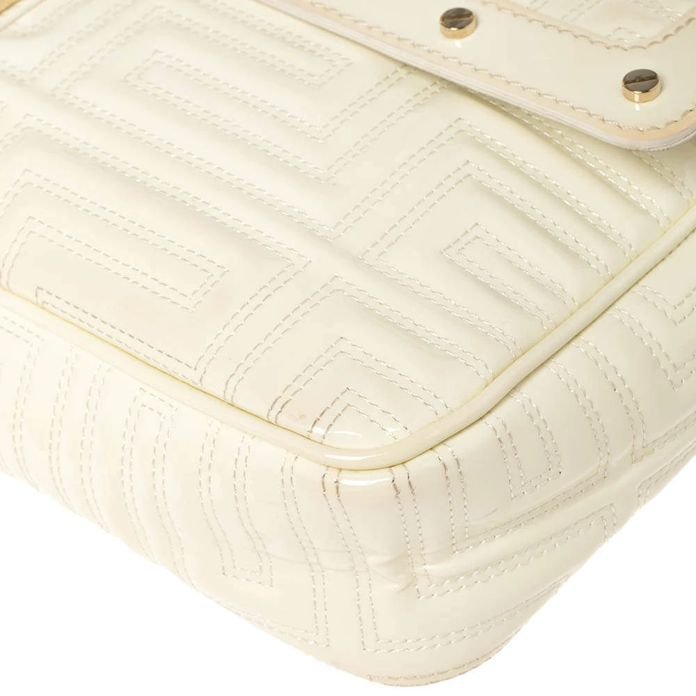 This dainty bag from Gianni Versace is designed to complement your elegant appeal and exudes a classy aura. Skillfully crafted from patent leather in a logo-quilted design, it features a splendid white hue. The bag suspends from a leather woven chain strap, and the front flap is adorned with a gold-tone lock. The accurately spaced fabric interior ensures there’s ample room for your necessities.