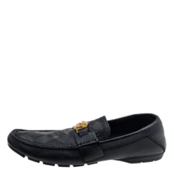 Versace Black Leather And Monogram Fabric Medusa Slip On Loafers Size 44 For Men