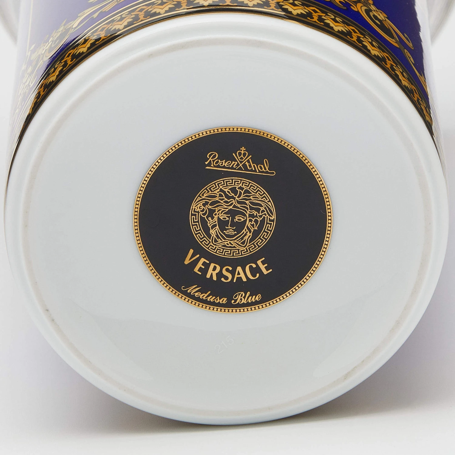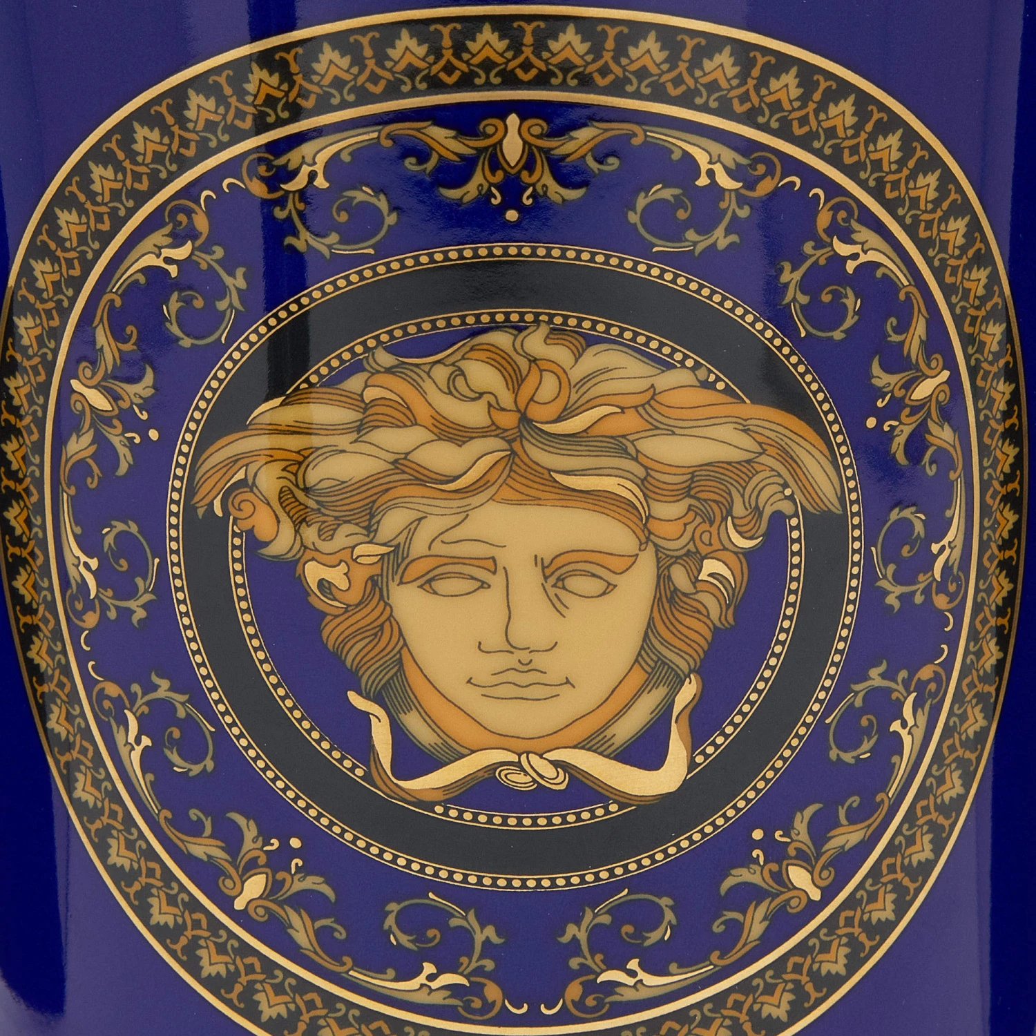 Exuding opulence, this ornate Medusa vase is a result of the glorious collaboration between Versace and Rosenthal. True to their brand aesthetics, both have brought glamour, sophistication, and most of all awe-inspiring detail to this porcelain piece. With a sturdy bottom and a rounded body, this vase is delicately adorned with the signature Medusa logo in the center and vintage designs on the neck, center, and bottom. It is a creation that will sit gracefully on any table and become an heirloom that is cherished for a long time to come.