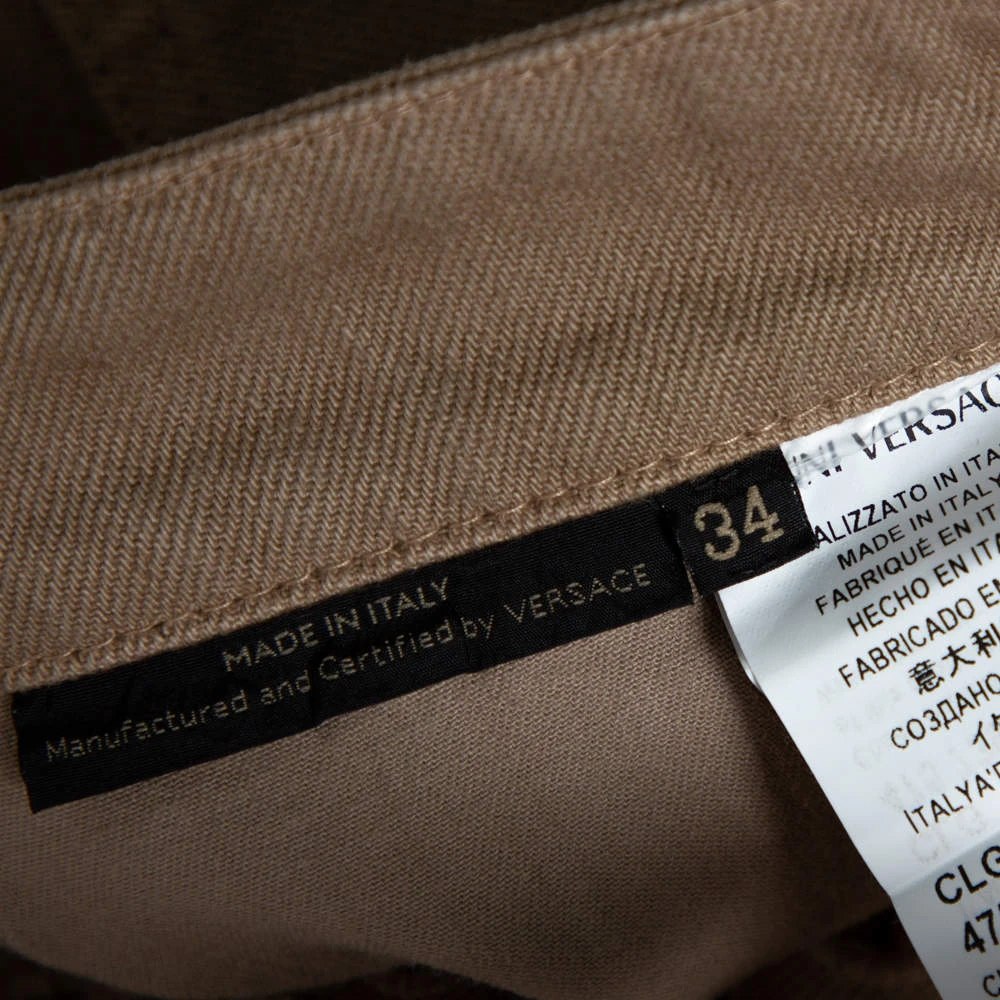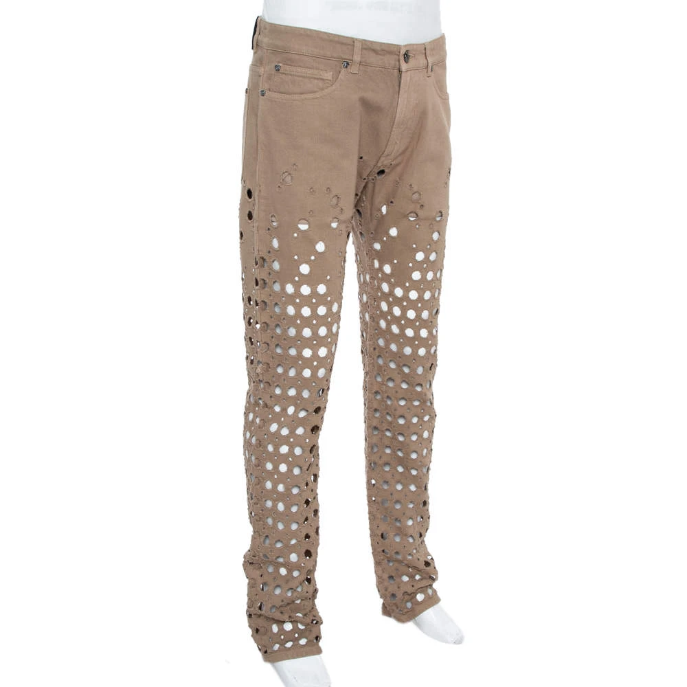 These beige jeans from Versace are anything but ordinary and will prove to be an amazing buy! They are made of denim fabric in a straight-leg silhouette and styled with perforated details, belt loops, a front button and zip fastening, and five pockets. They’ll look great with your casual T-shirts and loafers.