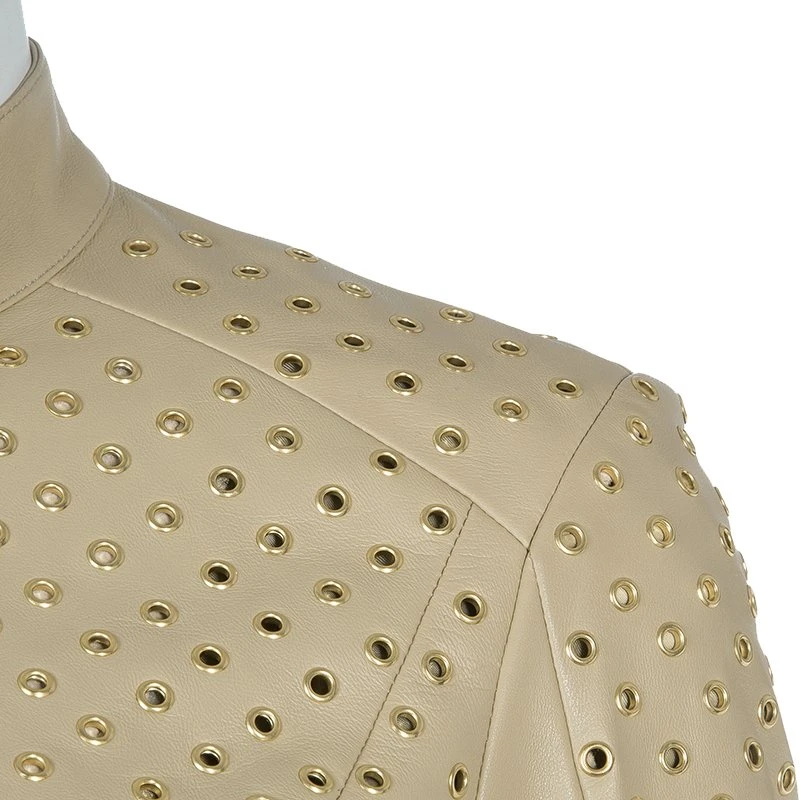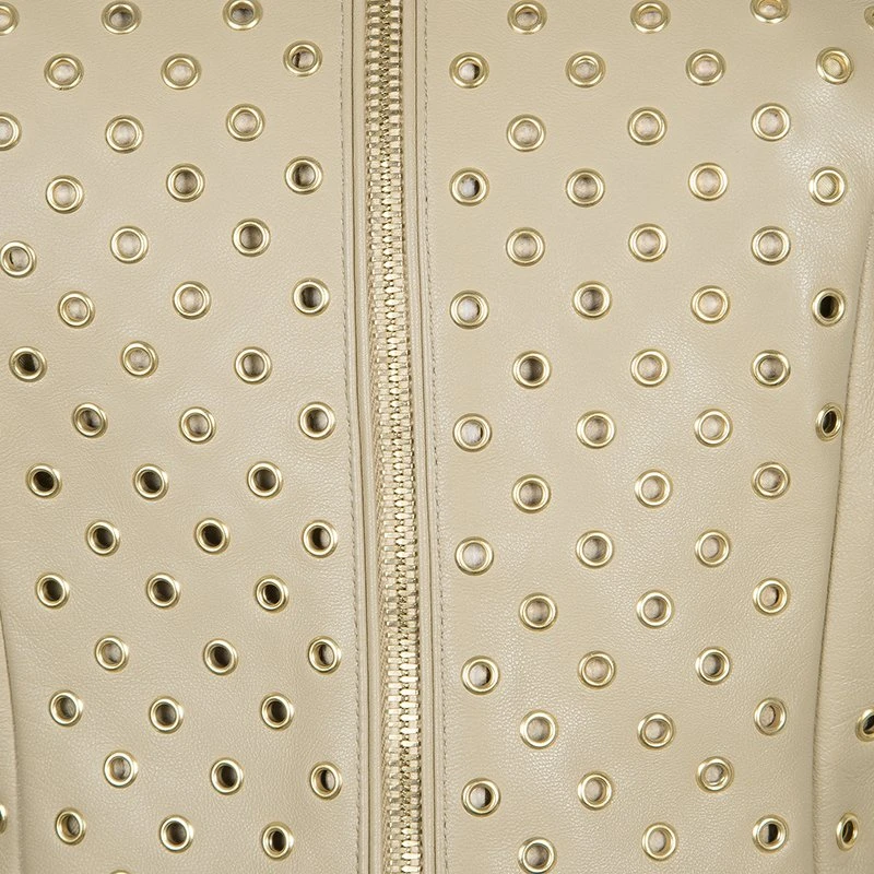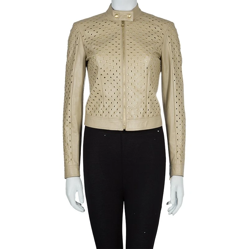 This stunning Italian-made jacket from Versace has an exquisite appeal of a bold yet feminine style statement. Crafted in supple beige leather, the jacket features gold-tone eyelets, zips on the front and the cuffs, and buttons on the banded collar. Tailored with two front and two back dart panels, the collar, cuffs, half arm lengths and round bottom hem is designed in plain leather for highlighting the eyelets. The lining is a blend of rayon with a hint of elastane.