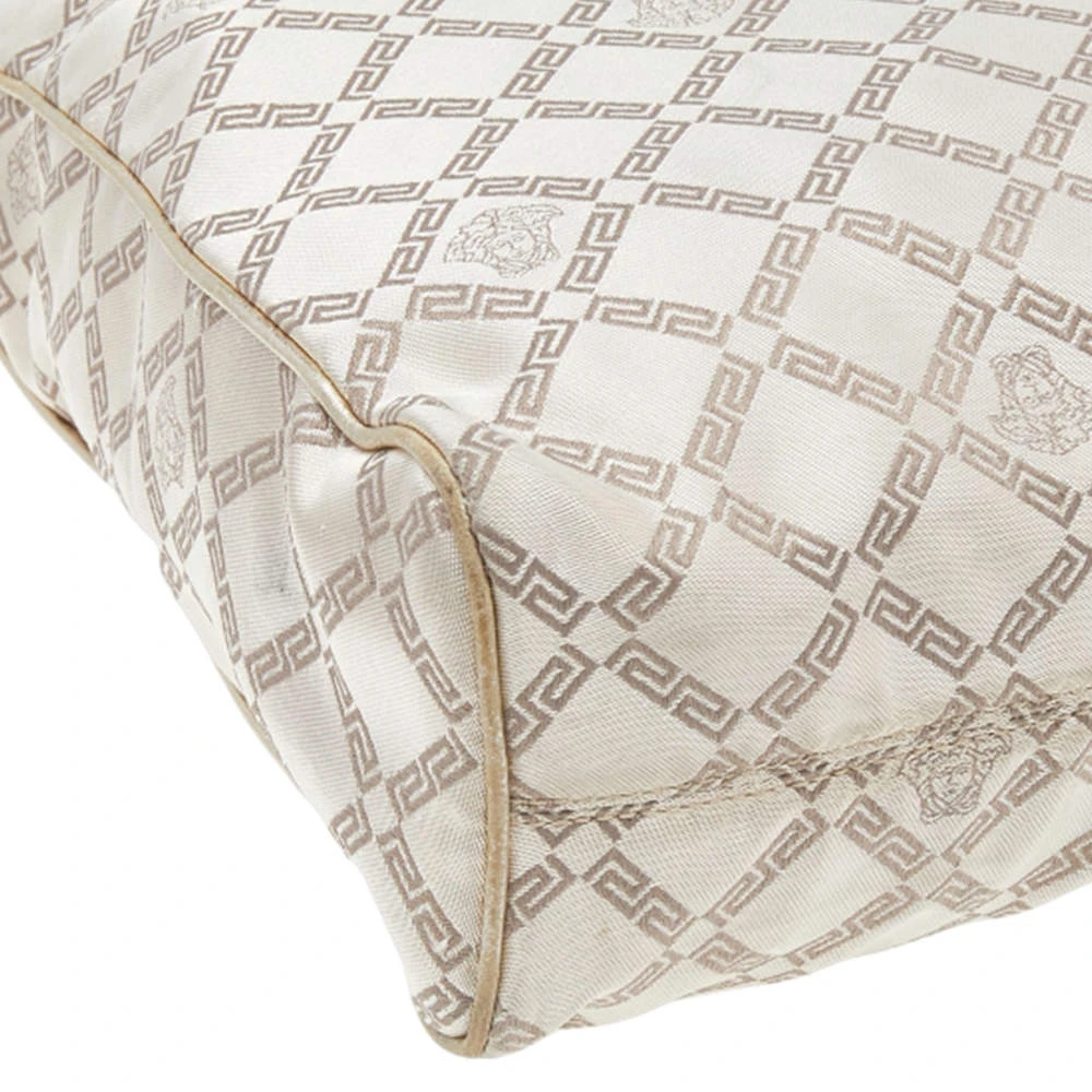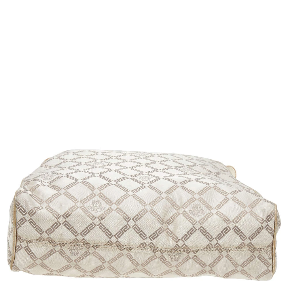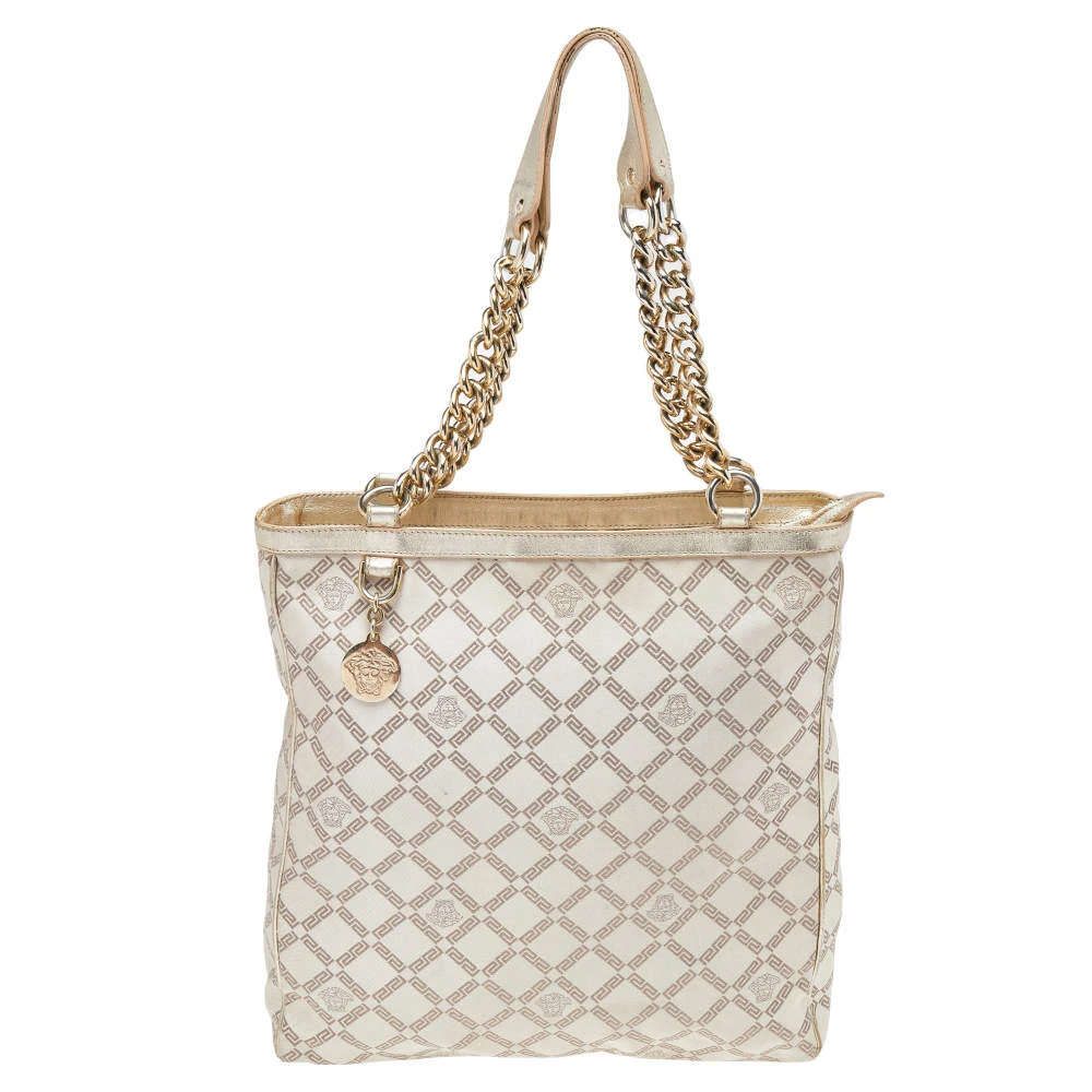 Attain a chic look when you carry this Versace bag in style. Crafted from signature canvas & leather in a beige hue, the bag is held by dual handles and is equipped with a spacious satin-lined interior. The creation features a gold-tone logo charm.