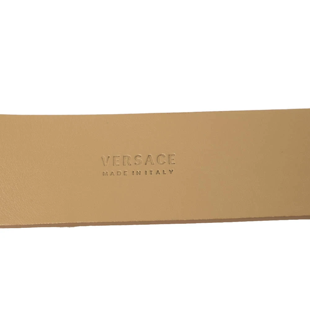 Versace’s beige leather belt for women is designed to be durable. The surface is detailed with tonal stitches and the front is adorned with a bow for an elegant look. Style this belt over your dresses, pants, and skirts for a stylish update.
