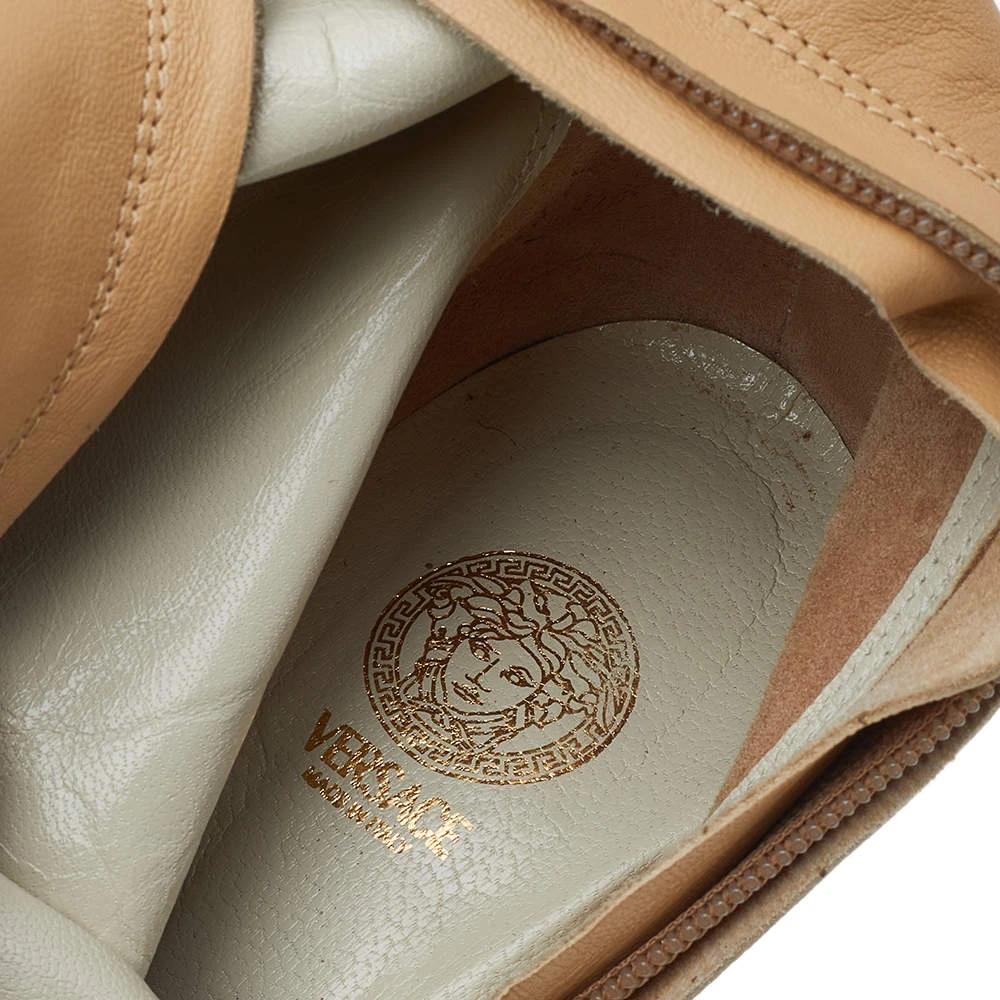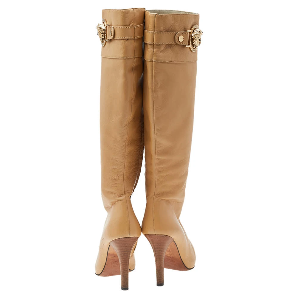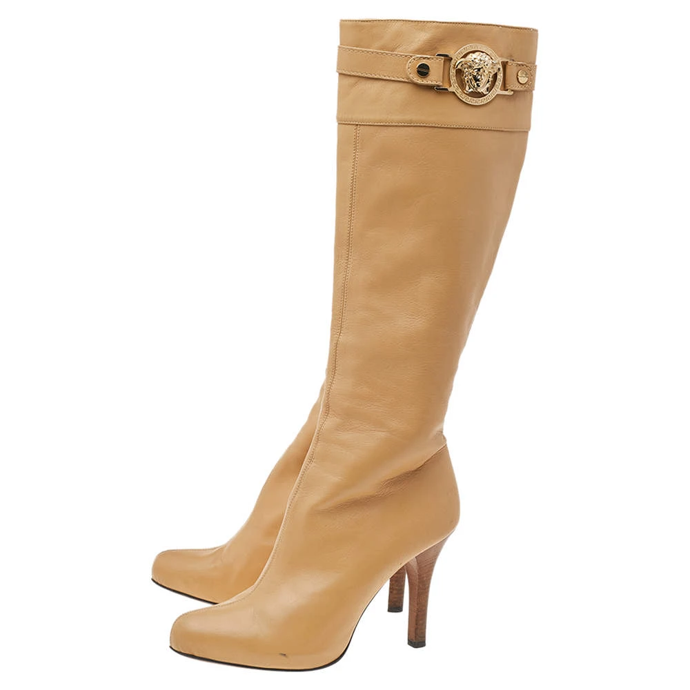 Chic boots are closet staples for any woman and what better than one from the house of Versace? Crafted from beige leather in a knee-length silhouette, they are designed in an almond-toe silhouette, Medusa motifs, and are raised on sturdy heels.