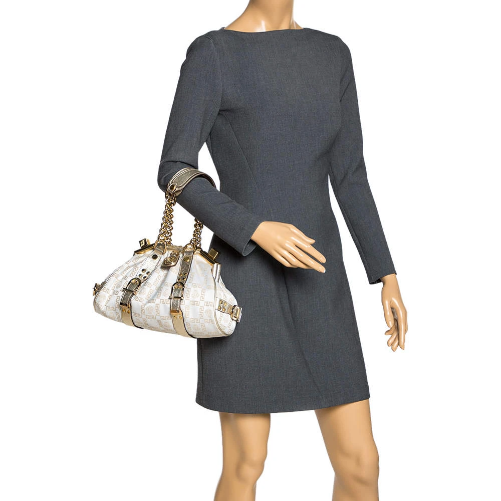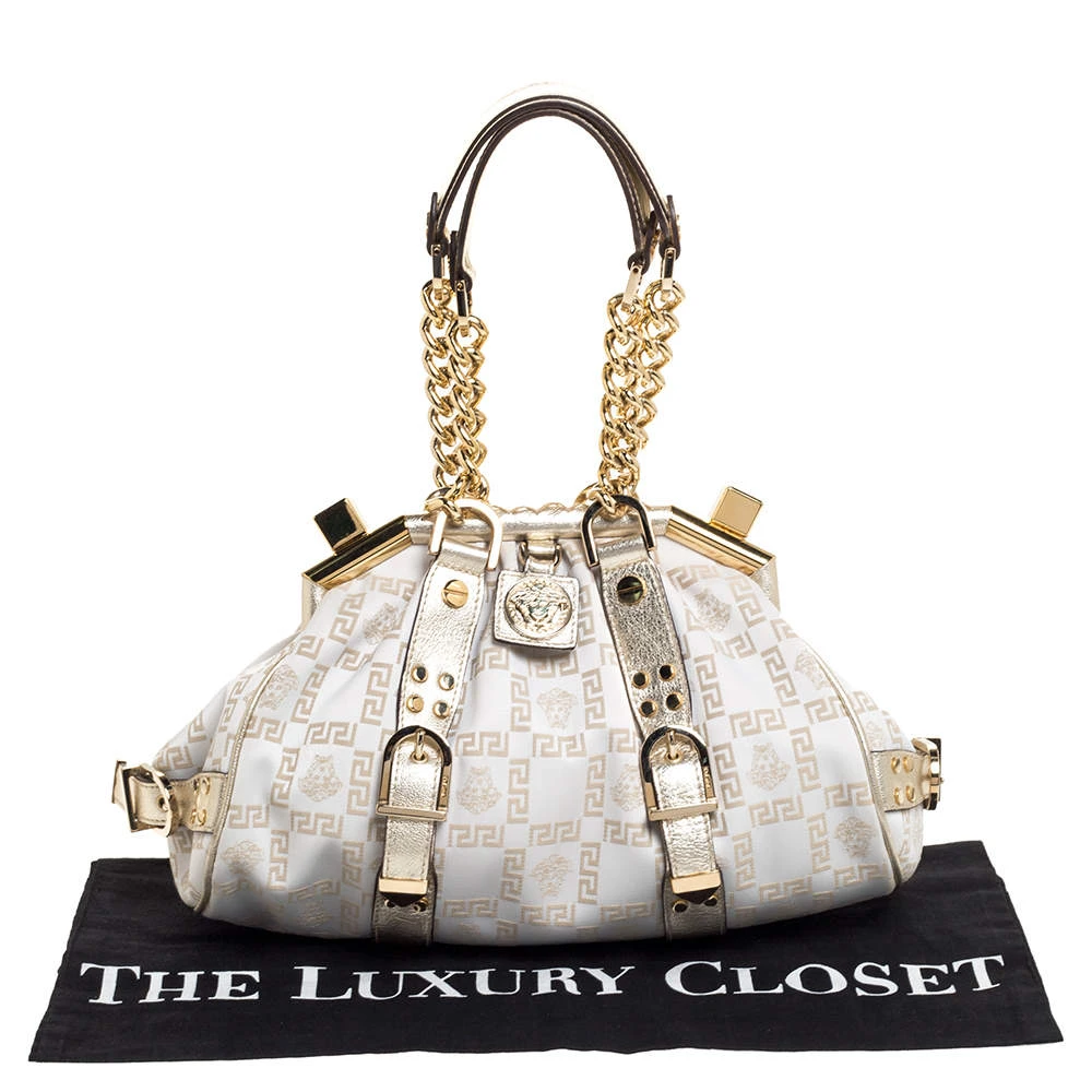 The Madonna bag from Versace is made from canvas and metallic leather. It comes with two chain handles with leather rest, gold-tone hardware and a logo charm on the front. It is lined with fabric on the inside and will easily hold your necessities.