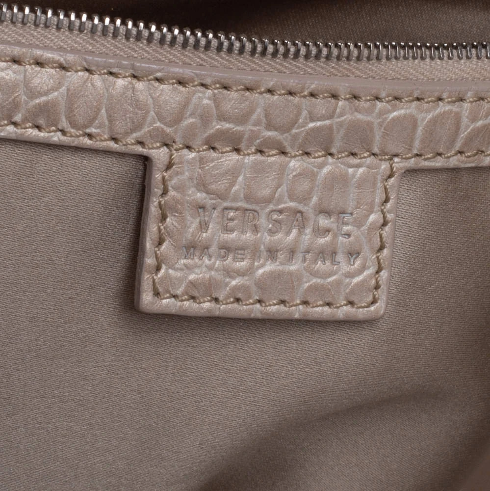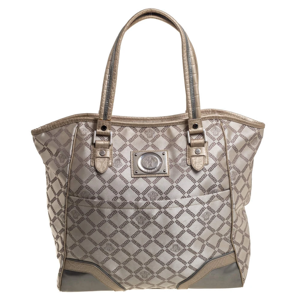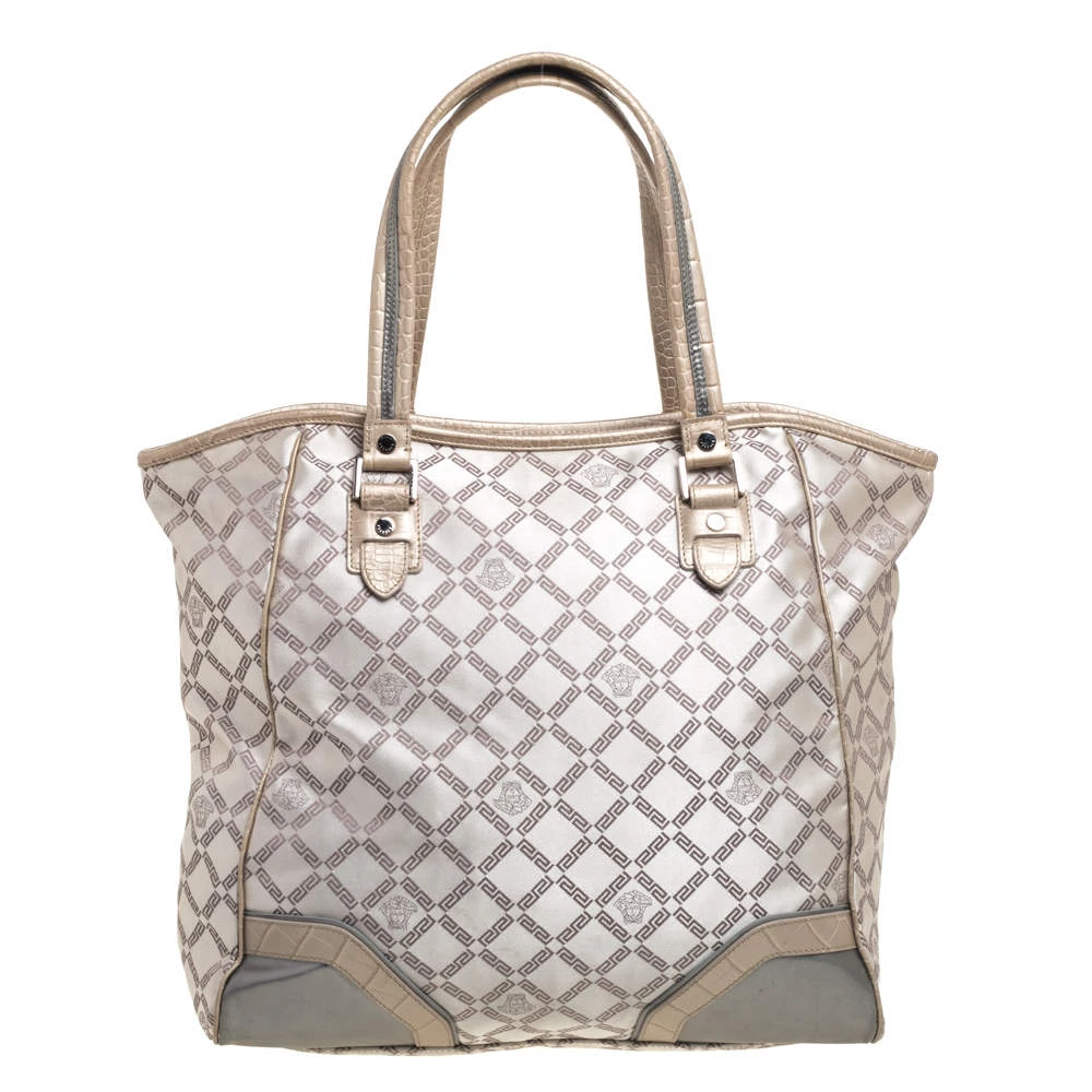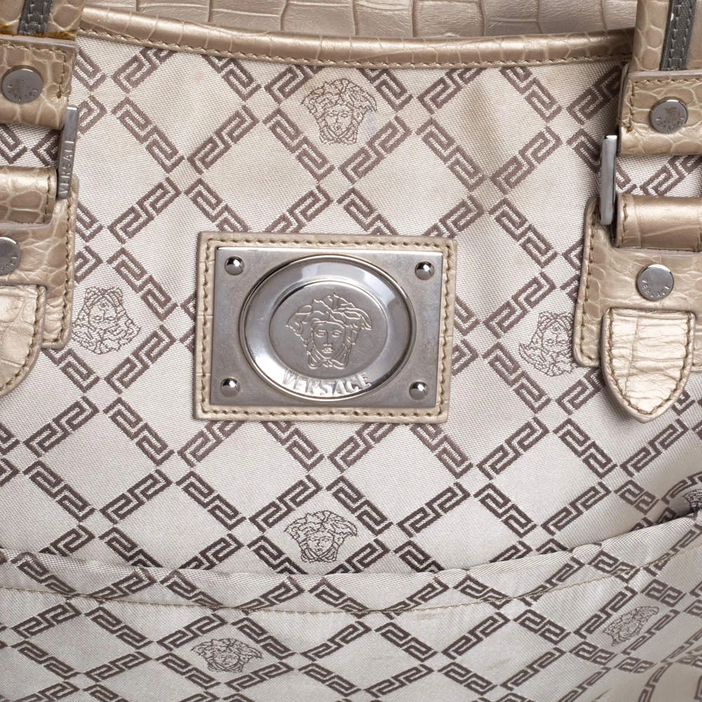 This fabulous tote by Versace is a bag ready to blend in with the busy lifestyle of the women of today. Meticulously crafted from monogram fabric and croc-embossed leather, it features a classy beige hue and dual top handles for you to parade it. The bag flaunts the iconic Medusa logo detailing on the front and comes equipped with a spacious satin-lined interior that has a zip pocket. Complete with silver-tone hardware, this tote will make an ideal buy!