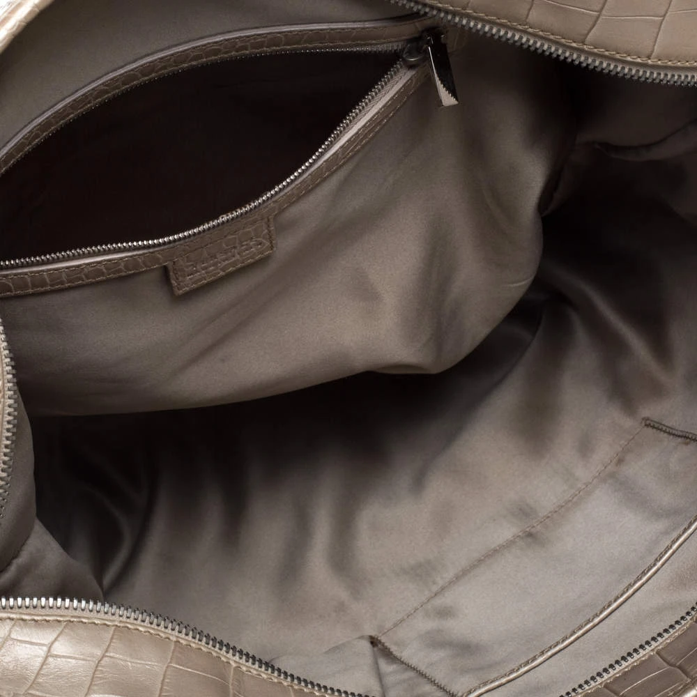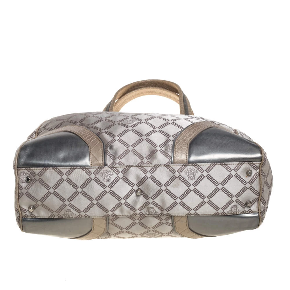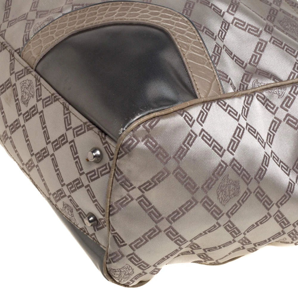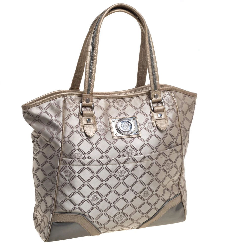 This fabulous tote by Versace is a bag ready to blend in with the busy lifestyle of the women of today. Meticulously crafted from monogram fabric and croc-embossed leather, it features a classy beige hue and dual top handles for you to parade it. The bag flaunts the iconic Medusa logo detailing on the front and comes equipped with a spacious satin-lined interior that has a zip pocket. Complete with silver-tone hardware, this tote will make an ideal buy!
