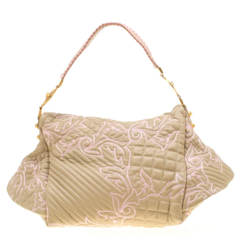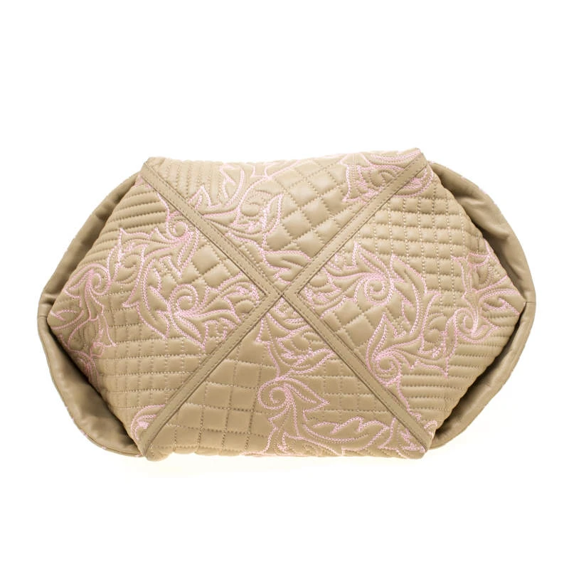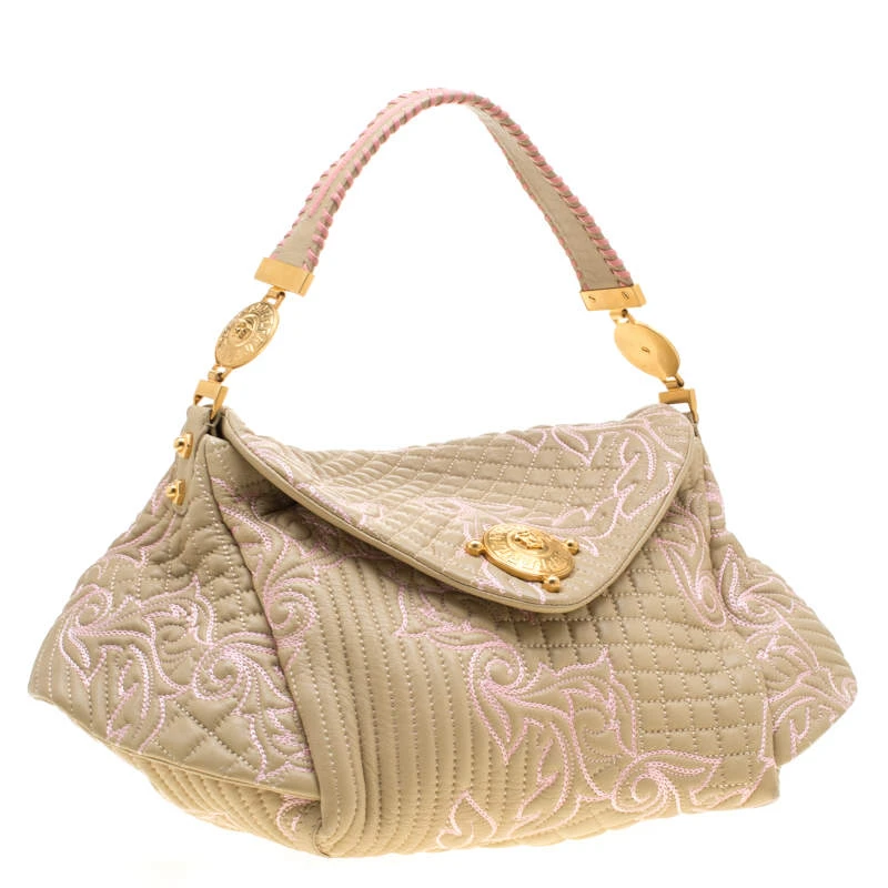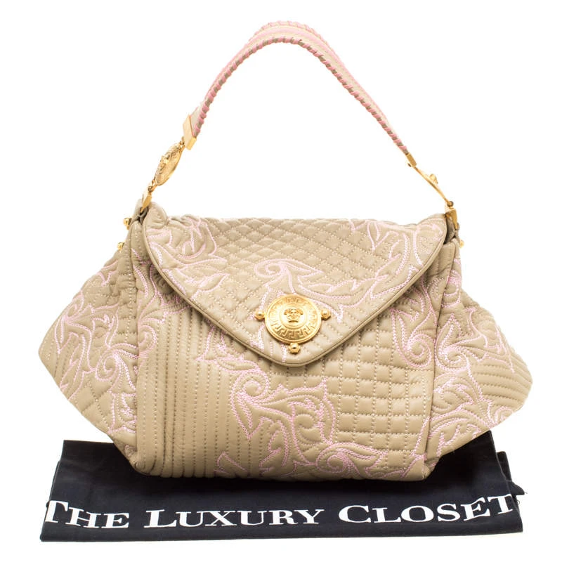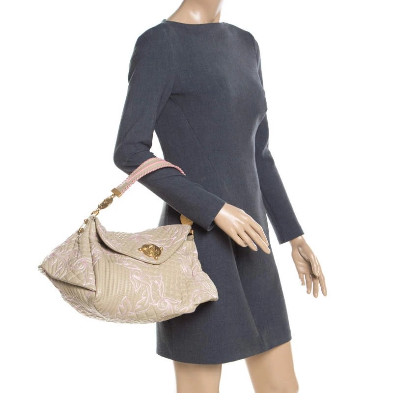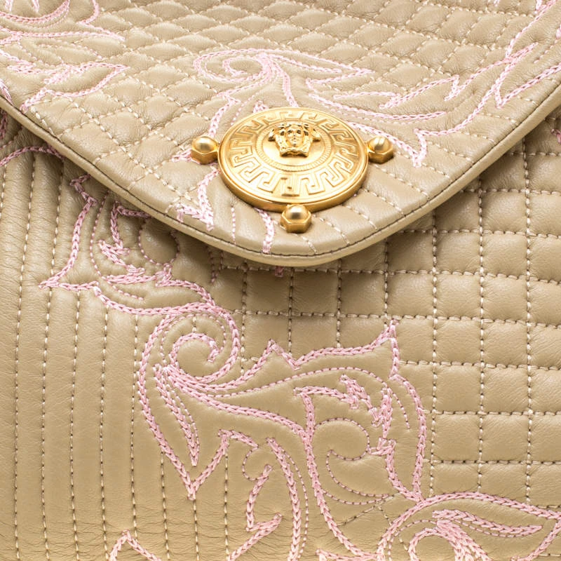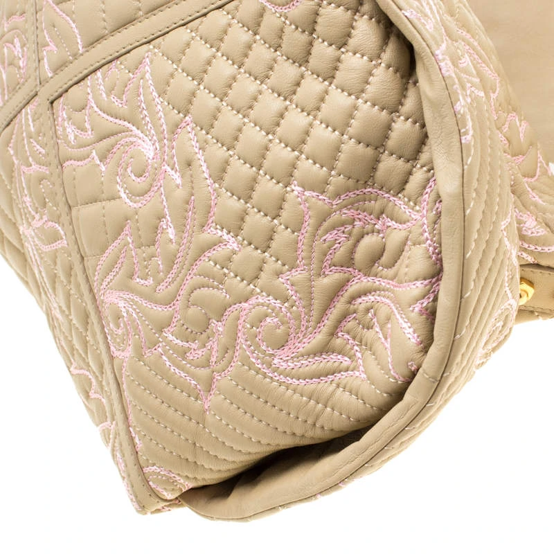 This Versace handbag is meticulously crafted from quilted leather. The Barocco bag delights not only with its appeal but structure as well. It is held by a single handle, adorned with a lovely embroidery all over and equipped with a spacious canvas interior. The unique shape, the notable Medusa logo at front in gold-tone, and the impeccable style effortlessly add to the marvel of this coveted piece.
