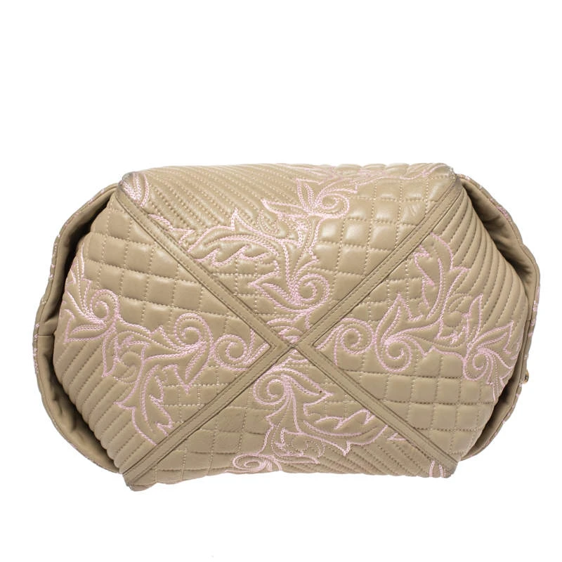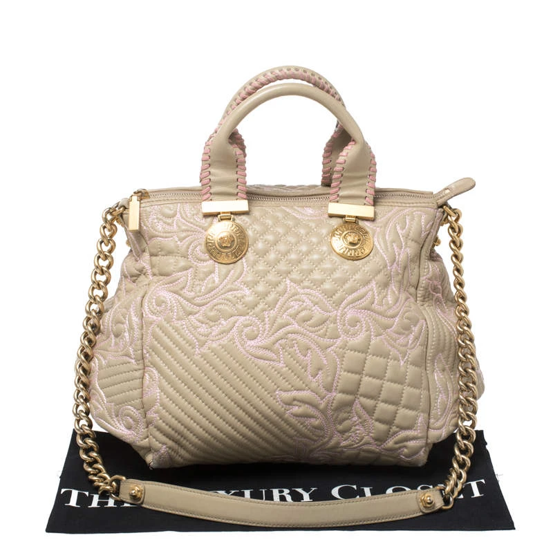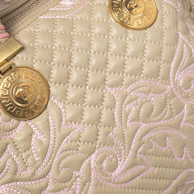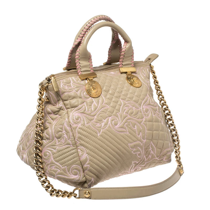 How gorgeous is this satchel from Versace! Crafted from beige-pink leather and gold-tone hardware, it carries an outstanding quilted design all over the exterior. It has a canvas interior secured by zippers and it is held by two handles. The Medusa motifs uplift its beauty and make it a buy you will not regret.
