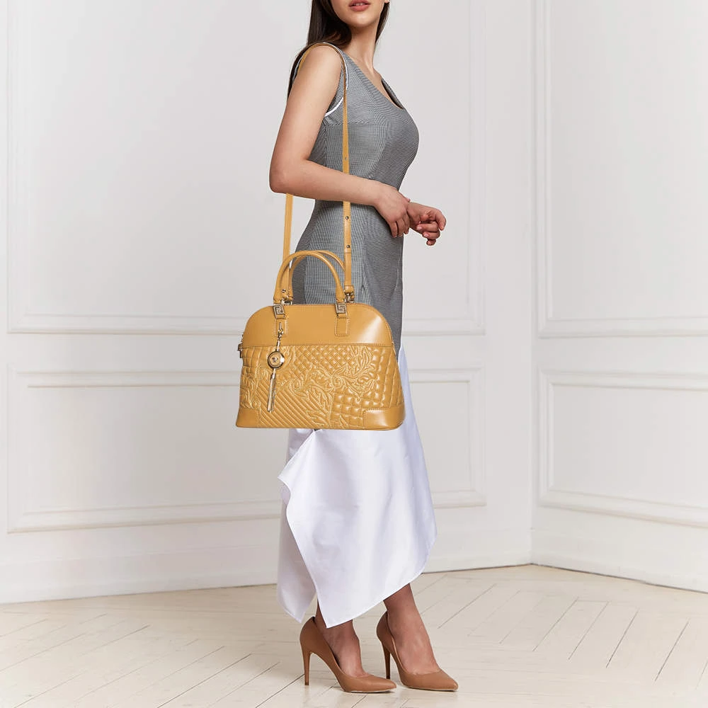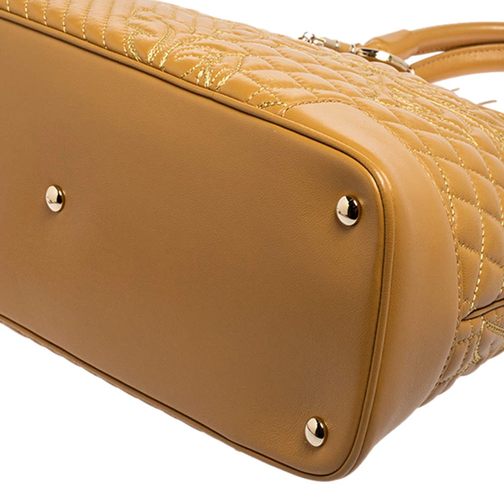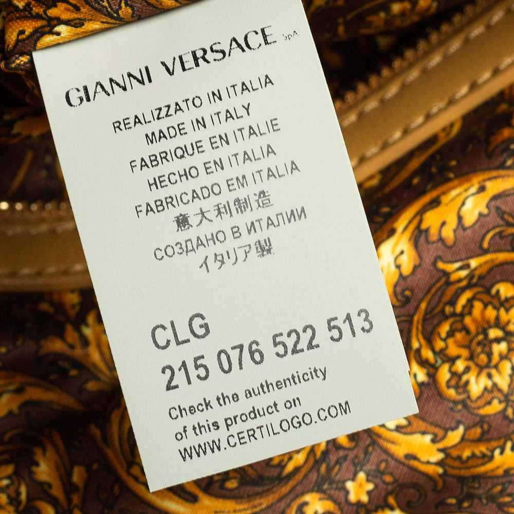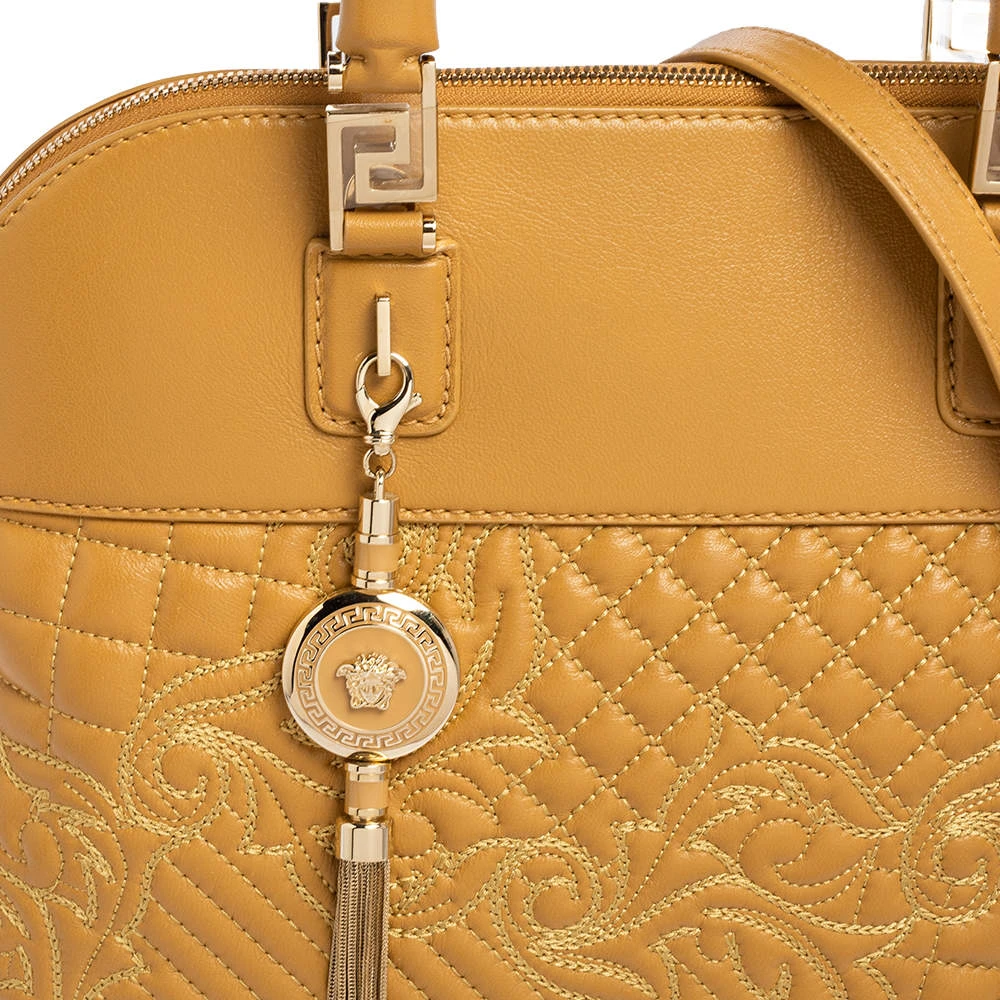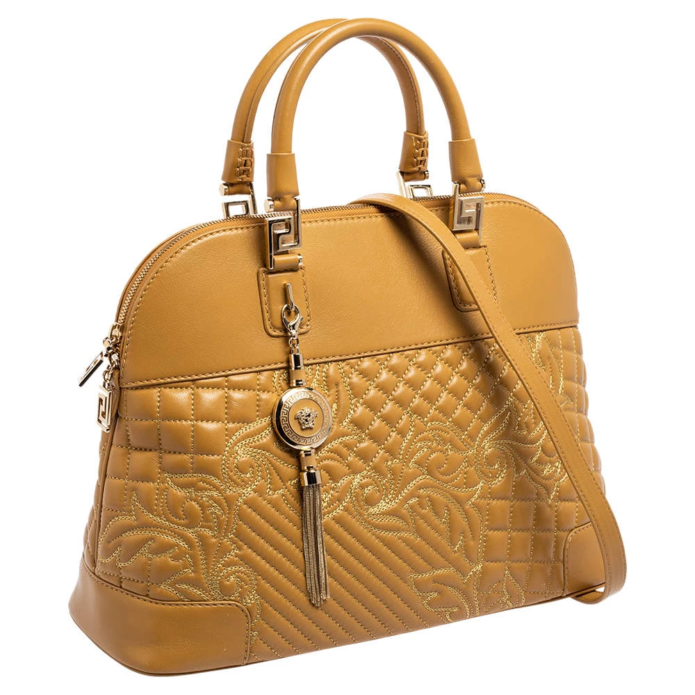 The House of Versace brings you this glamorous Athena Vanitas satchel that will grant you nothing but style and luxury. It is made from beige quilted leather into a sturdy silhouette. It flaunts dual handles, a gold-toned charm on the front, and a shoulder strap. This satchel will definitely add an element of panache to your attire.
