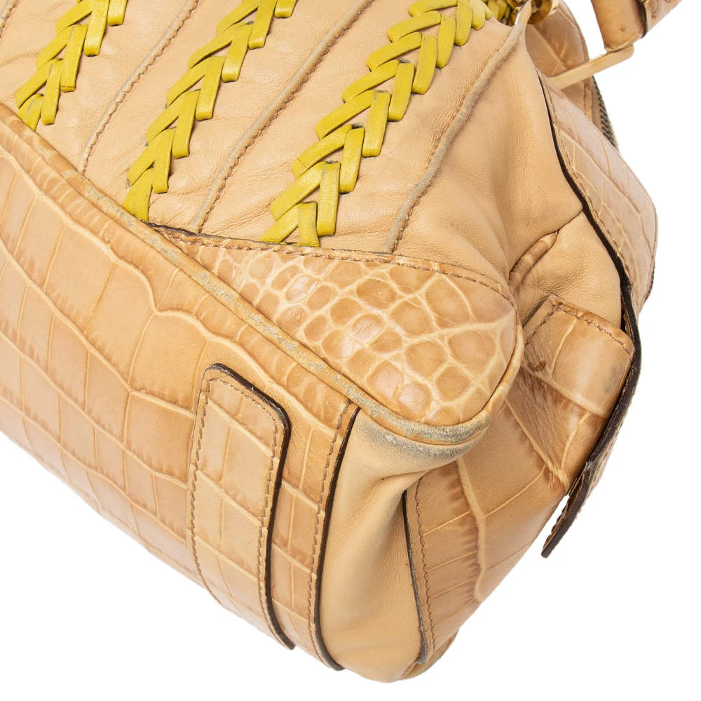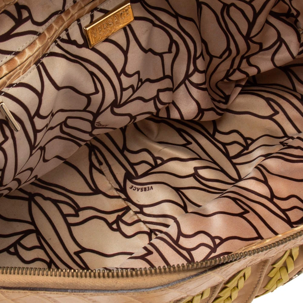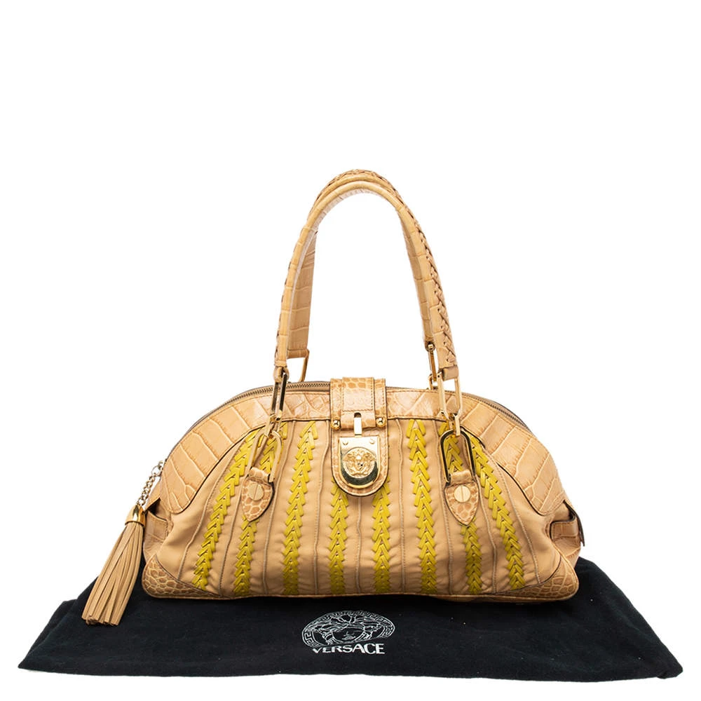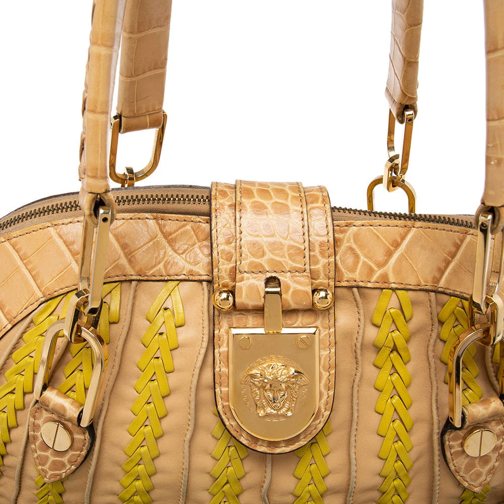 This bowler bag from the House of Versace is great for everyday use! It is made from beige-yellow leather and croc-embossed leather, which is embellished with gold-tone hardware. It showcases dual handles and a satin-lined interior. This bag will make you look classy!