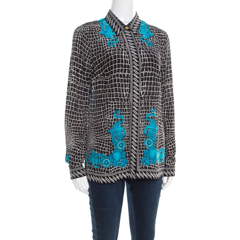 Versace will never fail to impress others and it is fully proved by this designer silk blouse. It has a buttoned front, a classic collar and long sleeves. The abstract print along with the signature Medusa logo at the rear looks stunning on this blouse.