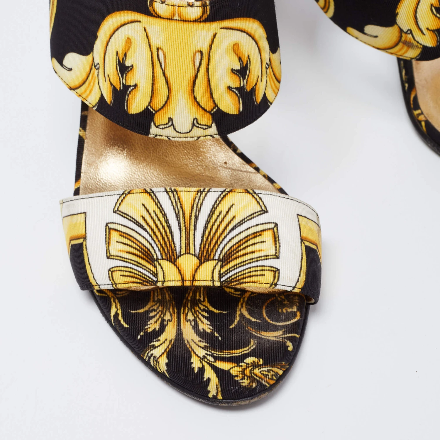 Characterized by an eye-catching Baroque print, these Versace sandals are a statement pair and can take your look to a whole new level. They are skillfully crafted from canvas in a black hue and feature open toes. These sandals have smooth leather insoles and offer maximum comfort while walking.