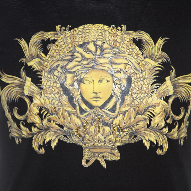 This stunning t-shirt by Versace is crafted from 100% cotton. It comes in a black shade and features a baroque print with the signature Medusa motif and subtle embellishments. It comes with short sleeves, round neck and has a good fit. Wear with jeans for a casual look.