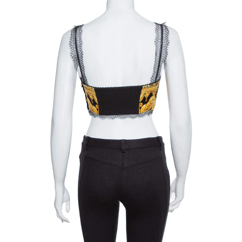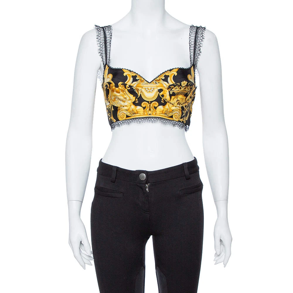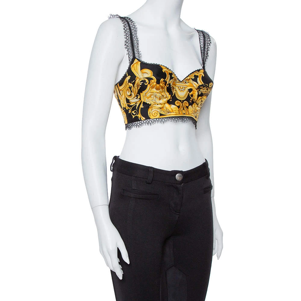 Versace’s instantly recognizable black, white and golden-yellow Baroque print brings a signature element to this alluring silk cropped top. Fashion icons like Irina Shayk have been spotted wearing this crop top. It’s expertly crafted in Italy to a slender silhouette with an elegant sweetheart neckline and soft underwired cups, whilst delicate Chantilly lace accents the skinny shoulder straps and hem. Pair it with the contrasting pleated midi skirt and stiletto heels for a chic after-dark edit.