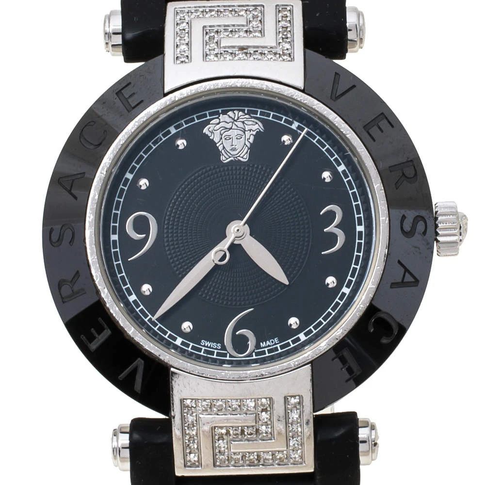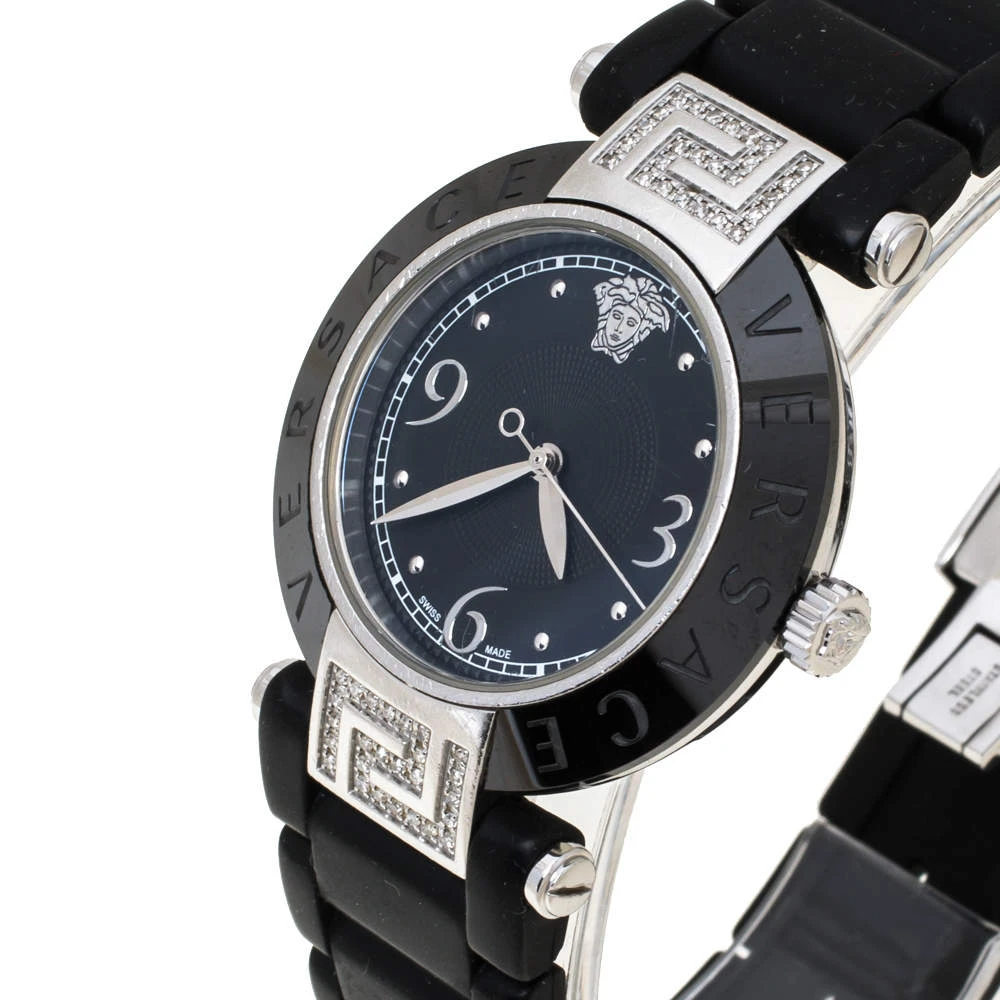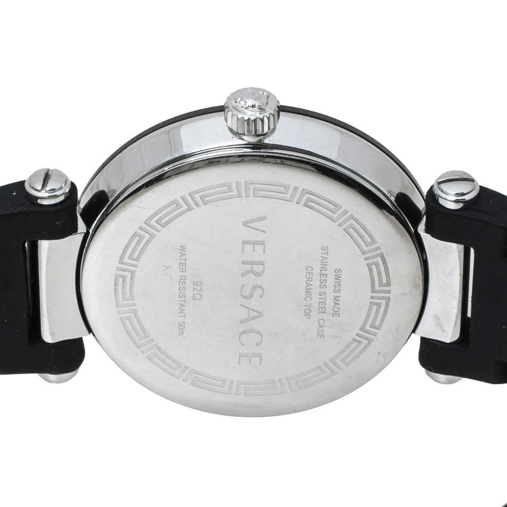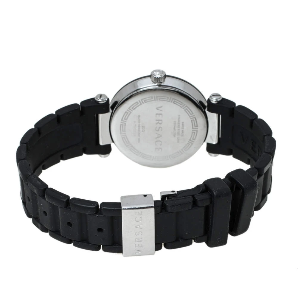 A classic timepiece that will serve you with unparalleled sophistication, this Versace Reve 92Q watch comes with a ceramic and stainless steel case having a diameter of 35 mm. The bezel features engraved details and Greek keys that are adorned with diamonds. The textured dial exhibits stud hour markers, three hands, and the signature Medusa motif at the 12 o’clock position. The case is held by a rubber bracelet that fastens with a deployment clasp.