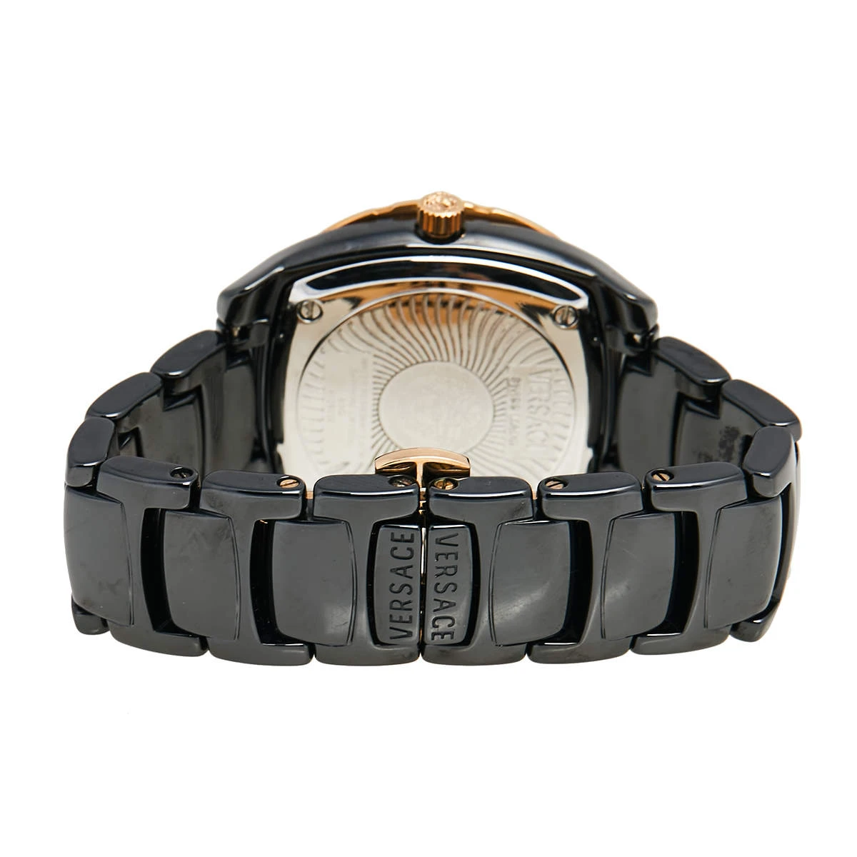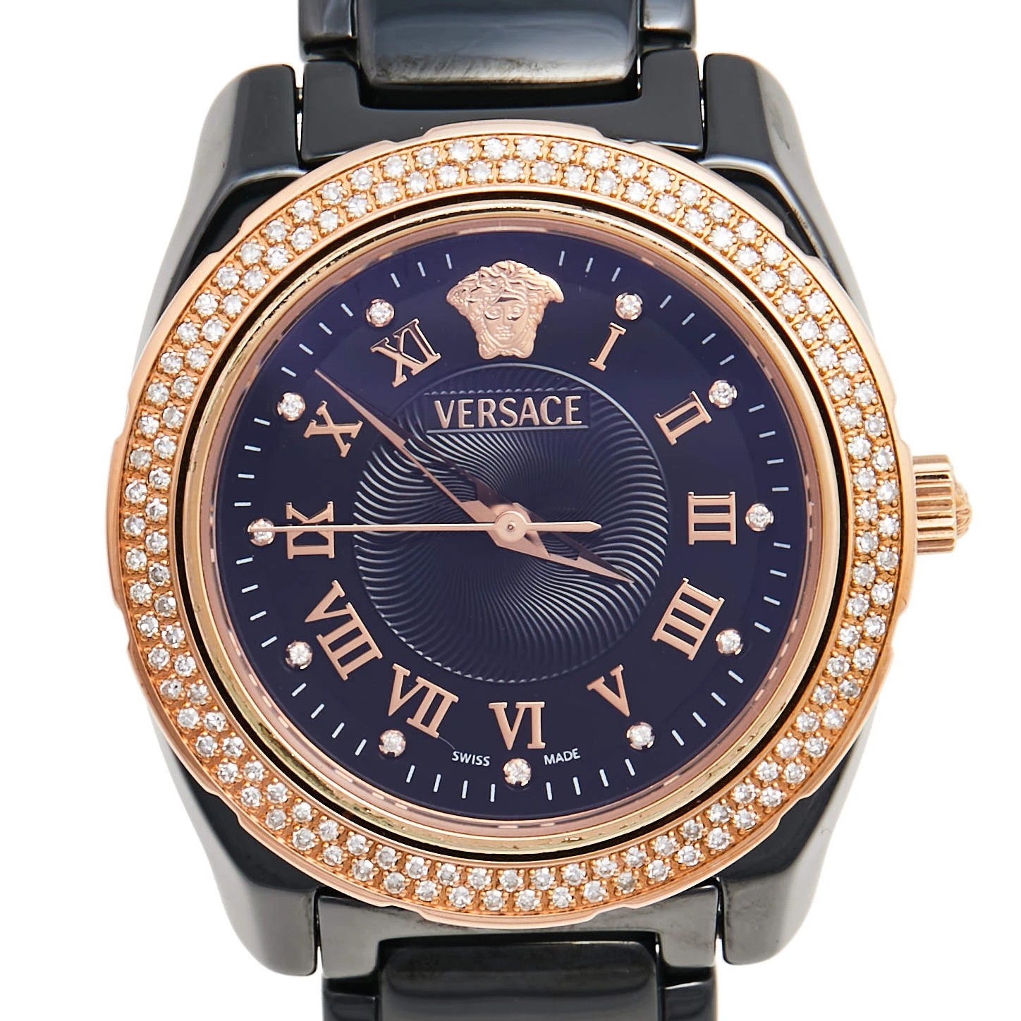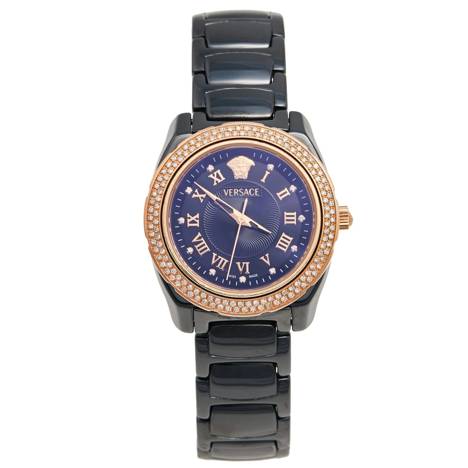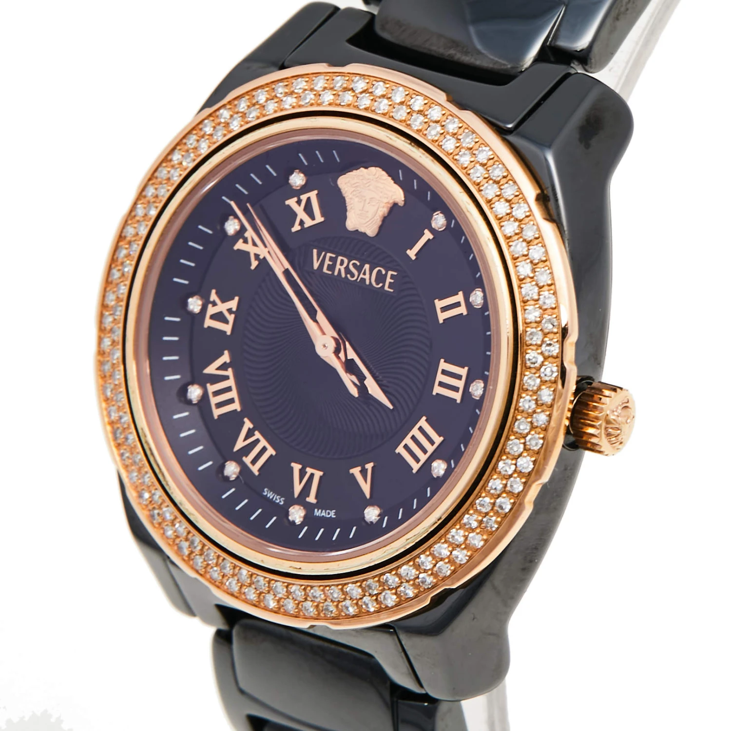 If you are looking for a utility wristwatch infused with immense timeless appeal, then this timepiece from Versace will serve you well. The watch offers the perfect combination of watchmaking technology and refined style for durability and aesthetic appeal. The black ceramic and rose-gold stainless steel case is fitted with a black dial featuring diamond and Roman numeral hour markers and the Medusa logo. For added shine, more diamonds are detailed on the bezel. The ceramic bracelet fixes on the wrist of the wearer with a push-button clasp.