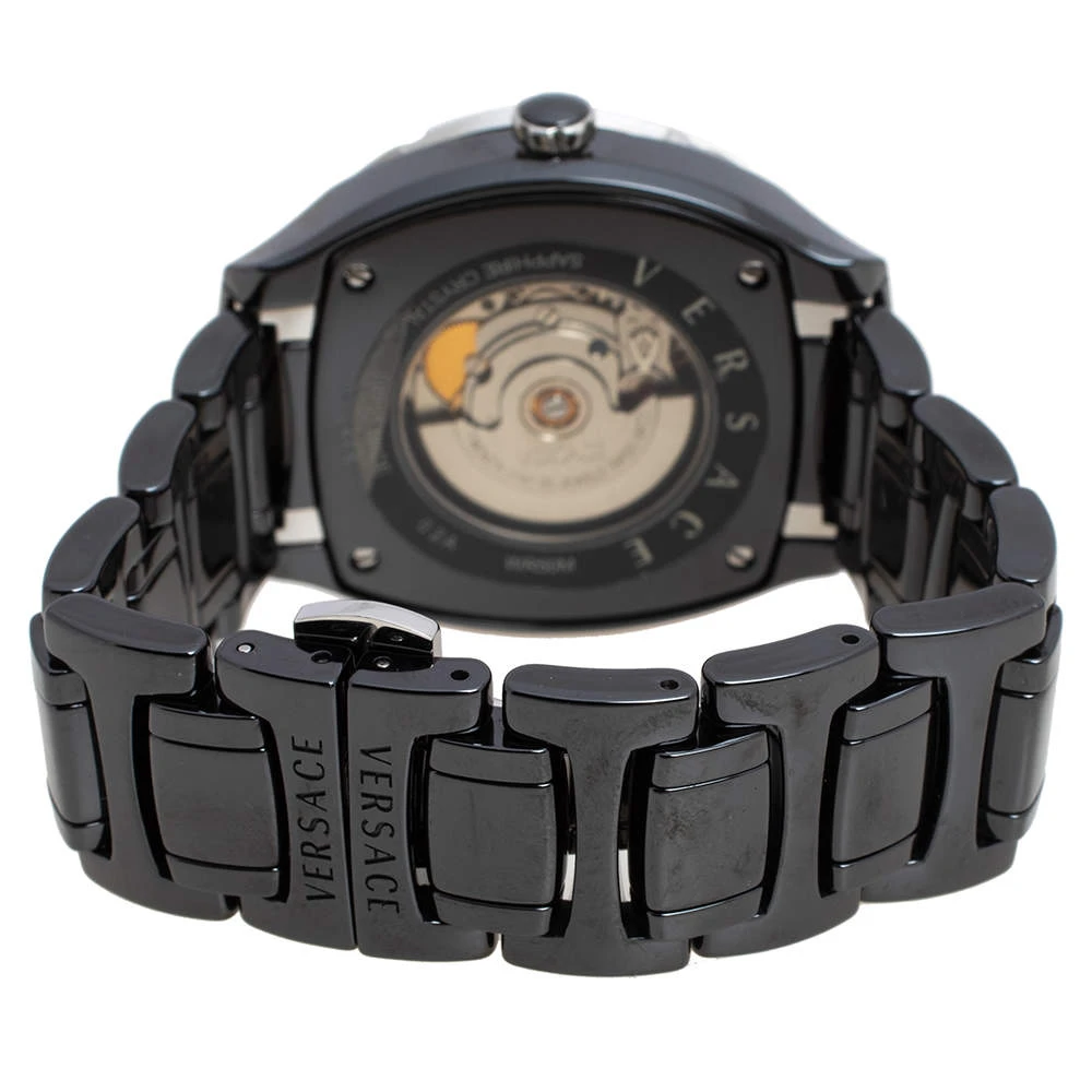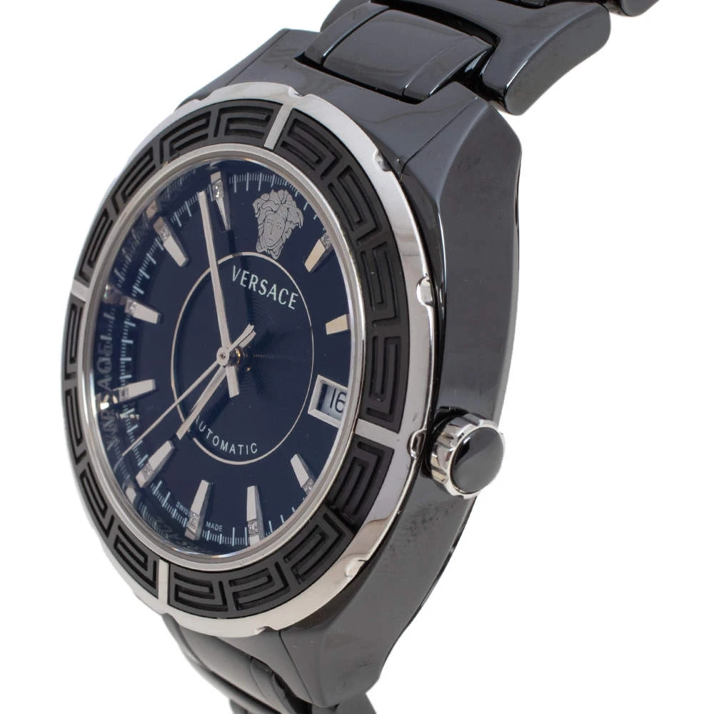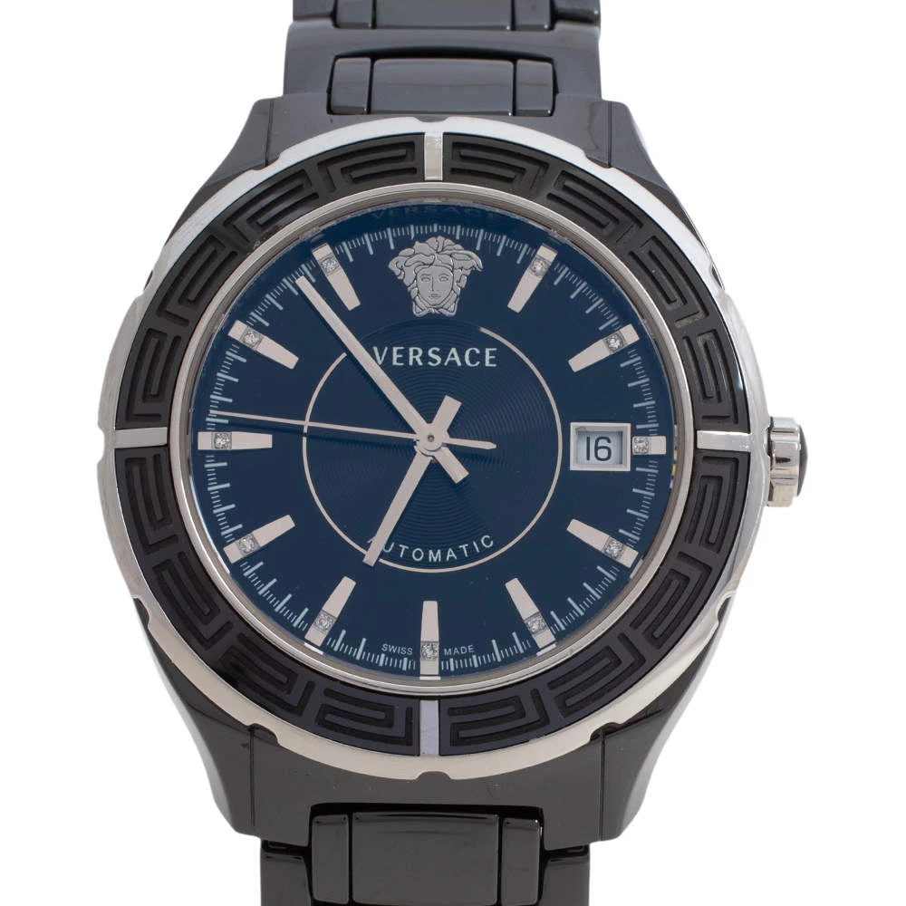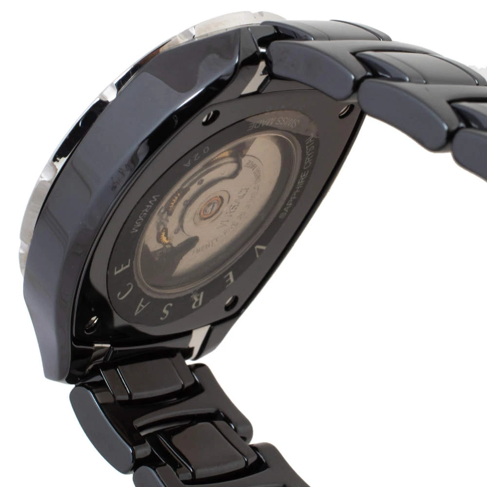 The Versace DV One 02A timepiece is a delight for watch lovers. Functioning on automatic movement, the watch has a black ceramic and stainless steel case with a diameter of 40 mm. While the bezel is detailed with the signature Greek keys, the dial boasts of stick and diamond hour markers, three hands, the iconic Medusa logo at the 12 o’clock position, and a date window at the 3 o’clock position. The case is neatly held by a black ceramic and stainless steel bracelet that fastens with a push-button deployment clasp.