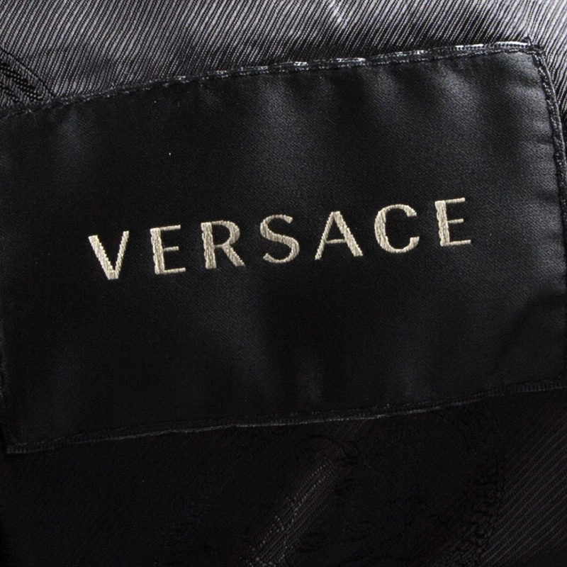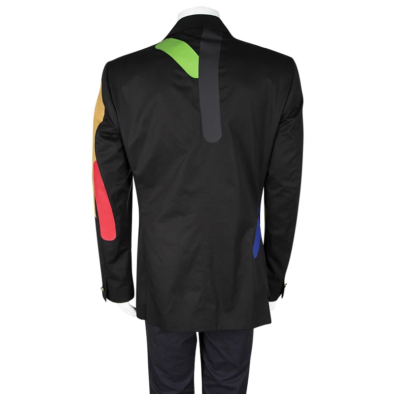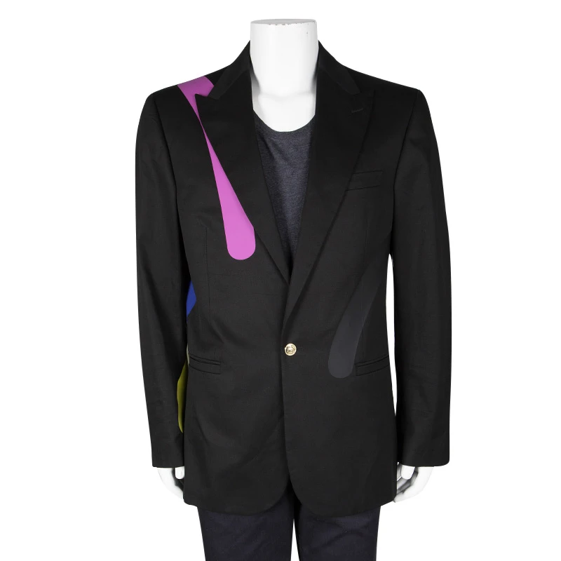 Versace is known for its unique pieces and masculine styles. This standout blazer is tailor-made with notched lapels and a front button opening. 100% cotton shell is patterned with viscose lining for easy wear. The color-block paint stripes make this a dapper choice to flaunt at the parties.