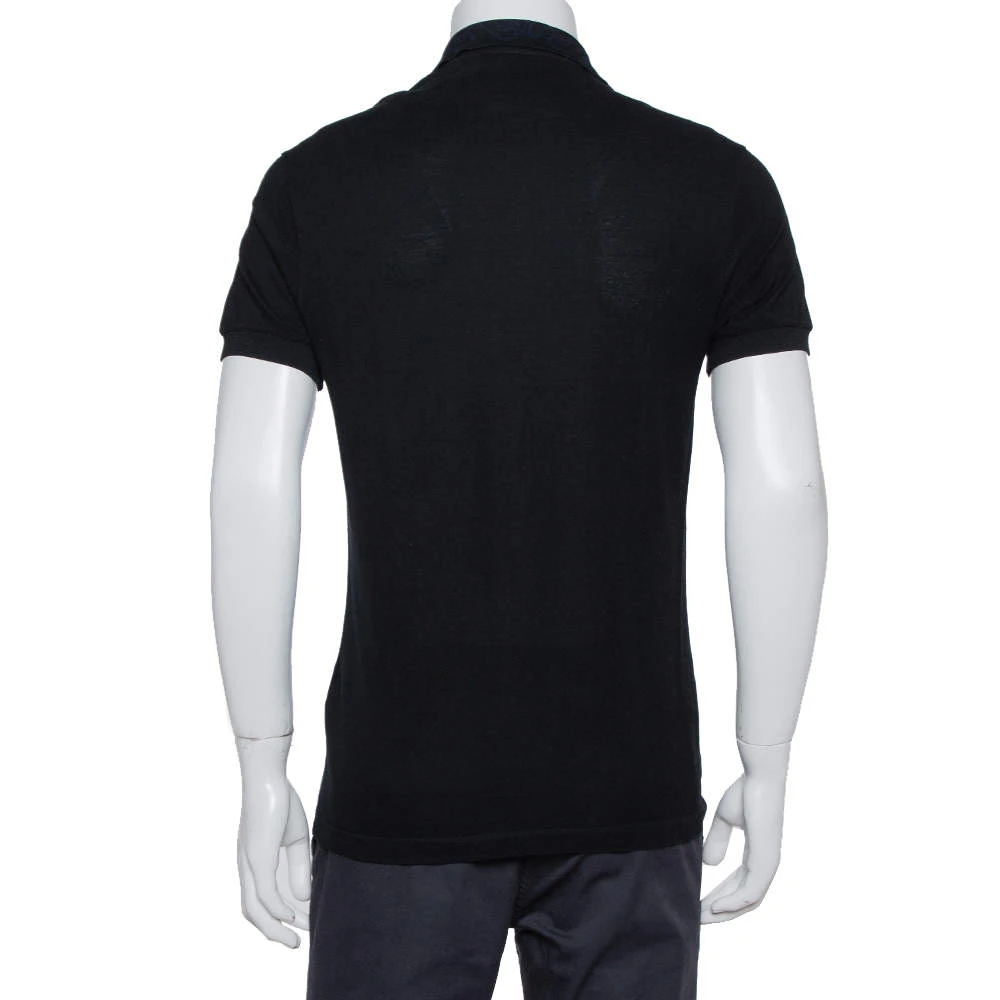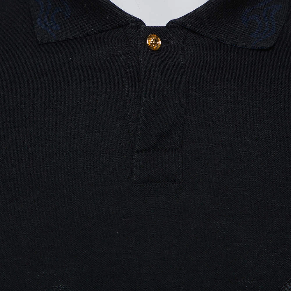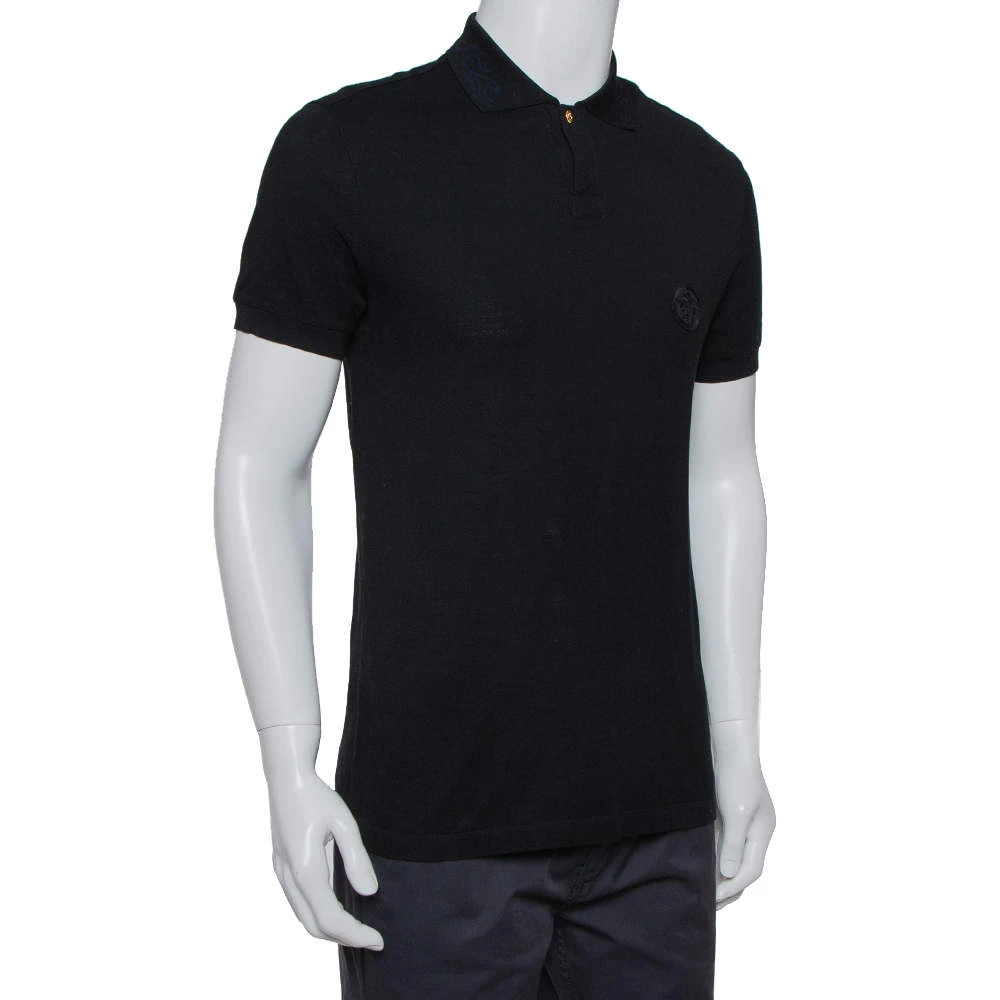 This Polo T-shirt from Versace offers an amazing fit! It is made of 100% cotton and features the classic collars with a contrasting design pattern, the iconic Medusa logo detailing on the front, short sleeves, and button fastenings. It will look best with casual jeans and sneakers.