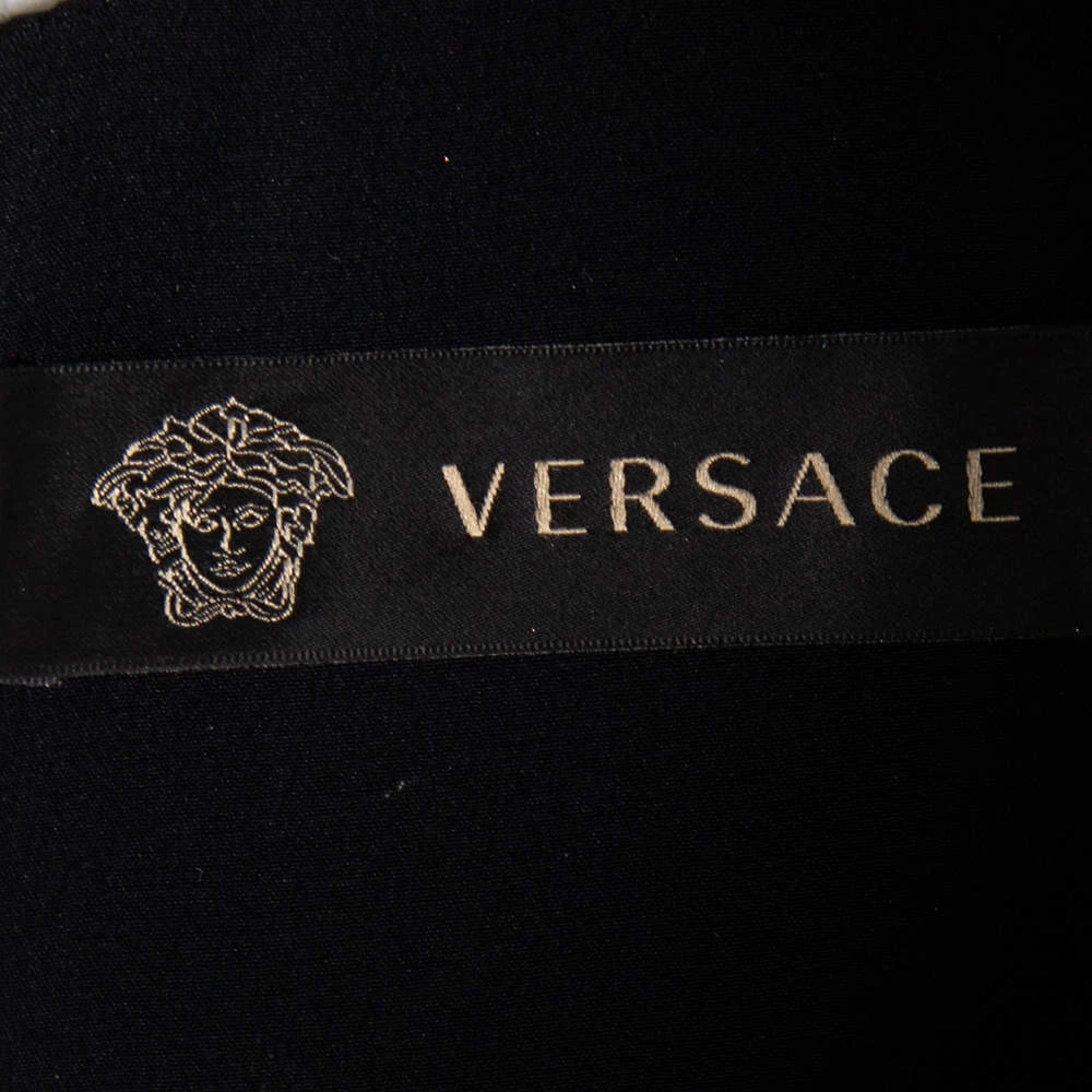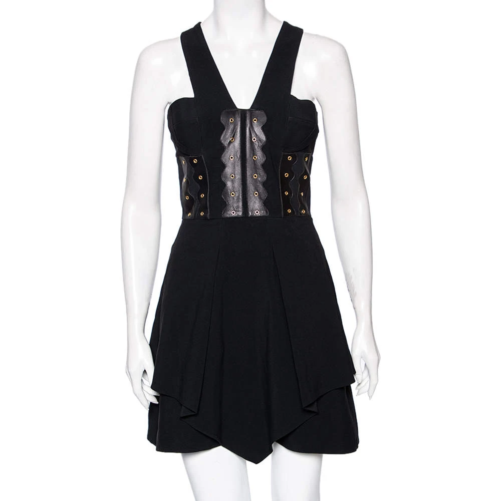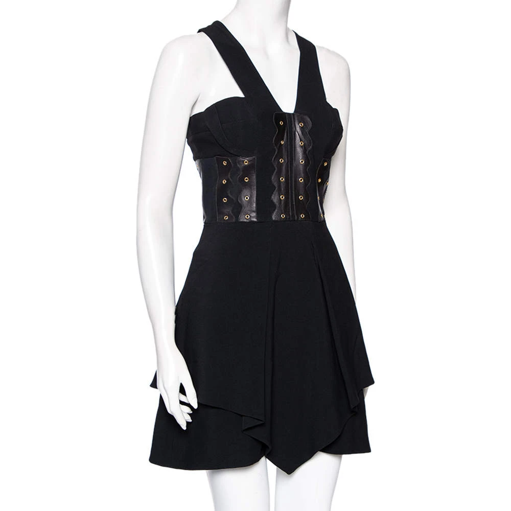 Start your evening on a classy note as you step out in this breathtaking short dress from Versace. Characterized by its impeccable eyelet leather trim detail, this black crepe dress will look unique every time you wear it. Pair this dress with black pumps and look mesmerizing.