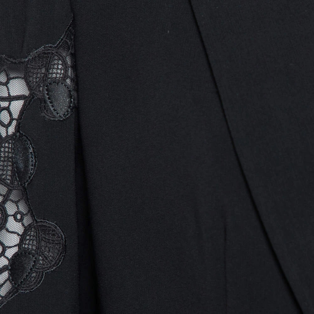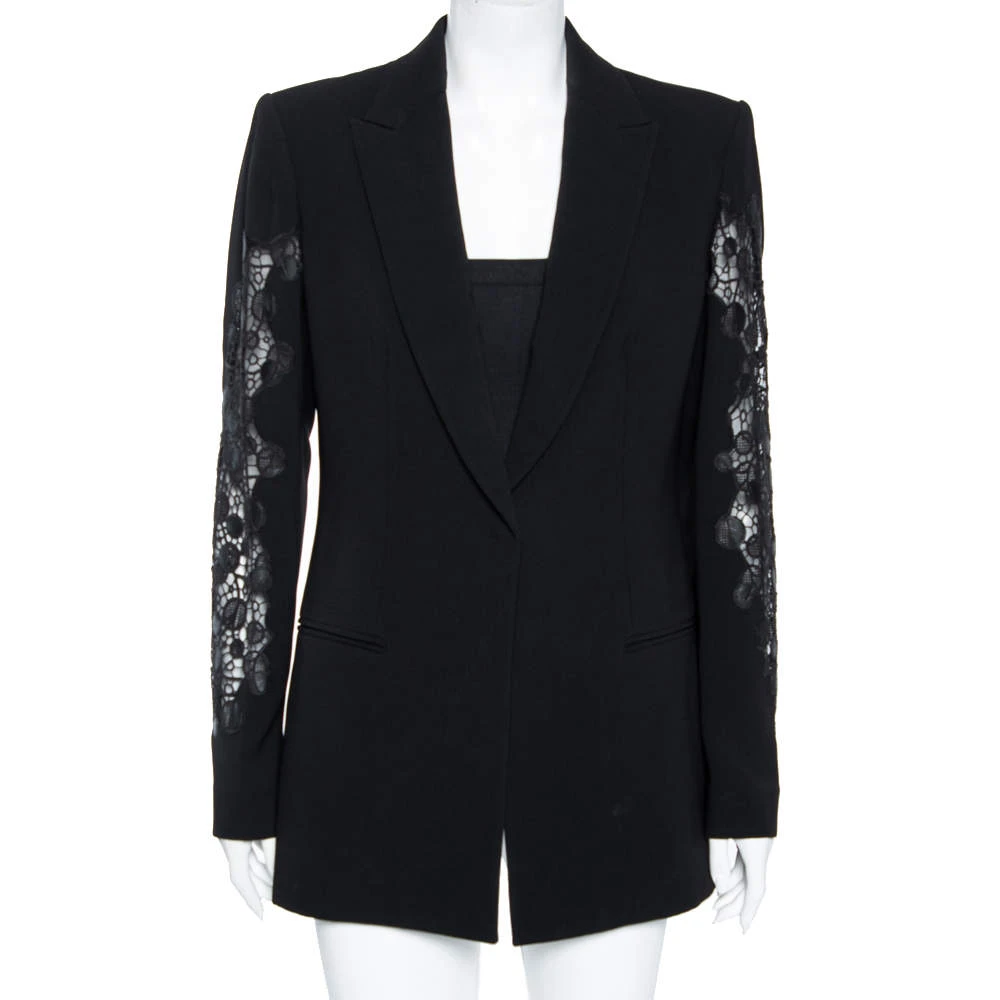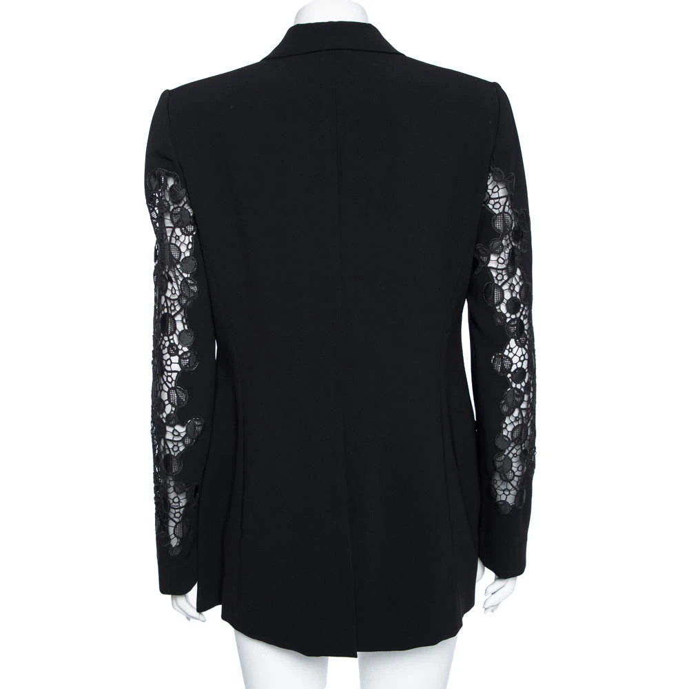 Be fashionably bold with a touch of finesse as you style this fabulous blazer from the House of Versace. It has been tailored using black crepe, which is enhanced by lace inset details. It features a single-breasted style, buttoned closure, and three external pockets. Look classy wearing this blazer!