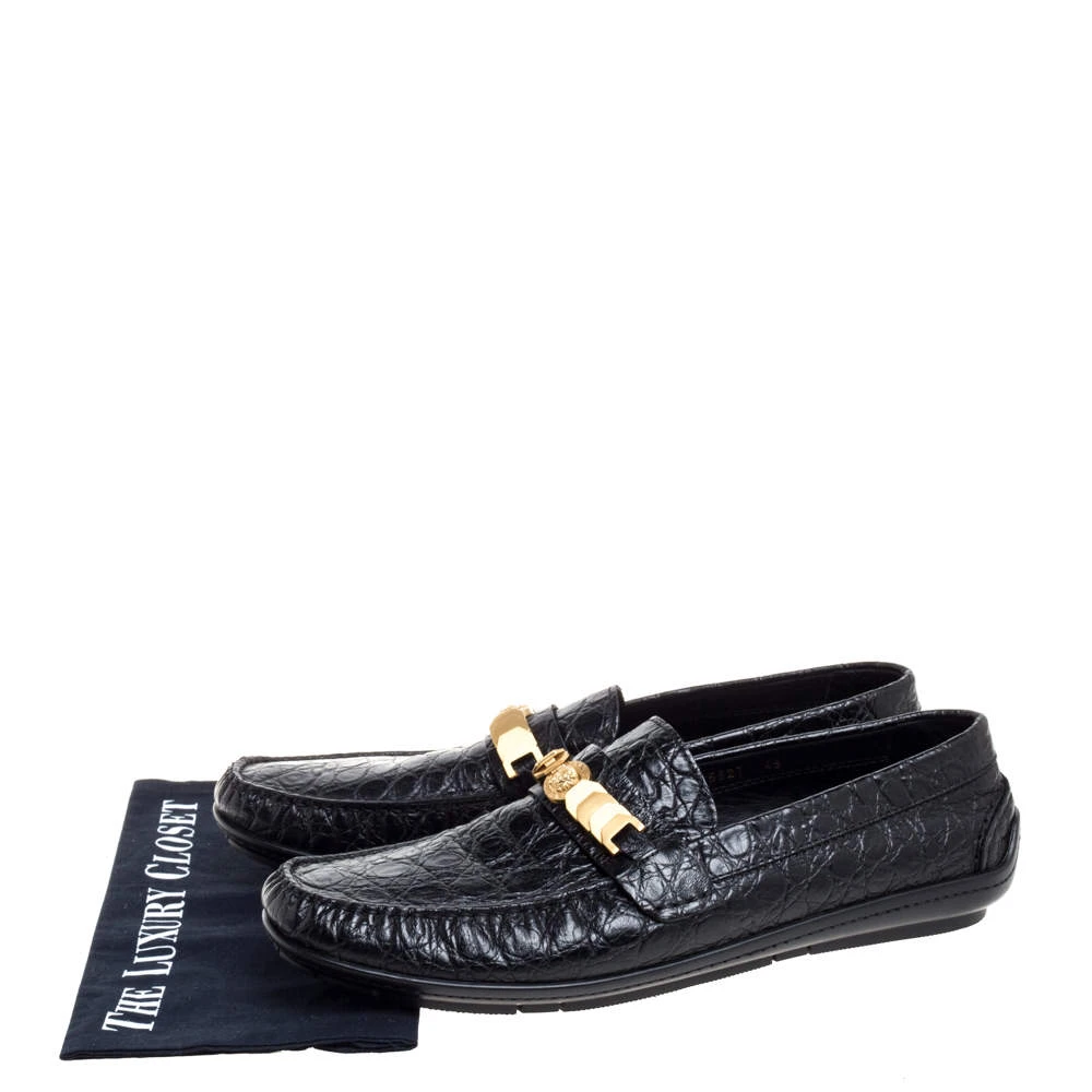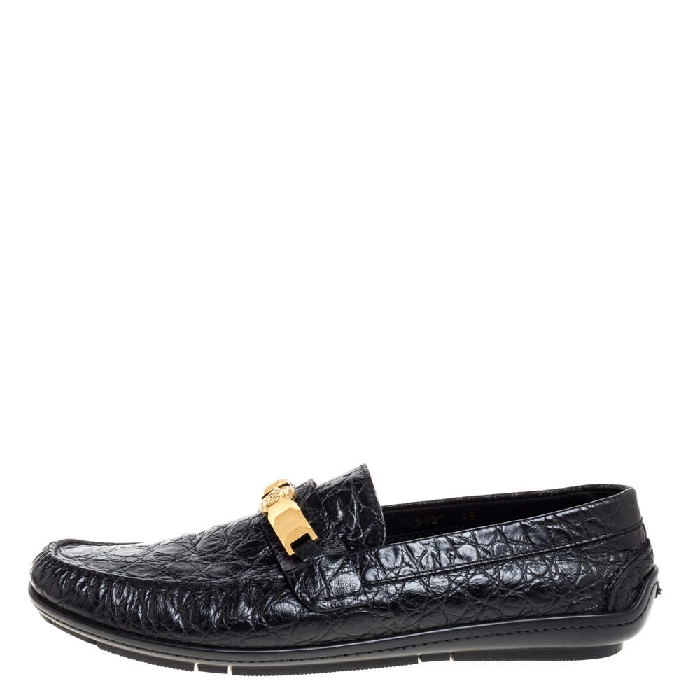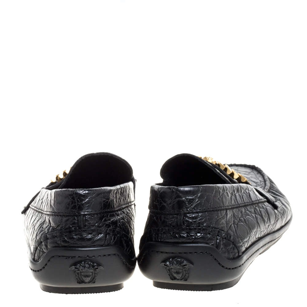 Incredibly stylish and statement-making, this pair of loafers from Versace is worth owning! The black loafers are crafted from croc-embossed leather and feature round toes. They have been styled with the signature gold-tone Medusa logo and chain detailed straps on the vamps and come endowed with comfortable insoles. They are complete with tough rubber soles.