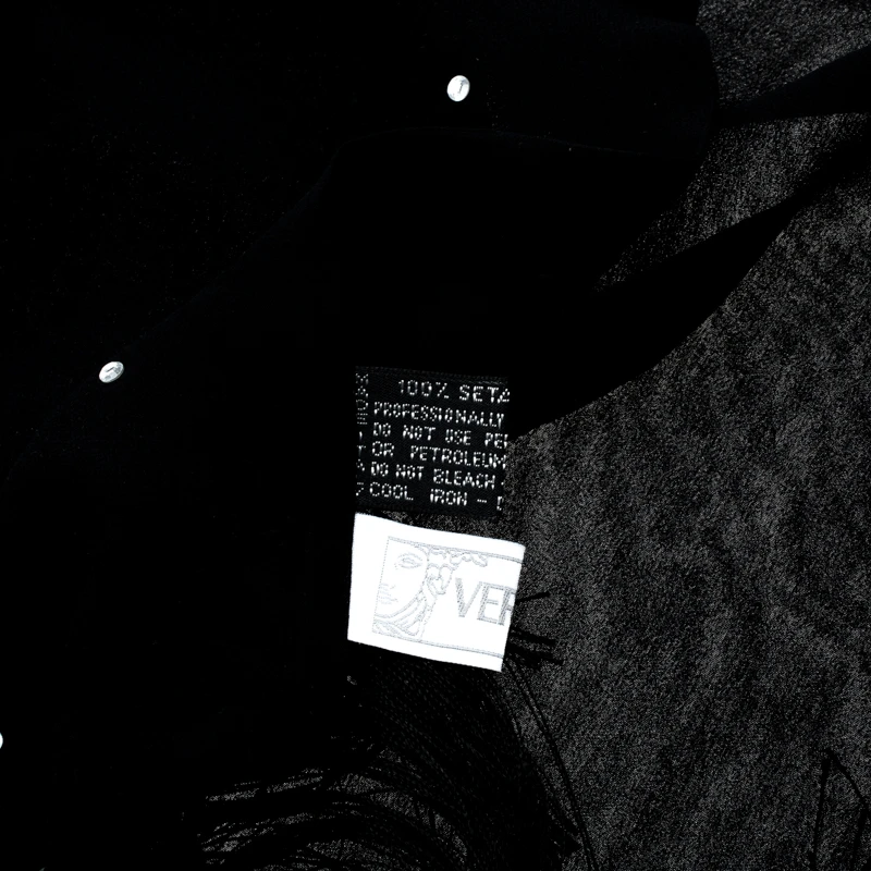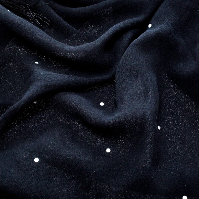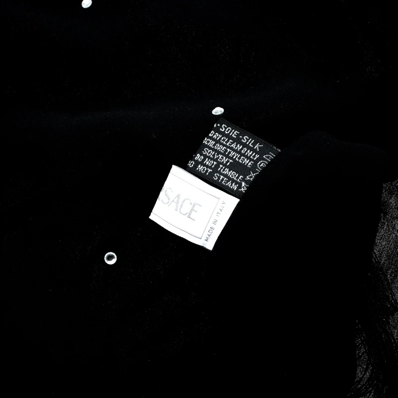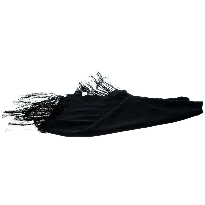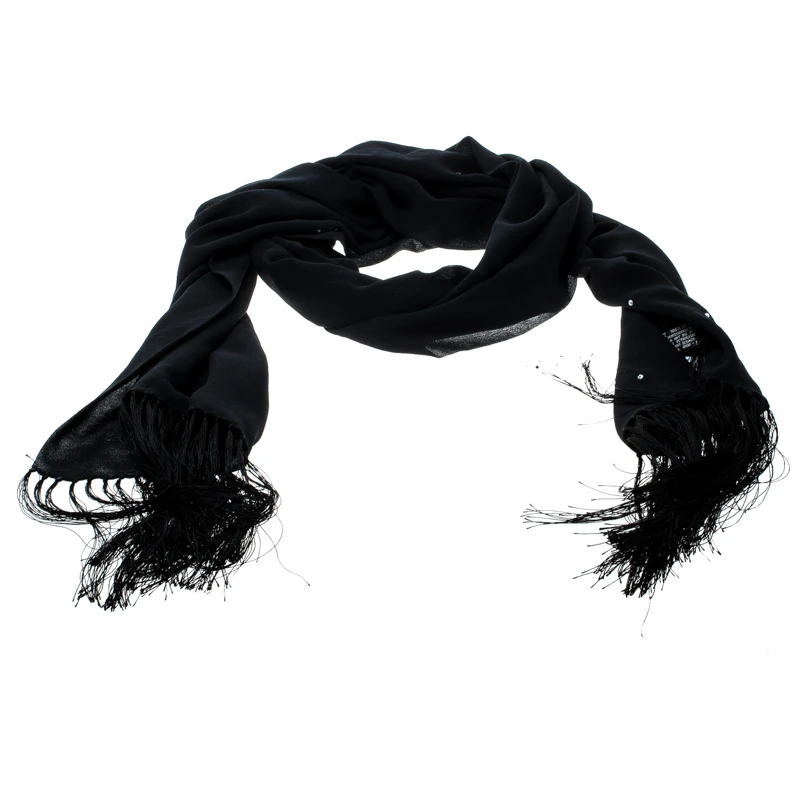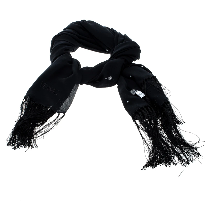 Get a style upgrade on your basic outfits with this black scarf from Versace. Cut from luscious silk, the scarf is finished with a tasselled hem and crystal embellishments all over. This versatile scarf is an asset, as it can style up almost all your entire wardrobe.