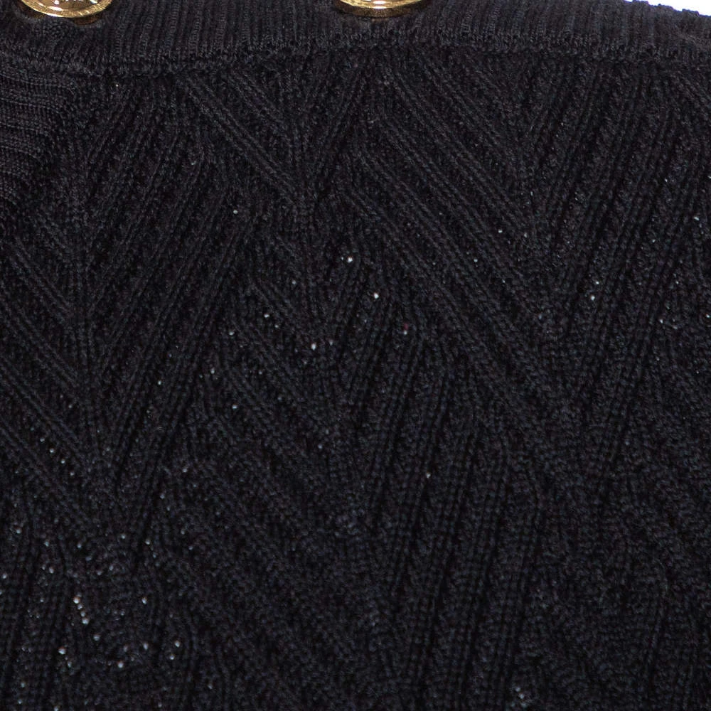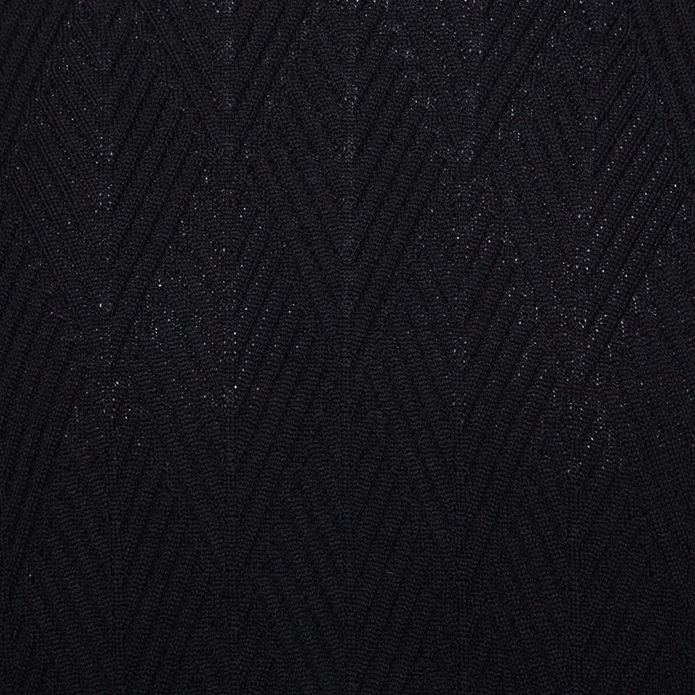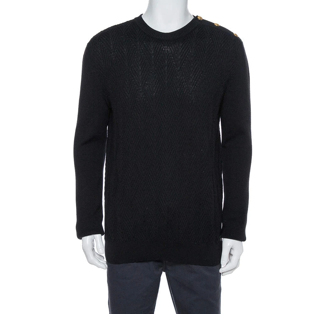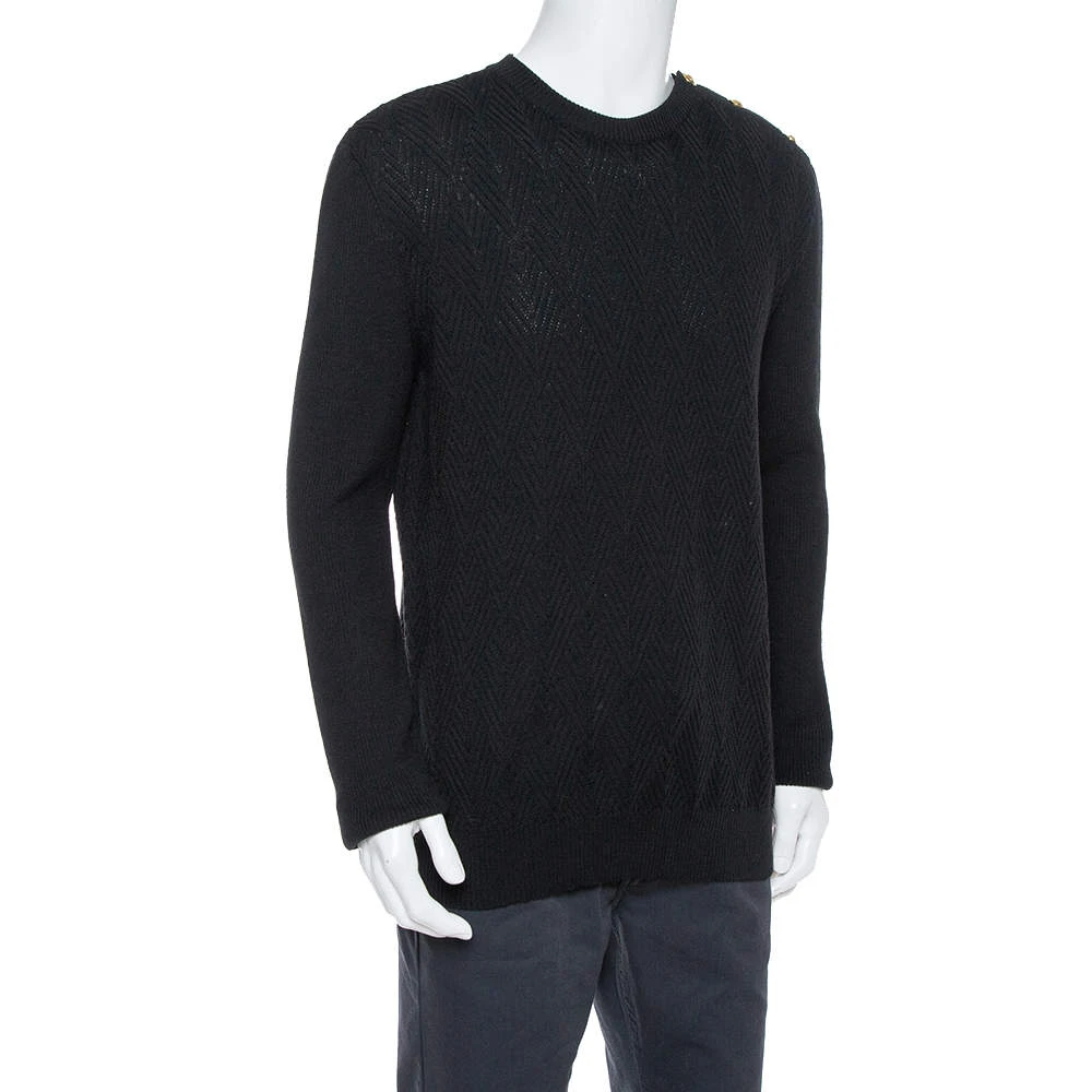 A warm, comfortable sweater by Versace that you can add to your winter wardrobe. Knit from wool, the sweater has diamond patterns in a classic black shade. The creation has long sleeves and a crew neckline.