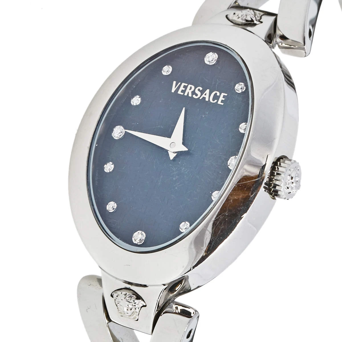 Your unique style deserves a luxurious touch like this V-Glam timepiece from Versace. Its stainless steel case has a diameter of 25 mm and a smooth bezel. The dial features two petite hands and diamond hour markers and the quartz watch is complete with a stainless steel bracelet with V-shaped links. Equipped with a water resistance of 30 meters, this stunner will look perfect on the wrist of a watch lover like you!