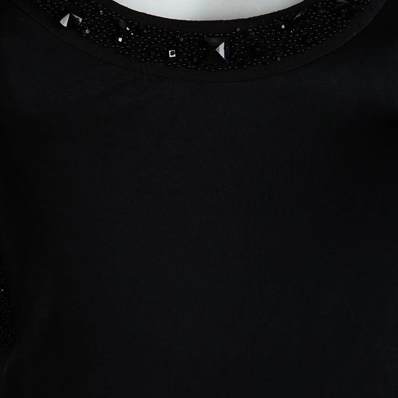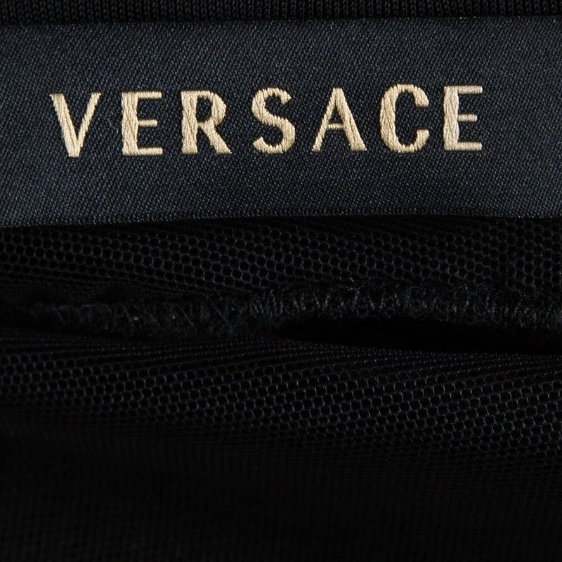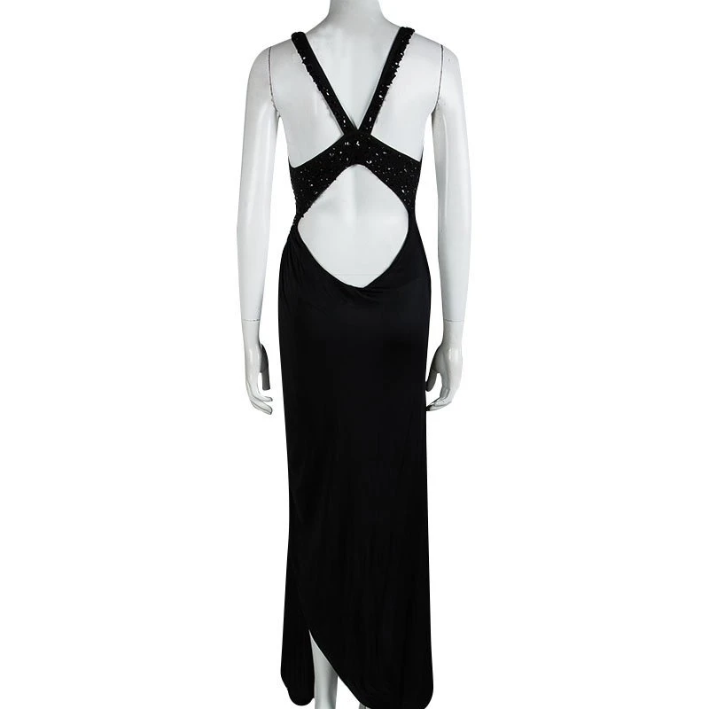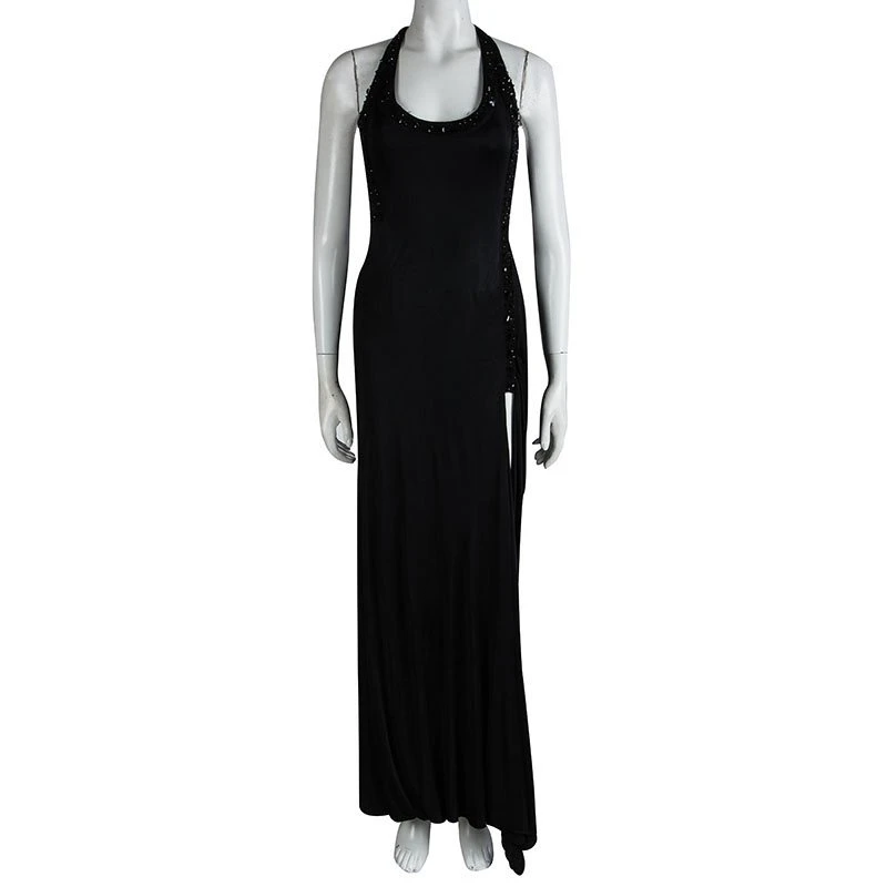 Want to be a fashion Diva? Slide into this stunning gown in the royal black hue. A true head turner dress by Versace is embellished with complimenting beads and studs on the neck and the left side. The side cut out detail with deep halter design in this designer piece offers you an iconic appearance at the cocktail night or even at the dinner date with your beloved.