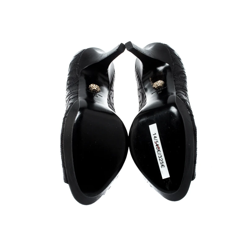 Made from luxurious leather with a subtle embroidery all over, these pumps add an edge to your personality. This pair from the house of Versace is just what you need to take your style quotient a few notches higher. Make a confident style statement when you go out wearing these cool black, peep-toe pumps.