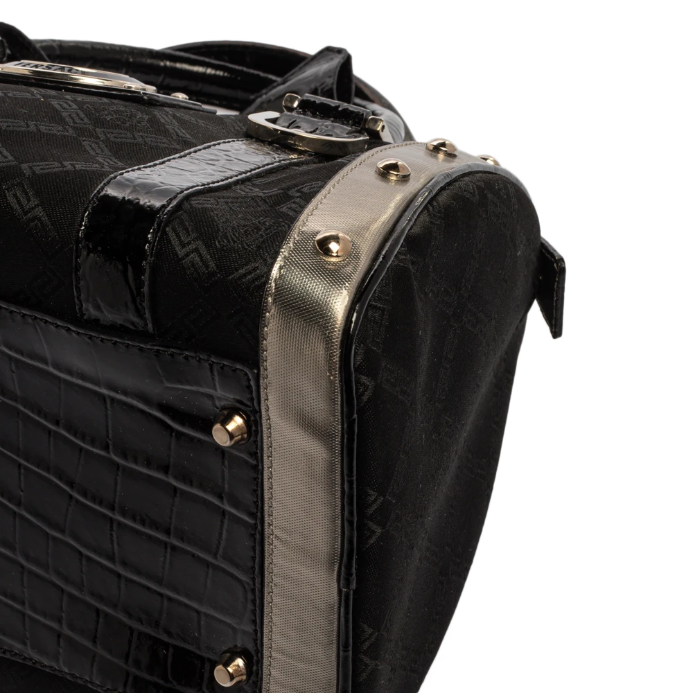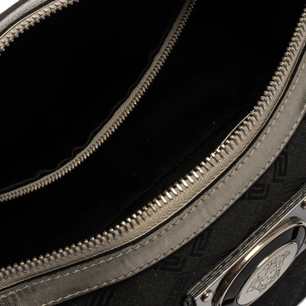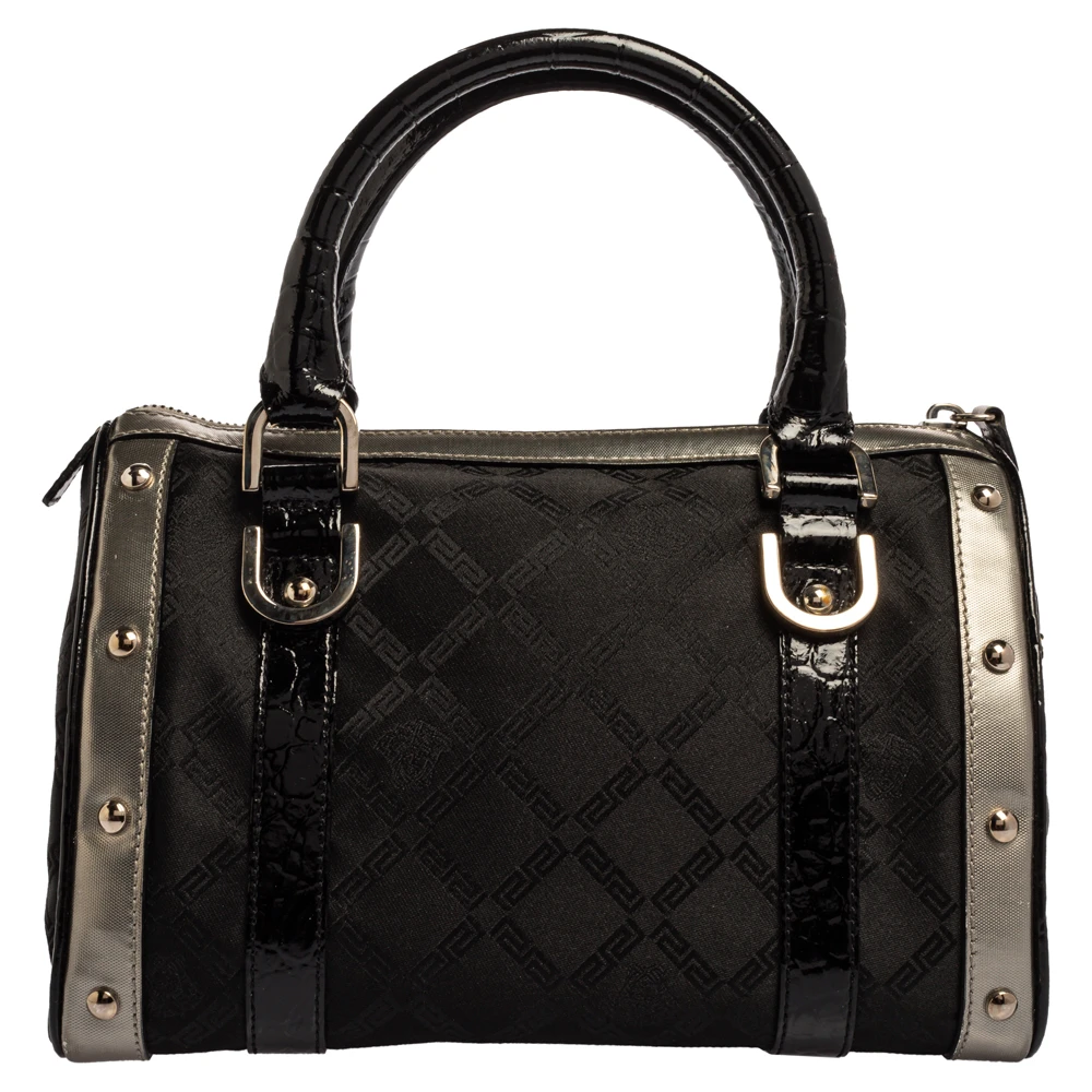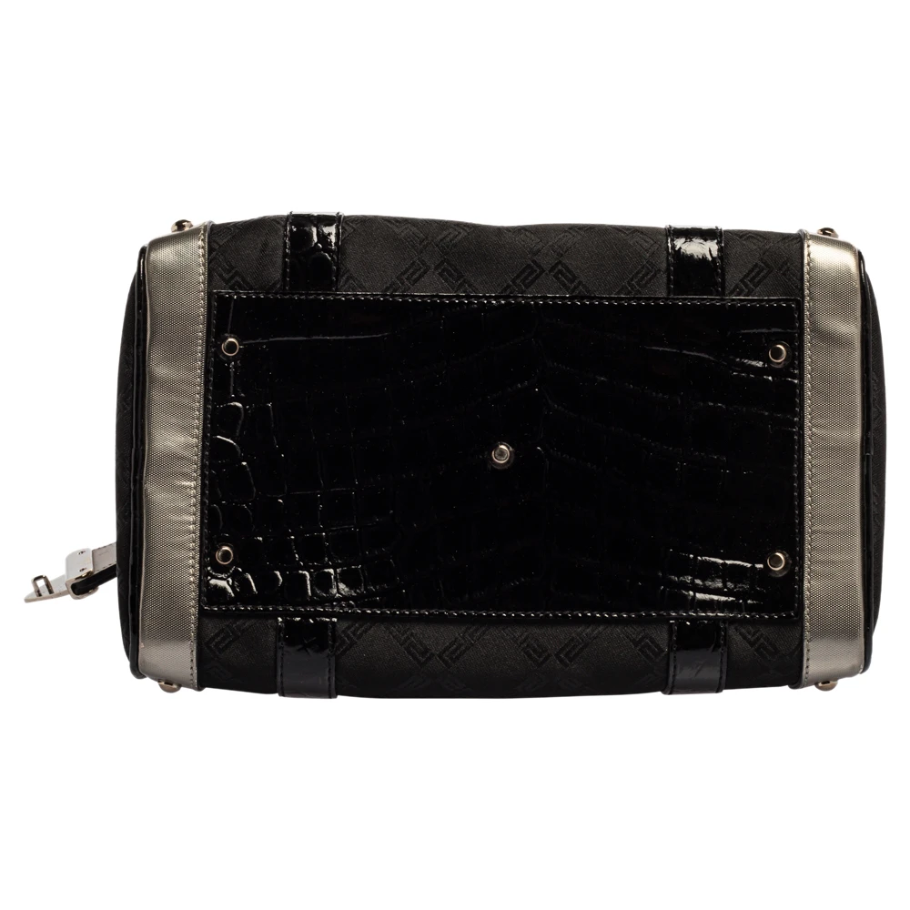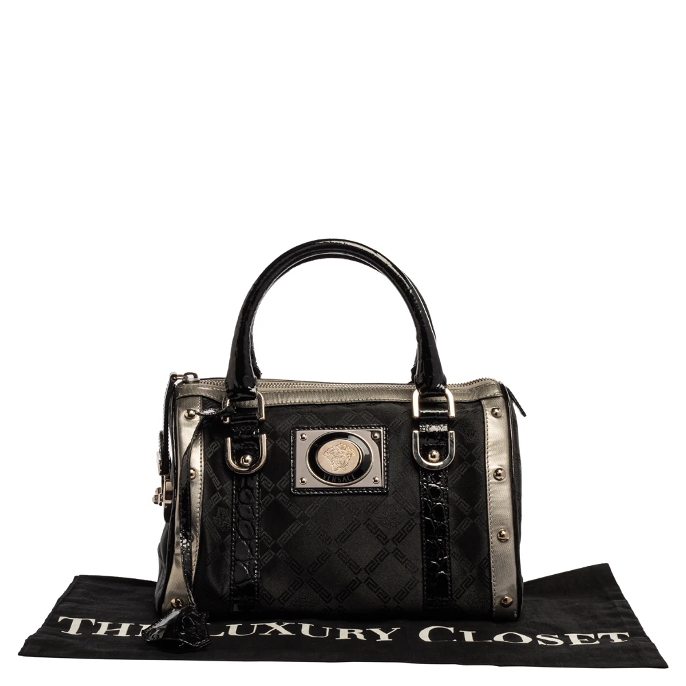 This Versace satchel is a symbol of style and reliability. This black bag is crafted from fabric and leather. It is equipped with a wel-sized nylon interior, two handles, and silver-tone hardware.