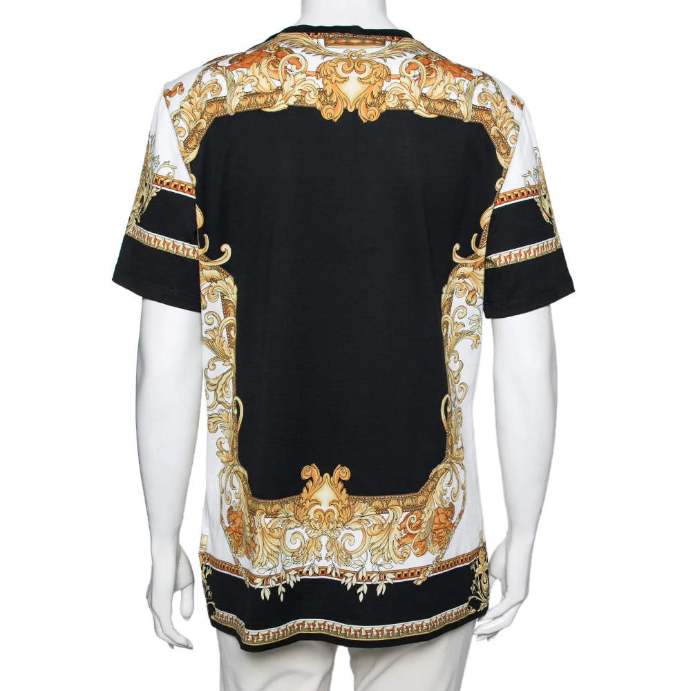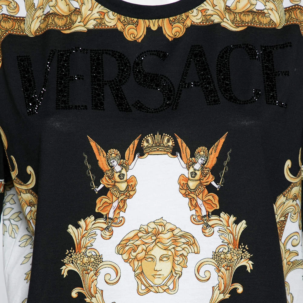 With its signature design, this top from Versace will be your favorite pick! It is designed using black-gold cotton fabric, highlighted with a crystal logo embellishment and a Medusa Renaissance print. It showcases short sleeves. Pair this top with contrasting trousers.