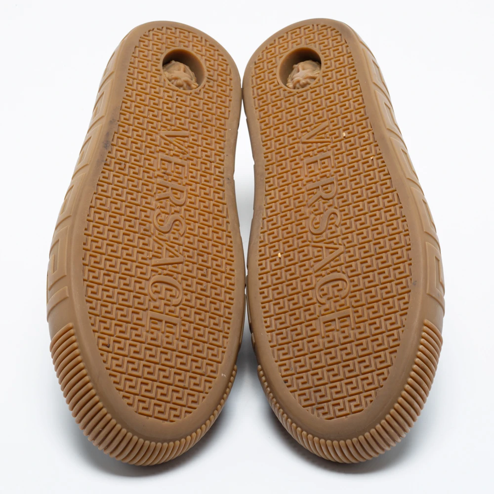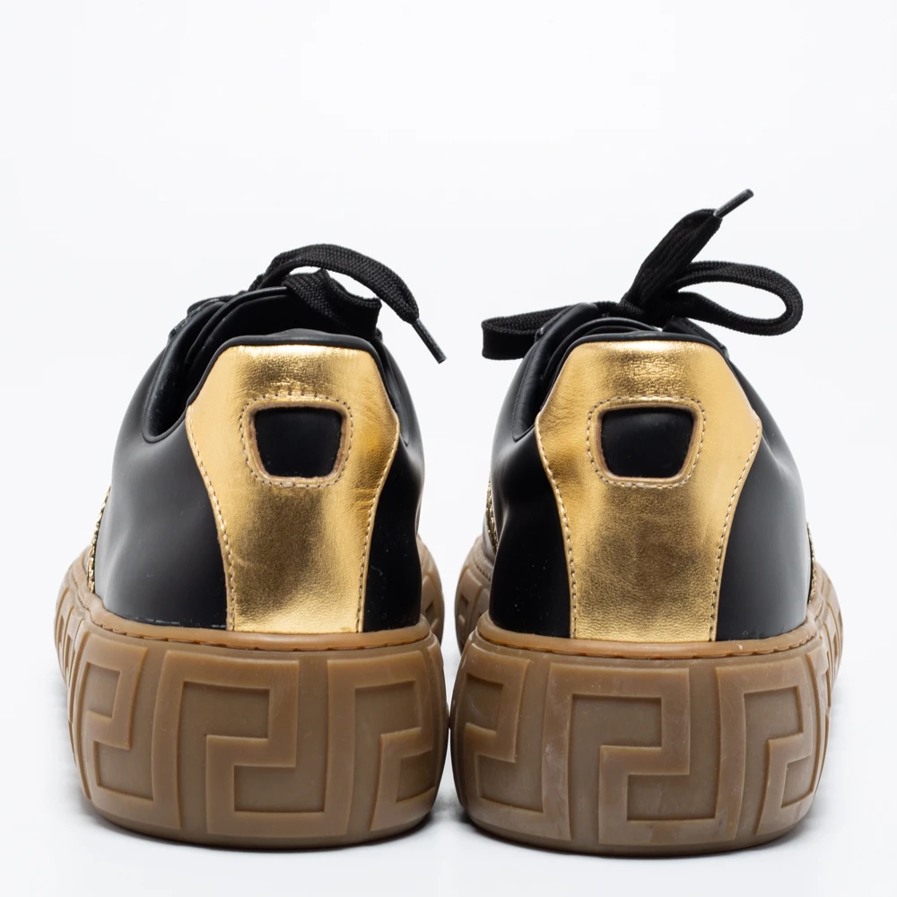 Sneakers as sturdy, stunning, and stylish are hard to find. Thanks to Versace, you can own a great pair. These Greca sneakers are crafted from black-gold leather into a classic low-top silhouette. They are highlighted with lace-up fastenings and logo detailing. Add these trendy sneakers to your collection to sport a dapper look.