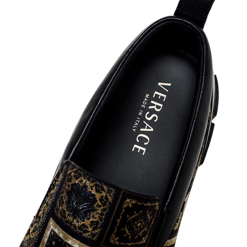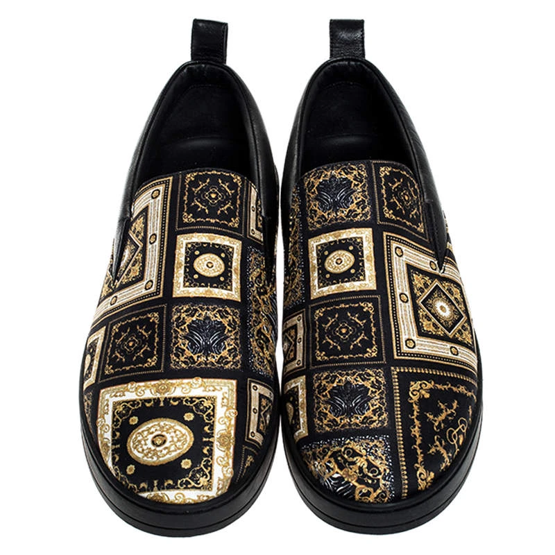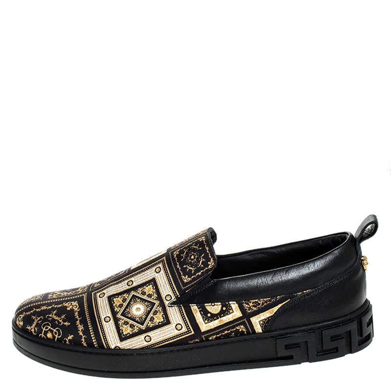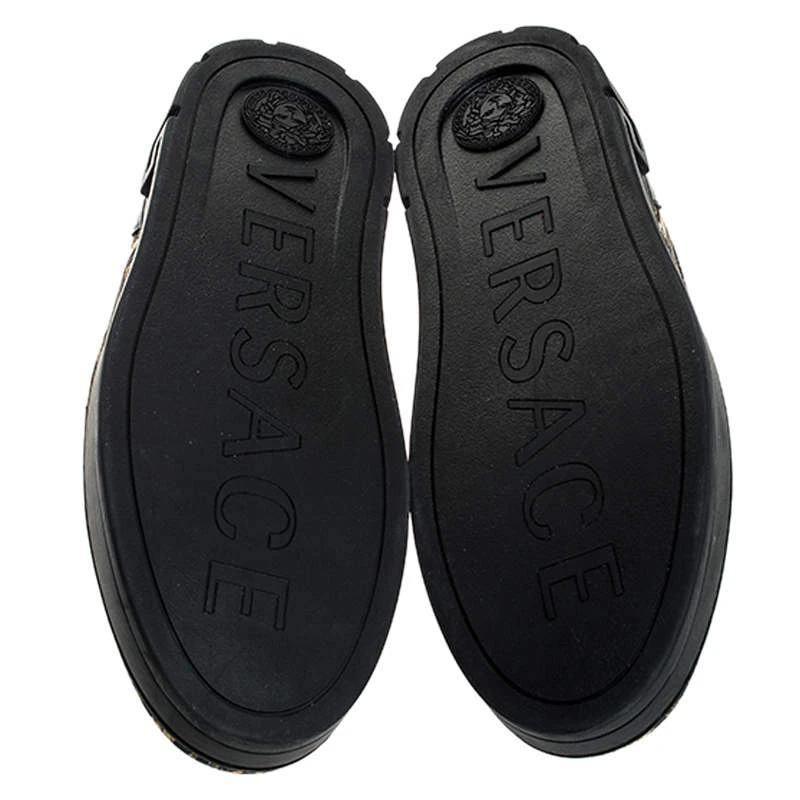 Look stylish in your casual looks with these Versace sneakers. Constructed in satin and leather, these shoes feature round toes and eye-catching prints. They are set on highly comfortable soles to assist you every day.