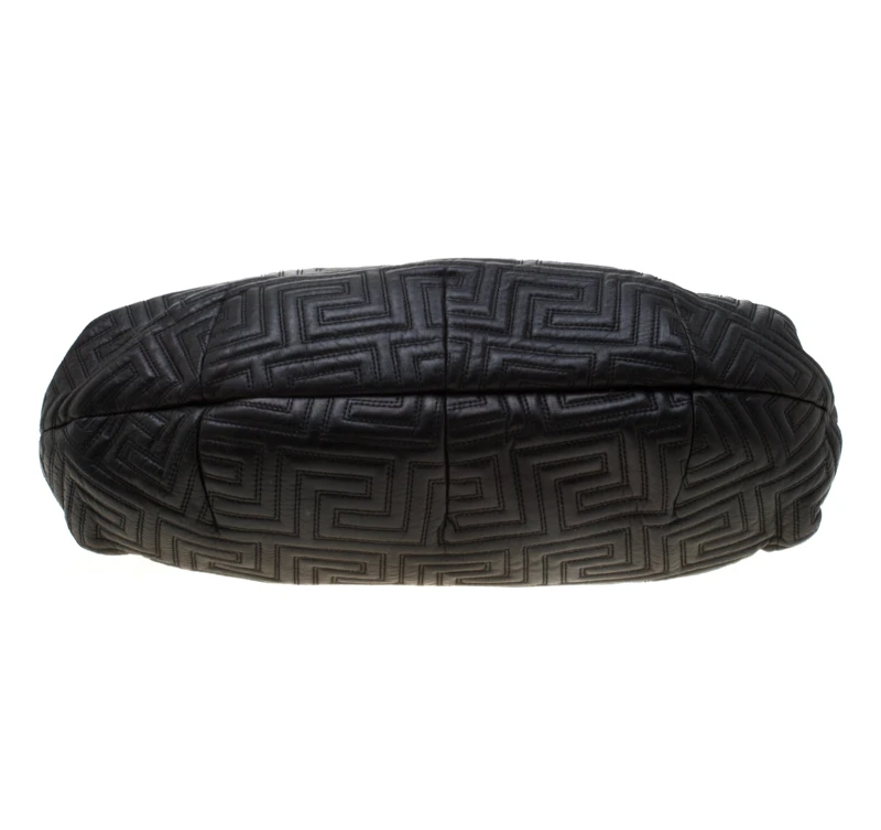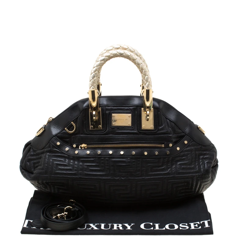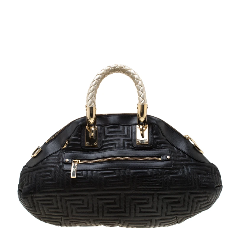 This Versace satchel carries an outstanding design and a fabulous interplay of leather and gold-tone hardware. It has a top zipper leading to a satin interior while being held by two braided handles. The quilt detailing and the brand label on the front just uplift its beauty.