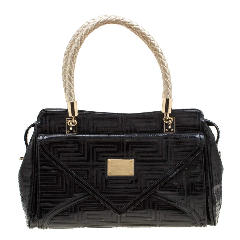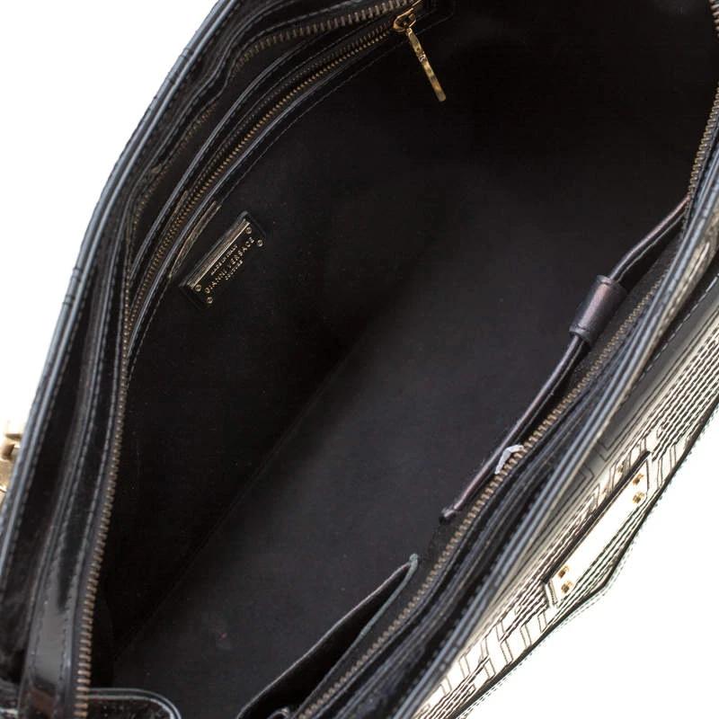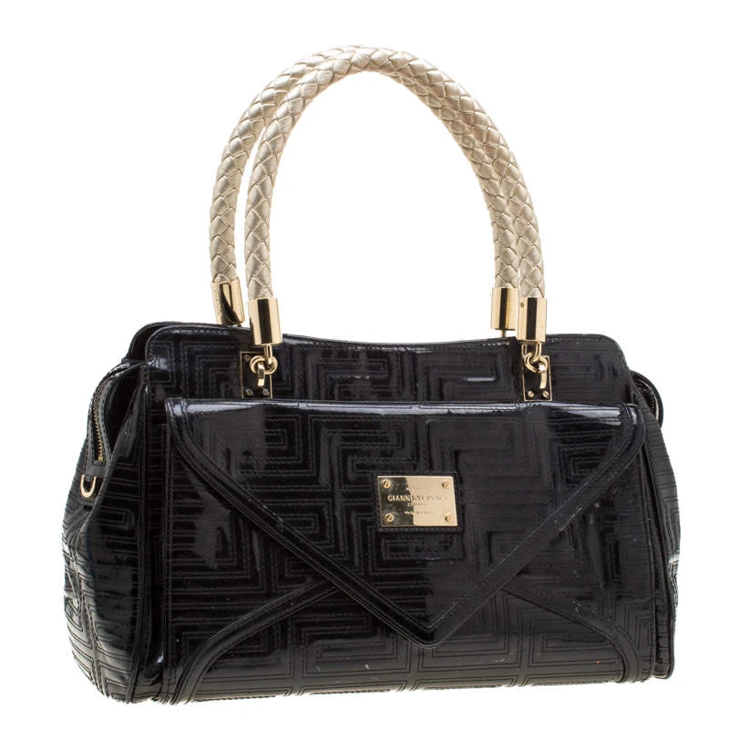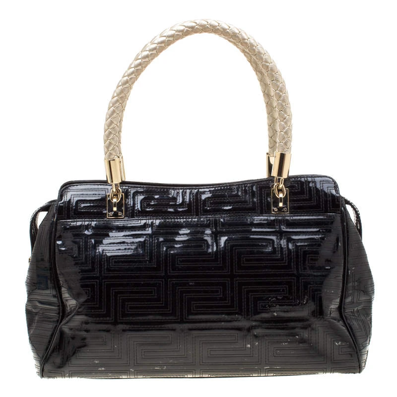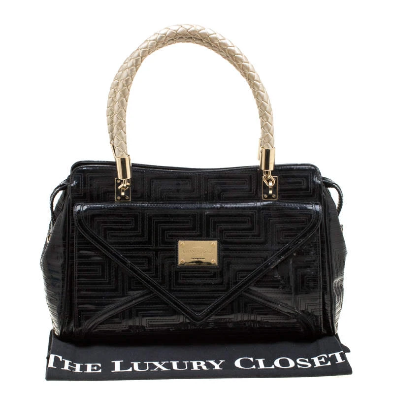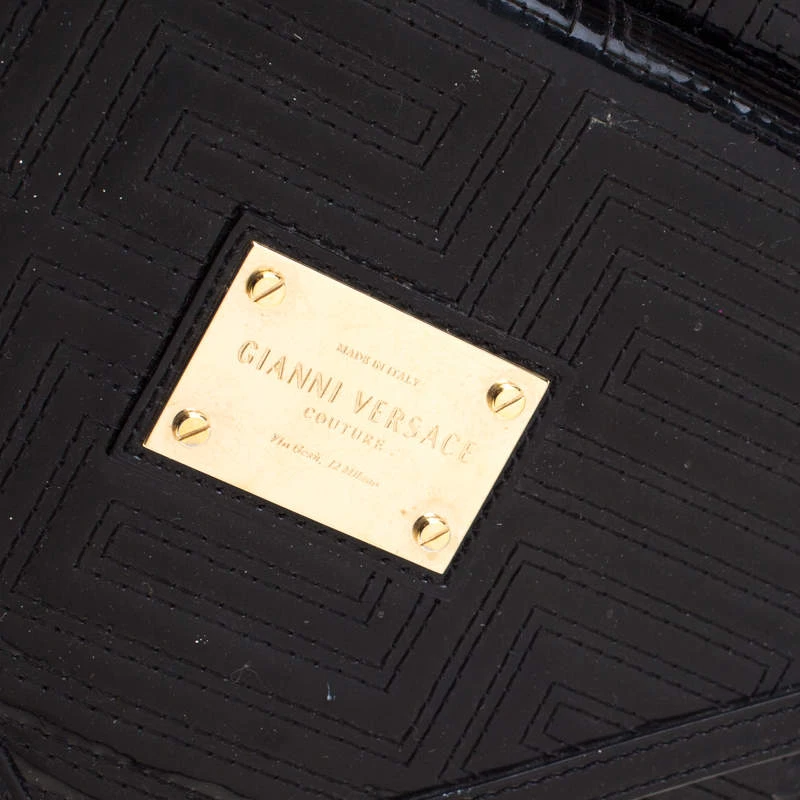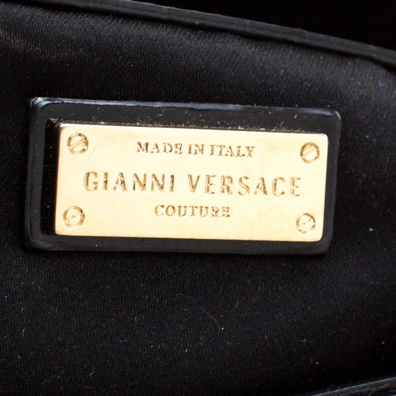 This bold and eye-catching Versace satchel is sure to make heads turn. Crafted from black quilted patent leather, the bag is accented with a gold-tone Gianni Versace Couture plate at the front. It features dual top braided handles and a top closure that opens to a satin lined interior that will hold all your necessities. The bag is complete with a flap pocket to the front and a slip pocket at the back.
