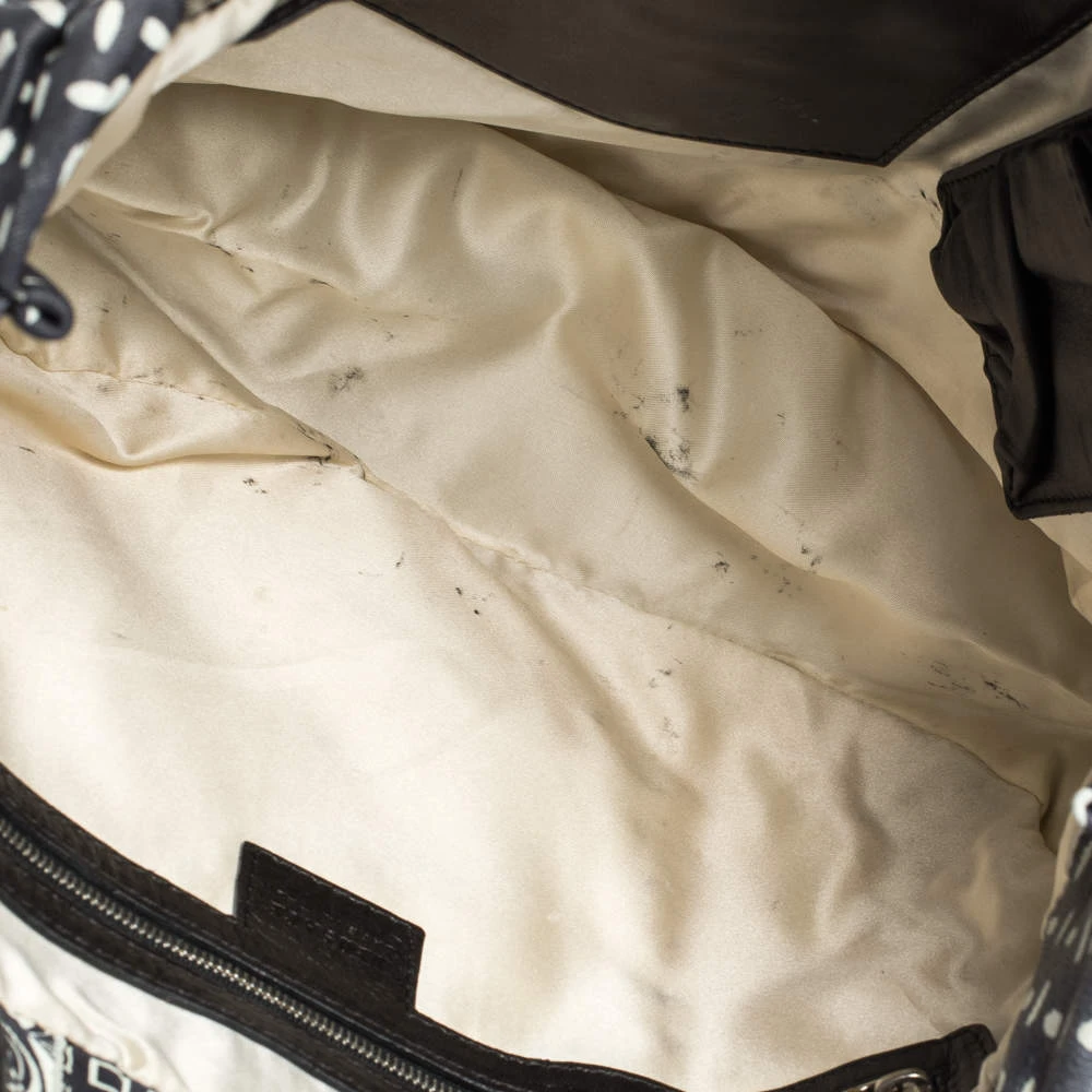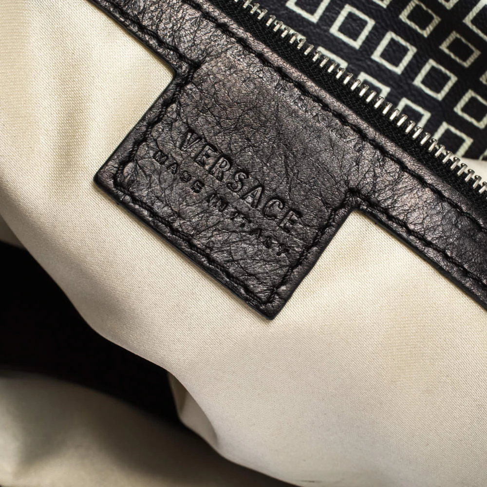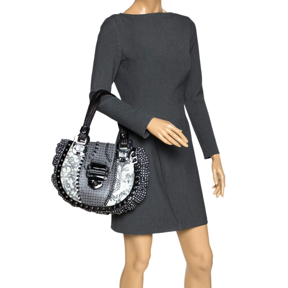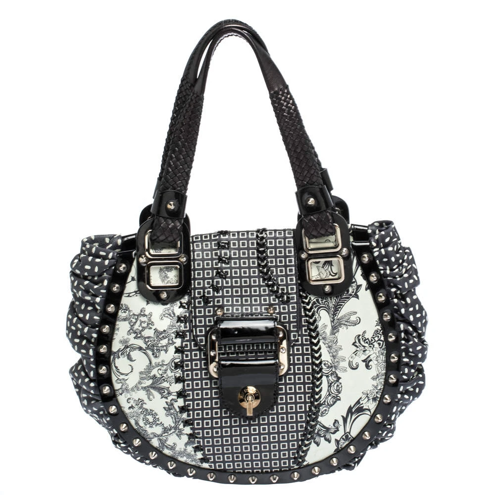 Elevate your everyday look by carrying this sleek handbag from Versace. Dress up like a style icon when you pair this black & green hobo with your outfits. Crafted from ruffled printed leather, it has a front flap, dual handles, silver-tone hardware detailing and studs and a spacious satin-lined interior with a zip pocket.