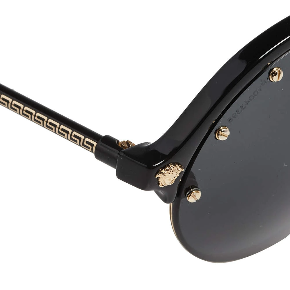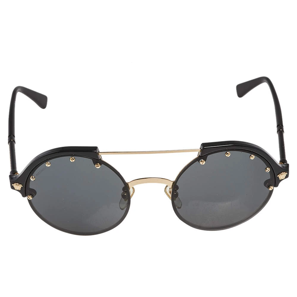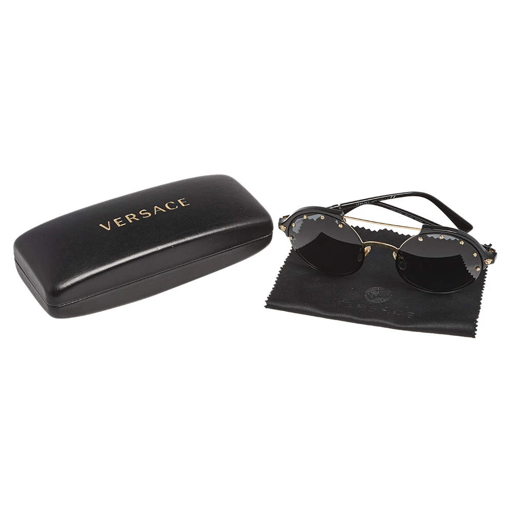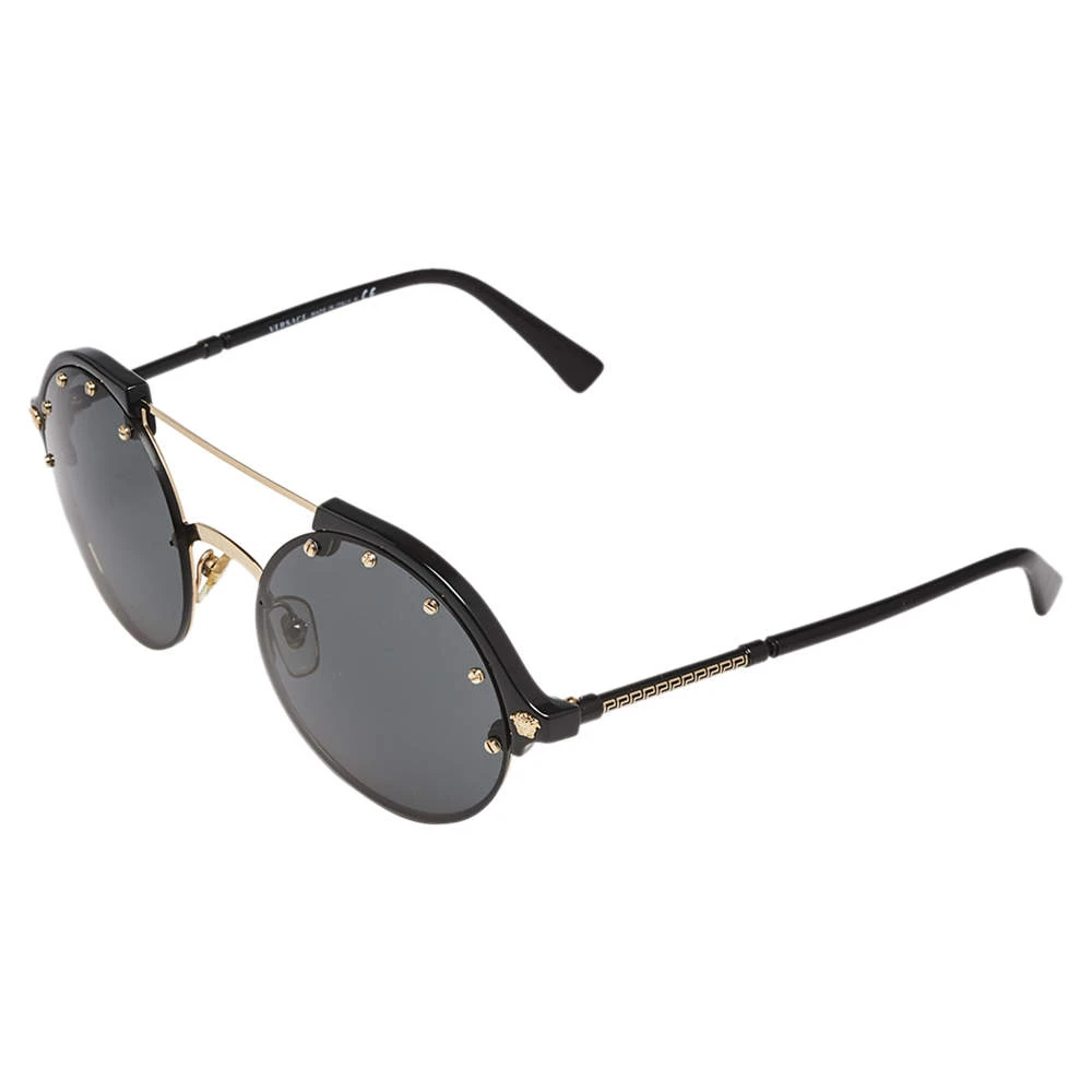 The round sunglasses by Versace have a distinct look that makes them glamorous and stylish at the same time. Flaunting a smart design with acetate and metal construction, this piece is paired with grey lenses to add a chic appeal and resist sun rays.