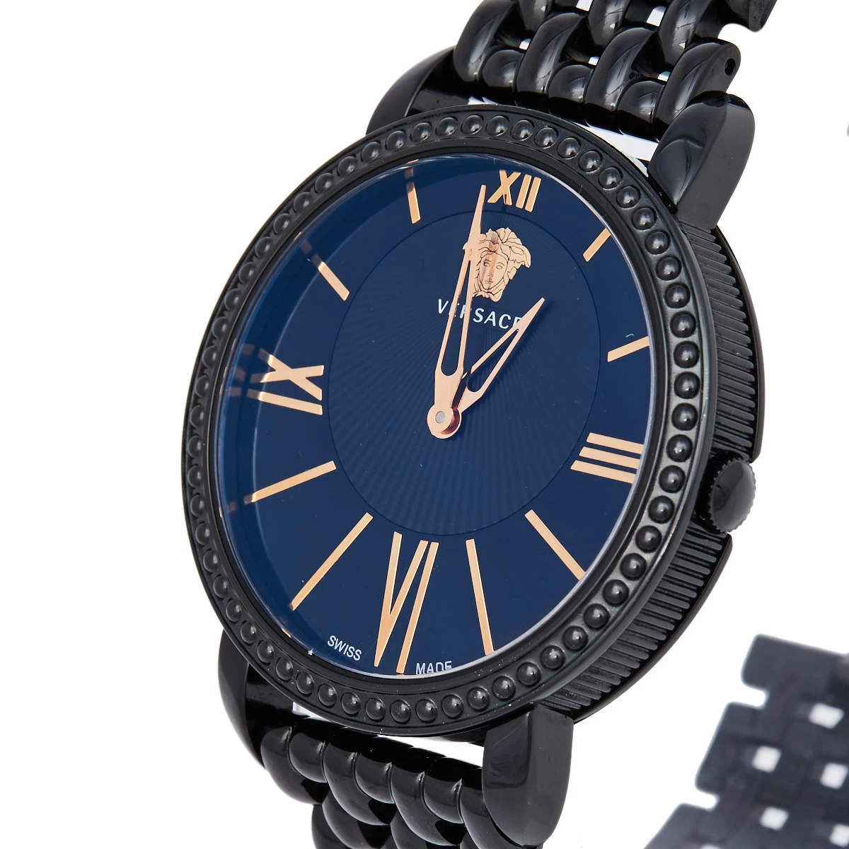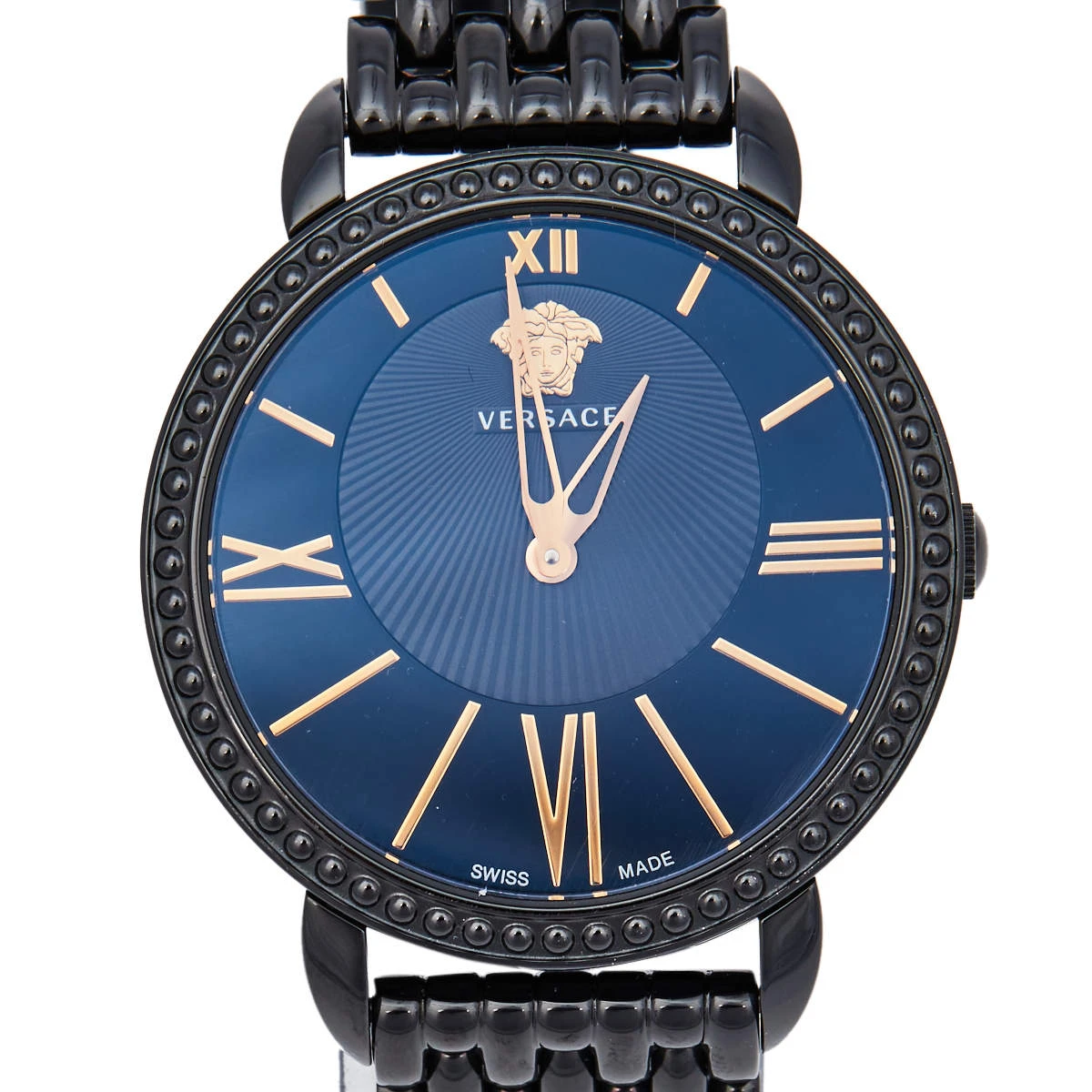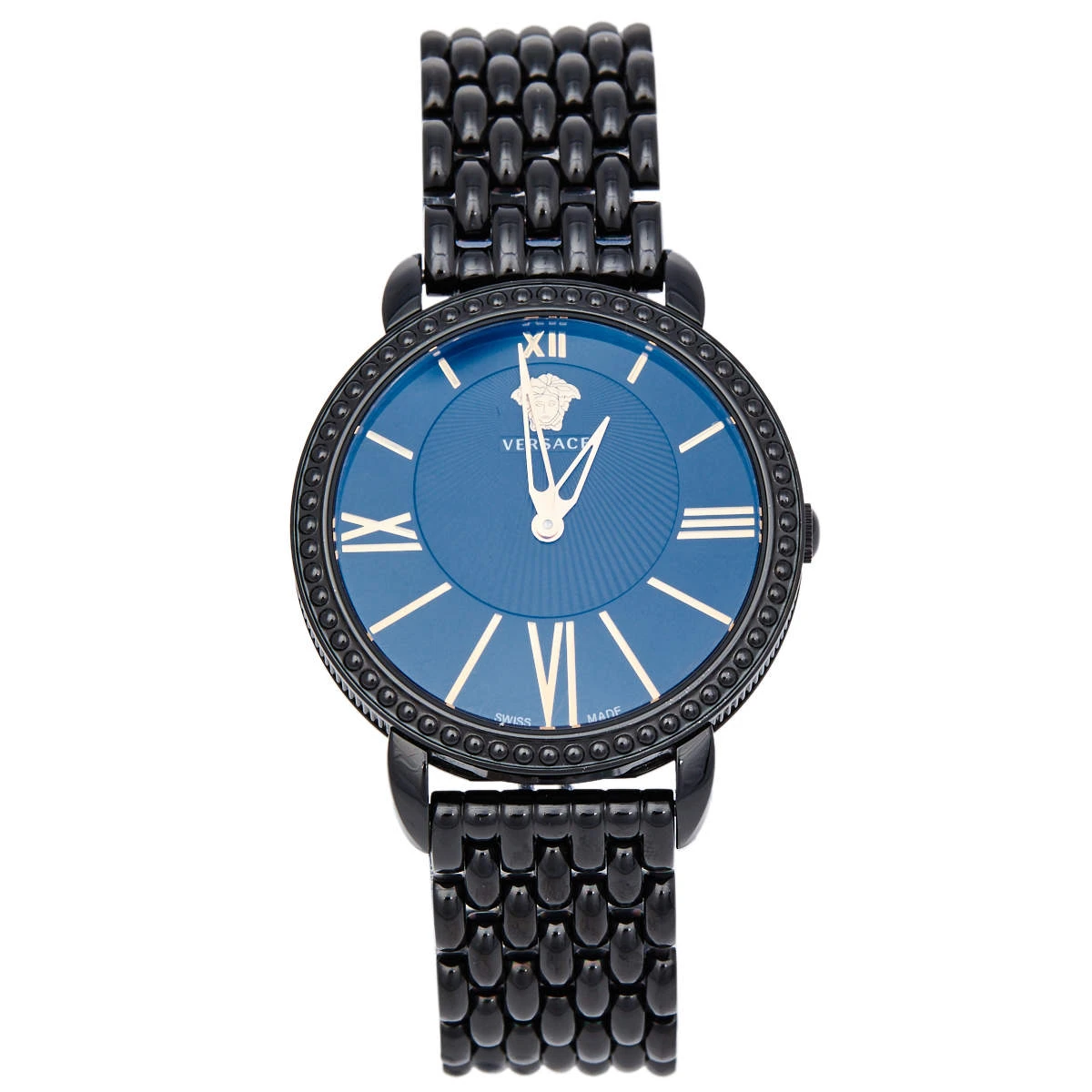 Creations from Versace promise a grand style with everything eye-catching and this Krios watch from the label demonstrates just that. The watch has an ion-plated steel case and a link bracelet secured with a concealed clasp. It is graced with a stylish hobnail bezel and fitted within is a blue dial. The dial is graced with a notable Versace Medusa logo along with index as well as Roman numeral hour markers and two hands. This quartz watch has a water resistance of up to 30 meters and will look gorgeous with your evening ensembles.