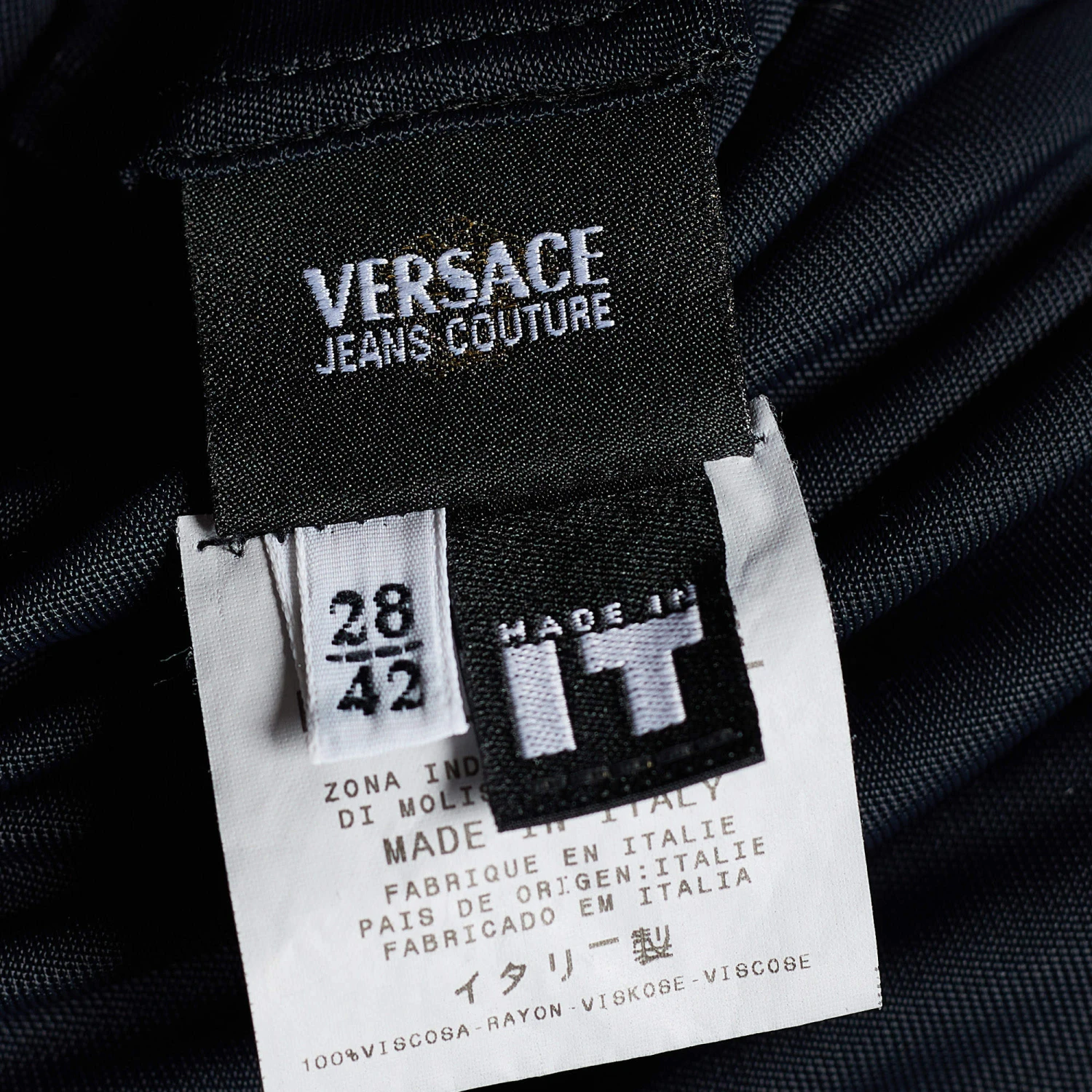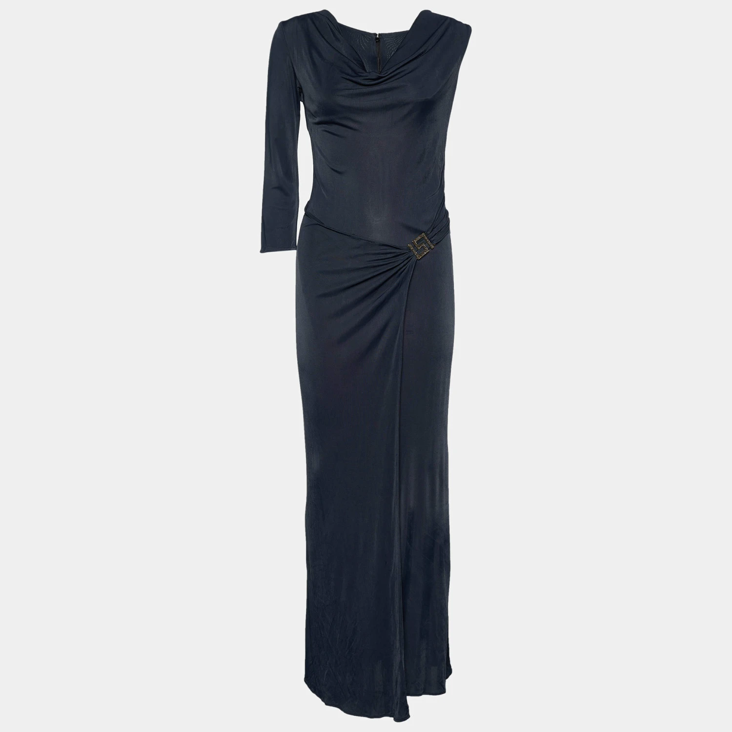 Versace’s dress is just the perfect pick to prepare for a dinner date or an evening party. Graced with cut-outs, this dress is cut from black jersey fabric and highlighted with drapes. It flaunts an embellishment on the front and a zipper for closure. With the right pair of heels, this dress will look absolutely gorgeous.