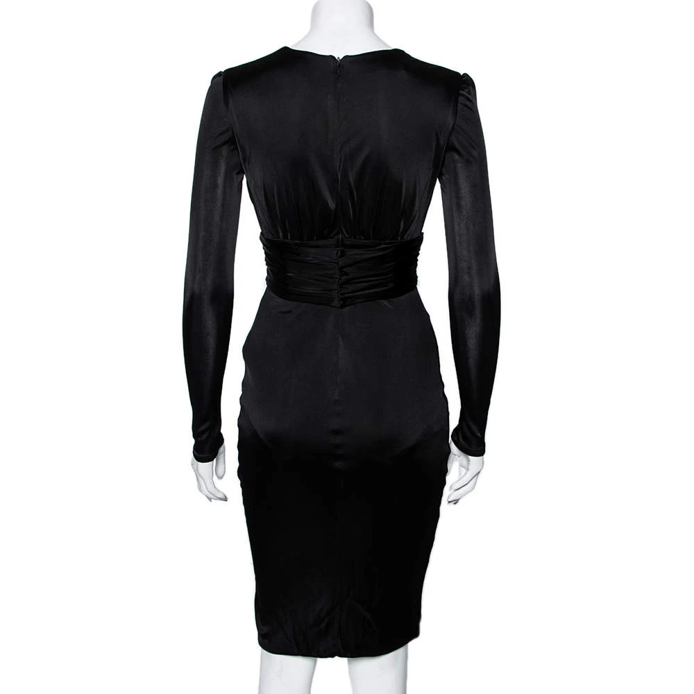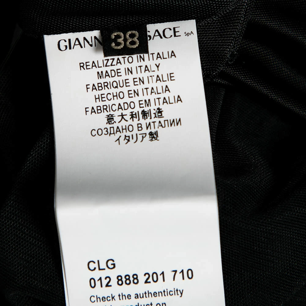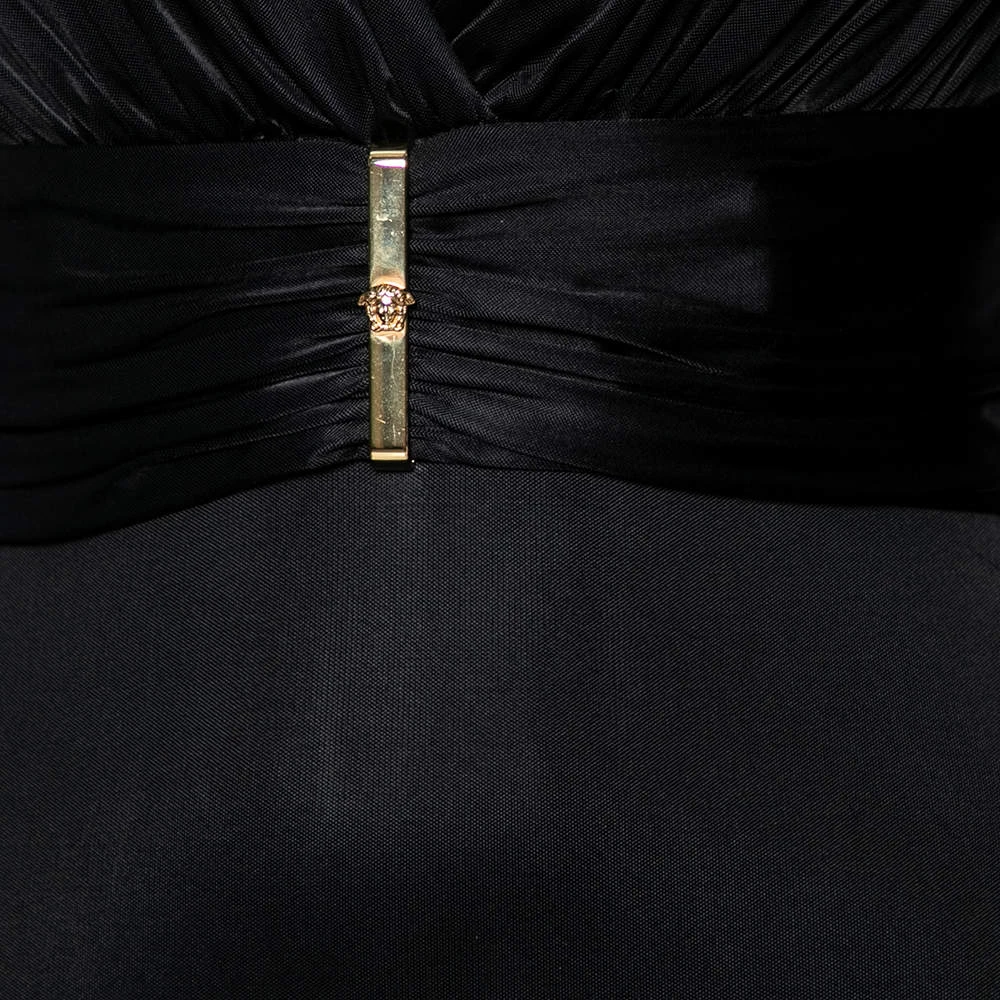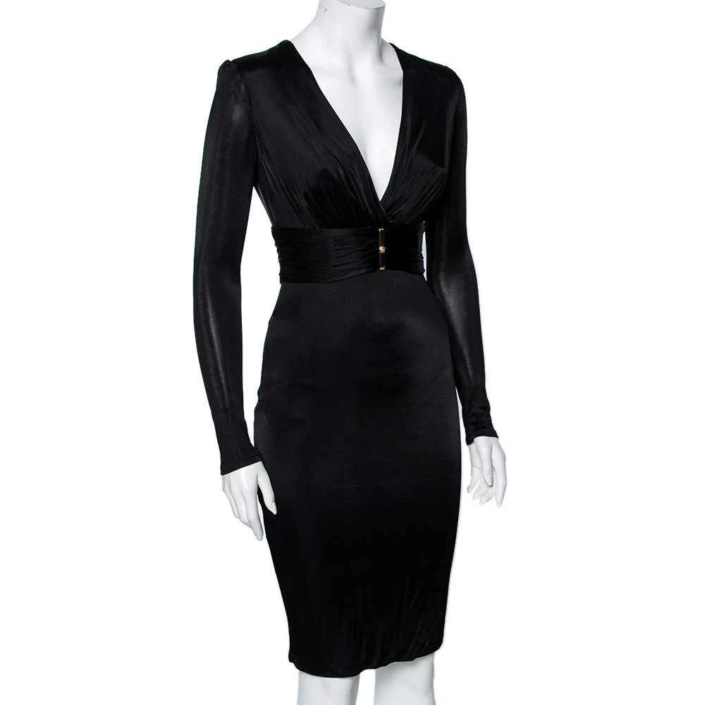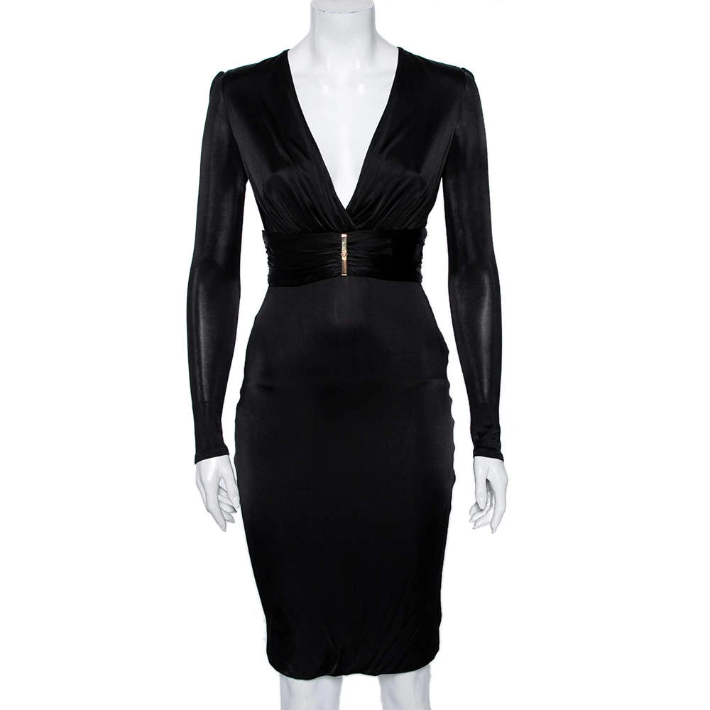 Bring Versace’s timeless charm and poise to your attire by flaunting this beautiful dress. It is fashioned in black jersey fabric into a well-fitted silhouette. It is accentuated with a steep V-shaped neckline, long sleeves, and a belted feature. Complement this stunning Versace dress with a black pair of pumps.