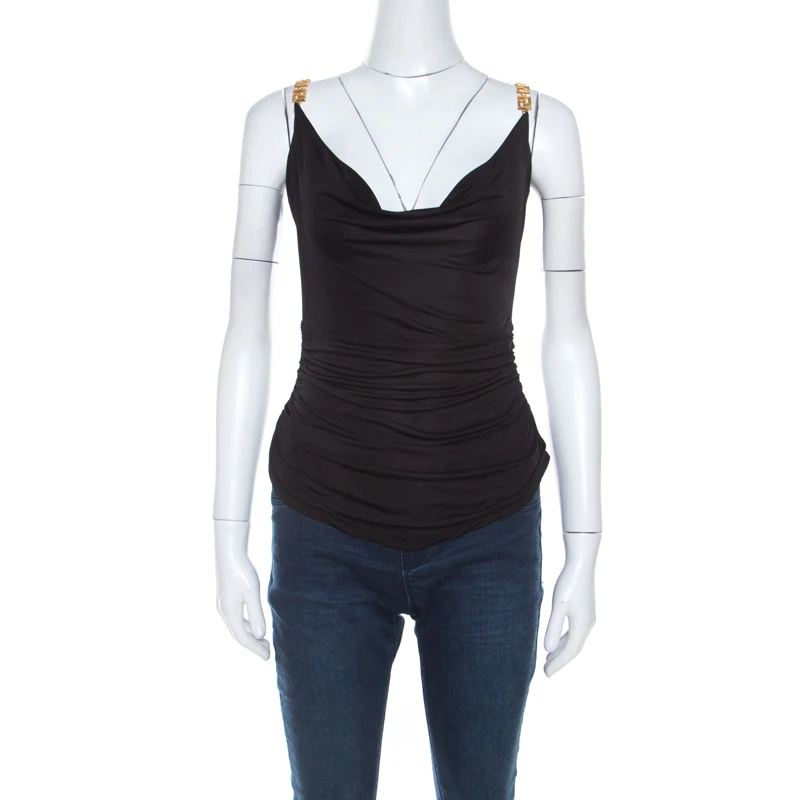 This is a classic and must-have top from Versace that lends some flair to your dressing. This splendid black piece with its gold-tone logo chain strap design is just too awesome for you to miss. This top will look good with a variety of bottoms.